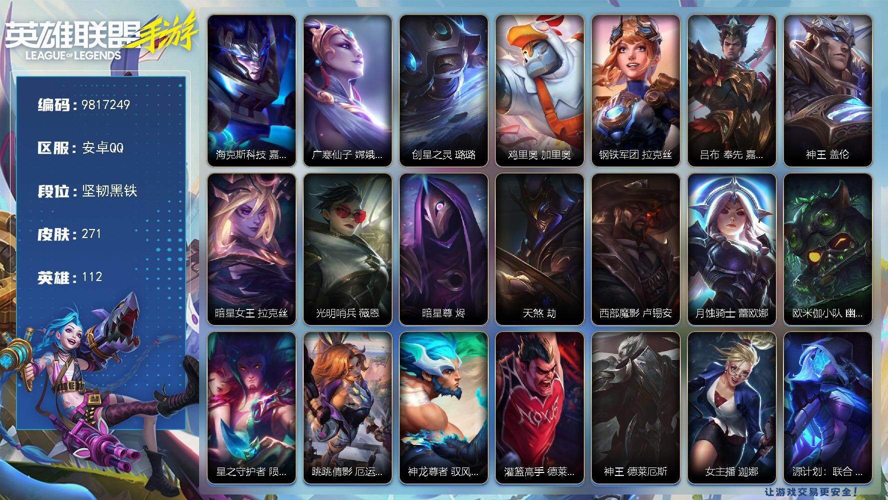 [14074533]【编号16855】【店长推荐精品号】112英雄-271皮肤 【神话皮肤】:海克斯科技 嘉文四世 【限定皮肤】:广寒仙子 嫦娥 黛安娜,创星之灵 璐璐,鸡里奥 加里奥,钢铁军团 拉克丝,吕布 奉先 嘉文四世 【传说皮肤】:神王 盖伦,暗星女王 拉克丝,光明哨兵 薇恩,暗星尊 烬,天煞 劫,西部魔影 卢锡安,月蚀骑士 蕾欧娜,欧米伽小队 幽灵特工 提莫,星之守护者 陨 洛,跳跳倩影 厄运小姐,神龙尊者 驭风啸龙 易,灌篮高手 德莱厄斯,神王 德莱厄斯,女主播 迦娜,源计划:联合 艾希,西部天使 艾希,地狱之门卫士 加里奥,未来战士 凯特琳,西部天使 赛娜 【史诗皮肤】:钢铁军团 盖伦,星之守护者 拉克丝,战斗学院 拉克丝,惊悚派对 阿木木,殇之机器人 阿木木,霸天战士 雷恩加尔,星域先知 卡尔玛,丧尸 努努和威朗普,暗星 奥莉安娜,泳池派对 奥莉安娜,腥红之月 黛安娜,无限烈焰 黛安娜,恶魔之刃 泰达米尔,猎龙勇士 赵信,暗星 卡兹克,清剿小队 金克丝,战斗校长 悠米,末路管家 布隆,猛虎 布隆,圣诞老人 布隆,源计划:升华 烬,腥红之月 烬,灭迹行者 烬,灰烬领主 奥瑞利安·索尔,腥红之月 崔斯特,未来战士 崔斯特,弹幕天使 卡莎,电玩女神 卡莎,k/da all out 卡莎,神龙尊者 玉境灵龙 卡莎,玉剑传说 苍鸾 莫甘娜,k/da all out 伊芙琳,猎龙勇士 潘森,清剿小队 潘森,未来战士 潘森,铁血女忍 阿卡丽,k/da all out 阿卡丽,源计划:暗影 阿卡丽,泳池派对 菲奥娜,玉剑传说 无双 菲奥娜,未来战士 菲奥娜,福牛守护者 菲奥娜,苹果机器人 布里茨,战场之王 布里茨,星之守护者 萨勒芬妮,灵魂莲华 亚索,k/da all out 阿狸,源计划:阴 劫,死亡誓约 劫,灵能特工 劫,武神 贾克斯,未来战士 卢锡安,源计划:山 蕾欧娜,欧米伽小队 魔鬼伞兵 崔丝塔娜,小恶魔 崔丝塔娜,大魔王 提莫,灵魂莲华 提莫,小蜜蜂 提莫,电玩女神 娑娜,泳池派对 璐璐,星之守护者 璐璐,创星之灵 璐璐,银河魔装机神 希瓦娜,破败军团 希瓦娜,源计划:裁决 蔚,炼狱魔女 蔚,燎原烈焰 蔚,暮星之羽 霞,晨星之翎 洛,太空律动 “百万调音” 格温,源代码 卡蜜尔,魔女 卡蜜尔,吕布 奉先 嘉文四世,暗星 嘉文四世,泳池派对 李青,地下拳王 李青,柯基 库奇