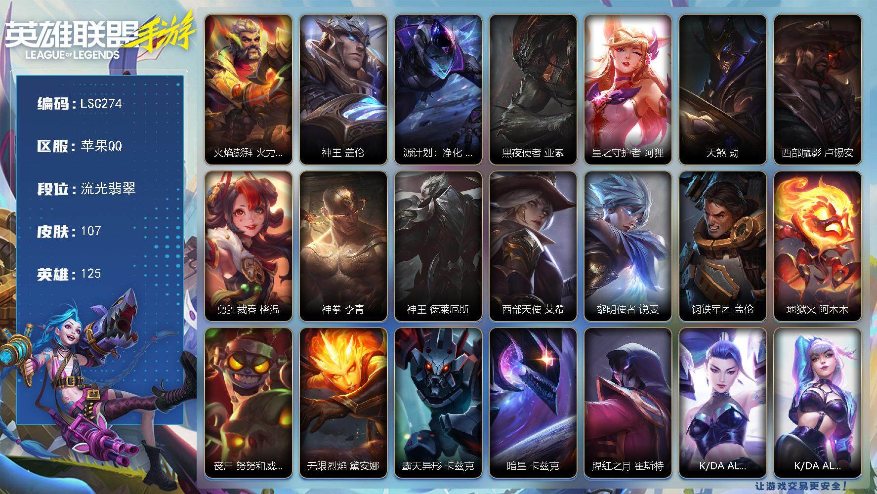 【lsc274】125英雄/107皮肤/1神话/11传说/37史诗/流光翡翠/火焰澎湃 火力全开 格雷福斯/神王 盖伦/源计划:净化 薇恩/黑夜使者 亚索/星之守护者 阿狸/天煞 劫/西部魔影 卢锡安/剪胜裁春 格温/神拳 李青/神王 德莱厄斯/西部天使 艾希/黎明使者 锐雯/钢铁军团 盖伦/地狱火 阿木木/丧尸 努努和威朗普/无限烈焰 黛安娜/霸天异形 卡兹克/暗星 卡兹克/腥红之月 崔斯特/k/da all out 卡莎/k/da all out 伊芙琳/猎龙勇士 潘森/清剿小队 潘森/铁血女忍 阿卡丽/福牛守护者 安妮/死亡誓约 劫/灵能特工 劫/娜就去看看 崔丝塔娜/寒冬精灵 璐璐/源计划:裁决 蔚/晨星之翎 洛/暗星 嘉文四世/福牛守护者 嘉文四世/地下拳王 李青/柯基 库奇/梦境绅探 凯南/福牛守护者 德莱厄斯/泳池派对 格雷福斯/战斗教授 格雷福斯/绝命机甲 格雷福斯/玉剑传说 风仙子 迦娜/破败军团 德莱文/福牛守护者 阿利斯塔/绒毛 菲兹/玉剑传说 武剑仙 锐雯/白色死神 韦鲁斯/暗星 韦鲁斯/秘旅探索者 加里奥/欧米伽小队 天雷爆破手 维迦/s1光耀之刃/s2光耀之芒/s3光耀之灵/s4光耀之心/s5绯金魅影/s6绯金丽刃/s7绯金战斧/s8绯金鮫灵/s9王牌舰长/s11王牌勇将/s12龙冕先锋/s15龙冕异士/s16冠翎飞行员/s17冠翎御风使/s18冠翎巨神像/s19冠翎征服者/海上霸主 盖伦/游侠法师 拉克丝/暗黑武士 雷恩加尔/脏兮兮 努努和威朗普/时之砂 艾克/光耀之心 奥莉安娜/光耀之刃 泰达米尔/龙冕先锋 赵信/死亡绽放 卡兹克/光耀之芒 金克丝/双城之战 金克丝/猎龙勇士 布隆/龙冕异士 烬/探戈灵魂 崔斯特/王牌舰长 崔斯特/冠翎征服者 尼菈/绯金魅影 伊芙琳/银色之牙 阿卡丽/绯金丽刃 菲奥娜/兔宝宝 布里茨/腥红之月 亚索/冲击之刃 劫/宗师级钓鱼训练师 贾克斯/游击队员 崔丝塔娜/兔宝宝 提莫/熊猫 提莫/邪恶女巫 璐璐/光耀之灵 璐璐/冰霜亚龙 希瓦娜/黯黑魔龙 希瓦娜/铁拳执事 蔚/女警官 蔚/双城之战 蔚/冠翎飞行员 库奇/刺客信条 凯南/战争血统 蒙多医生/制胜金球 拉莫斯/西部牛仔 厄运小姐/末路教父 格雷福斯/冠翎御风使 迦娜/德莱德莱 德莱文/绯金战斧 德莱文/女皇 艾希/兔宝宝 菲兹/飞车暴走族 古拉加斯/碎桶者 古拉加斯/绯金鲛灵 娜美/苍穹之光 韦鲁斯/冲浪高手 辛吉德/蕉泥座人 索拉卡/光执事 伊泽瑞尔/冠翎巨神像 加里奥/黑暗骑士 奥拉夫/王牌勇将 奥拉夫/铁血狙击手 凯特琳/腥红之月 鬼武者 慎/黑暗骑士 布兰德/鳄霸 雷克顿