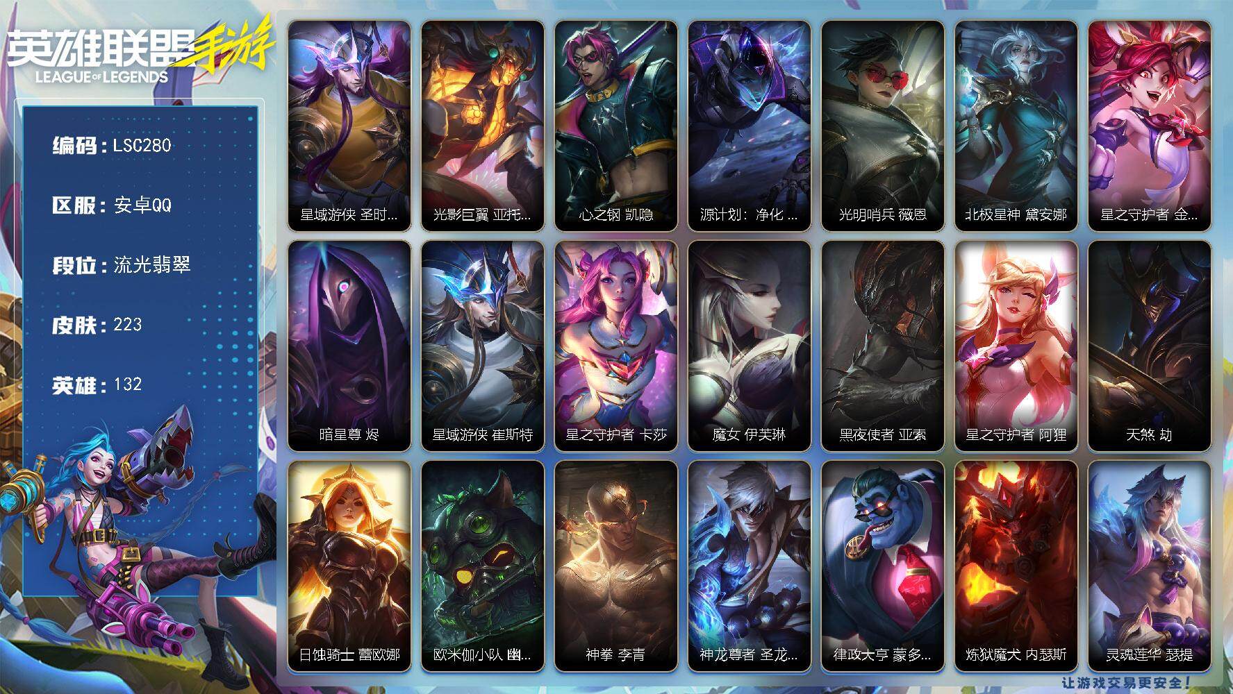 【lsc280】132英雄/223皮肤/流光翡翠/星域游侠 圣时豪杰 崔斯特/光影巨翼 亚托克斯/心之钢 凯隐/源计划:净化 薇恩/光明哨兵 薇恩/北极星神 黛安娜/星之守护者 金克丝/暗星尊 烬/星域游侠 崔斯特/星之守护者 卡莎/魔女 伊芙琳/黑夜使者 亚索/星之守护者 阿狸/天煞 劫/日蚀骑士 蕾欧娜/欧米伽小队 幽灵特工 提莫/神拳 李青/神龙尊者 圣龙 李青/律政大亨 蒙多医生/炼狱魔犬 内瑟斯/灵魂莲华 瑟提/黎明使者 永恩/源计划:林 易/神龙尊者 驭风啸龙 易/灌篮高手 德莱厄斯/神王 德莱厄斯/西部天使 艾希/黎明使者 锐雯/战斗学院 伊泽瑞尔/地狱之门卫士 加里奥/斗魂觉醒 莎弥拉/源计划:泯灭 雷克顿/最终boss 维迦/源计划:毁灭 派克/星之守护者 拉克丝/战斗学院 拉克丝/劲道美味 阿木木/摄魂猎手 凯隐/霸天战士 雷恩加尔/雷喵喵尔 雷恩加尔/星域先知 卡尔玛/丧尸 努努和威朗普/太空律动 “舞林双子” 努努和威朗普/小蜜蜂 努努和威朗普/地狱行者 孙悟空/探梦奇旅 艾克/泳池派对 奥莉安娜/星之守护者 奥莉安娜/霸天异形 卡兹克/暗星 卡兹克/猎梦吞噬者 卡兹克/喵喵魅影金克丝/烘焙童谣 悠米/末路管家 布隆/猛虎 布隆/圣诞老人 布隆/礼物选好了吗? 布隆/西部牛仔 烬/灭迹行者 烬/灰烬领主 奥瑞利安·索尔/东恒之曜 奥瑞利安·索尔/腥红之月 崔斯特/斗魂无双 尼菈/魅惑女巫 莫甘娜/猎龙勇士 潘森/源计划:暗影 阿卡丽/源计划:火 菲奥娜/玉剑传说 无双 菲奥娜/苹果机器人 布里茨/银河魔装机神 安妮/战场之王 亚索/幻梦甜心 阿狸/源计划:阴 劫/死亡誓约 劫/灵能特工 劫/武神 贾克斯/秘旅探索者 贾克斯/屠龙勇士 凯尔/泳池派对 蕾欧娜/小恶魔 崔丝塔娜/大魔王 提莫/小蜜蜂 提莫/驯龙女巫 璐璐/寒冬精灵 璐璐/银河魔装机神 希瓦娜/破败军团 希瓦娜/燎原烈焰 蔚/暮星之羽 霞/永恒之森 霞/永恒之森 洛/太空律动 “百万调音” 格温/源代码 卡蜜尔/魔女 卡蜜尔/星域审判官 卡蜜尔/柯基 库奇/奈落之炎 凯南/梦境绅探 凯南/冰封王子 蒙多医生/电玩女神 厄运小姐/持胡萝卜的雪人 易/西部魔影 德莱厄斯/禁卫机甲 格雷福斯/战斗教授 格雷福斯/绝命机甲 格雷福斯/星之守护者 迦娜/破败军团 德莱文/斗魂无双 德莱文/冰川巨兽 墨菲特/暗星 墨菲特/绒毛 菲兹/奥术大师 吉格斯/玉剑传说 寒潭夭夭 娜美/白色死神 韦鲁斯/光明哨兵 艾瑞莉娅/死亡誓约 卡特琳娜/源代码 索拉卡/星之守护者 伊泽瑞尔/地狱火 加里奥/神龙守卫 加里奥/神奇先驱 杰斯/灵能特工 莎弥拉/猎龙勇士 奥拉夫/光明哨兵 奥拉夫/苍穹之光 布兰德/我,怒角 维迦/冰糖葫芦 维迦/梦境灵探 赛娜/怨之砂 派克/未来战士 锤石/盗梦暗影 锤石/古神 沃里克/宇航员 诺提勒斯/黑夜使者 莉莉娅/魅惑女巫 薇古丝/s1光耀之刃/s2光耀之芒/s3光耀之灵/s4光耀之心/s5绯金魅影/s6绯金丽刃/s7绯金战斧/s8绯金鮫灵/s9王牌舰长/s10王牌上将/s11王牌勇将/s11王牌司令/s12龙冕先锋/s13龙冕御盾/s14龙冕神策/s15龙冕异士/s16冠翎飞行员/s17冠翎御风使/s18冠翎巨神像/s19冠翎征服者/死亡骑士 盖伦/海上霸主 盖伦/游侠法师 拉克丝/小小骑士 阿木木/暗黑武士 雷恩加尔/脏兮兮 努努和威朗普/三昧真火 孙悟空/斗战胜佛 孙悟空/苍穹之光 薇恩/猎龙勇士 薇恩/时之砂 艾克/光耀之心 奥莉安娜/国王 泰达米尔/光耀之刃 泰达米尔/秘密特工 赵信/龙冕先锋 赵信/末路狂花 金克丝/光耀之芒 金克丝/猎龙勇士 布隆/狮心 布隆/龙冕御盾 布隆/龙冕异士 烬/探戈灵魂 崔斯特/王牌舰长 崔斯特/冠翎征服者 尼菈/刀锋女王 莫甘娜/绯金魅影 伊芙琳/皇家守卫 菲奥娜/绯金丽刃 菲奥娜/擂台皇帝 布里茨/小红帽 安妮/西部牛仔 亚索/偶像歌手 阿狸/绝命呛手 卢锡安/烧烤女神 蕾欧娜/游击队员 崔丝塔娜/光耀之灵 璐璐/黯黑魔龙 希瓦娜/铁拳执事 蔚/女警官 蔚/孤胆英豪 嘉文四世/王牌上将 嘉文四世/至高之拳 李青/海牛骑手 库奇/冠翎飞行员 库奇/刺客信条 凯南/腥红之月 凯南/超级英雄 凯南/泳池派对 蒙多医生/战争血统 蒙多医生/制胜金球 拉莫斯/创世魔神 内瑟斯/西部牛仔 厄运小姐/热血班长 德莱厄斯/末路教父 格雷福斯/黑暗骑士 格雷福斯/冠翎御风使 迦娜/德莱德莱 德莱文/绯金战斧 德莱文/女皇 艾希/黑暗骑士 艾希/王牌司令 艾希/哞利斯塔 阿利斯塔/黑暗骑士 阿利斯塔/黑曜石守护者 墨菲特/科学狂人 吉格斯/龙冕神策 吉格斯/飞车暴走族 古拉加斯/碎桶者 古拉加斯/鲛妮座人 娜美/绯金鲛灵 娜美/苍穹之光 韦鲁斯/冰霜之刃 艾瑞莉娅/莲花之令 艾瑞莉娅/海贼魅影 卡特琳娜/风执事 加里奥/冠翎巨神像 加里奥/先驱行者 卡萨丁/铁哥们儿 奥拉夫/王牌勇将 奥拉夫/铁血狙击手 凯特琳/腥红之月 鬼武者 慎/黑暗骑士 布兰德/枯萎之壤 雷克顿/鳄霸 雷克顿/穿着正装的恶魔 维迦/战争机器 赛恩/南瓜头 费德提克