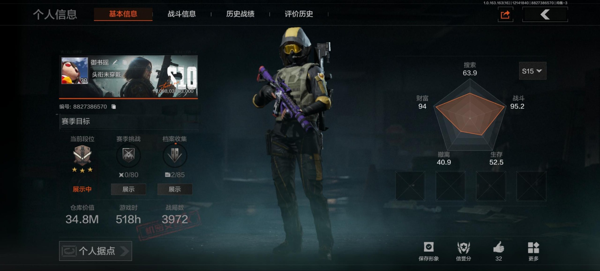 库存价值106.3 1近战武器 可修改实名 【柯恩币数量】:3213 【近战武器】:工兵铲 【紫色呛皮】:战术大师·ace31竞技·mdr猩红羽翼·vss鱼跃丹青·qbu191竞技·aug旗帜脉冲·m110旗帜脉冲·usas12骑士之剑·scar-l骑士之剑·t03骑士之剑·a