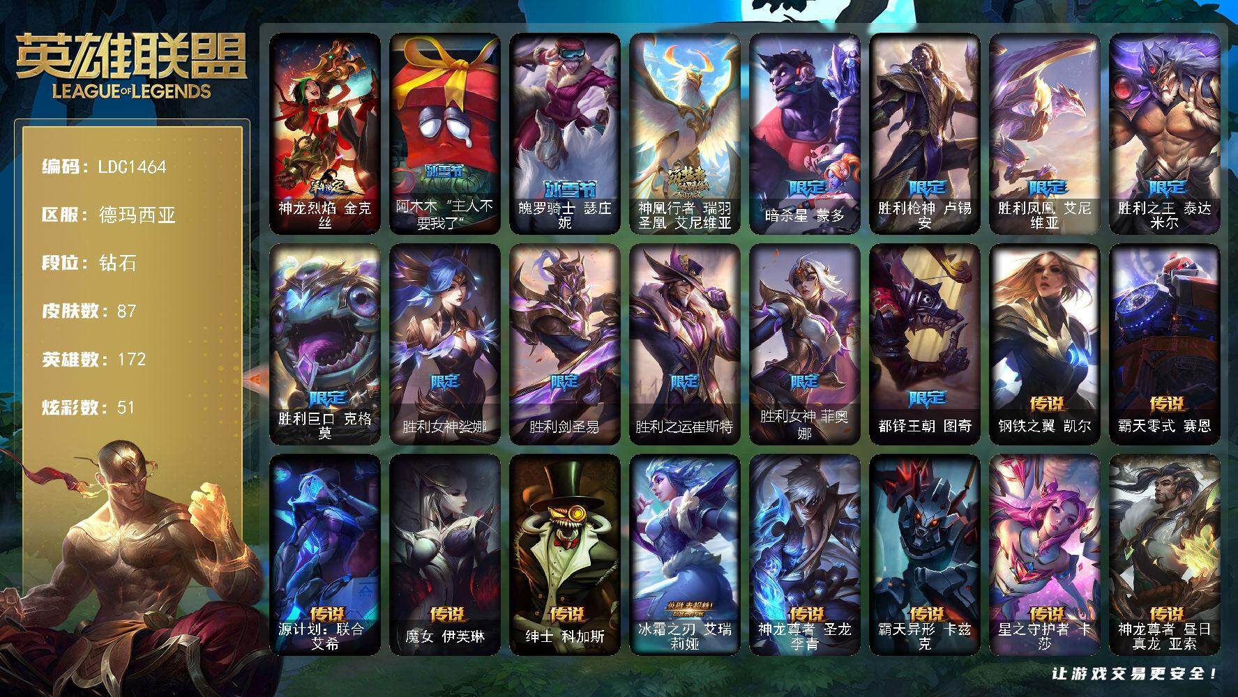 [14587250]1终极 5神话 69限定 52传说 126史诗 508皮肤 107炫彩 171英雄 可二次 可修改实名 【至臻】:至臻 玉剑传说 武剑仙 【海克斯】:海克斯 卡萨丁海克斯 雷克顿 【限定】:斩星魔剑 易创星之灵 璐璐养蜂人 辛吉德 【情人节限定】:甜心之翎 洛 【赛季限定皮】:胜利凤凰 艾尼维亚胜利之运 崔斯特 【冠军限定系列】:s1fnc 酒桶s1fnc 嘉文四世s1fnc 卡尔萨斯s1fnc 库奇s2 暗杀星 蒙多s2 暗杀星 努努s3 skt t1 婕拉s4 ssw 图奇s4 ssw 炼金s5 skt t1 滑板鞋s6 skt t1 娜美s7 ssg 纳尔 【冰雪节限定】:冰雪节 辛吉德持胡萝卜的雪人 易寒冬精灵 璐璐平安夜女神 娑娜圣诞开心鬼 提莫圣诞精灵 崔丝塔娜圣诞糖果棒 厄运小姐圣诞驯鹿 克格莫邪恶圣诞老人 维迦雪默丁格雪装 奈德丽英勇玩具兵 普朗克狂心冰王 图奇 【泳池派对】:泳池派对 蕾欧娜泳池派对 厄运小姐泳池派对 菲奥娜泳池派对 凯特琳 【万圣节限定】:鬼影森森 茂凯鬼影重重 魔腾魅惑女巫 迦娜魅惑女巫 莫甘娜南瓜头 费德提克无头骑士 赫卡里姆 【年限】:龙的传人 李青“你看见过我的熊猫吗?” 安妮神龙之翼 库奇神龙烈焰 金克丝南天之怒 沃里克北辰之威 内瑟斯王国机神玄武 盖伦福牛守护者 安妮福牛守护者 德莱厄斯 【周年】:3周年 厄运小姐7周年 泰隆10周年 安妮10周年 凤凰 【其他限定/神话皮】:外星装甲 库奇暗影 沃里克波比的巧克力工坊夺命美人 卡特琳娜防暴士兵 辛吉德钢铁之翼 艾尼维亚冠军掠夺者 卡兹克冠军之矛 卡莉丝塔冠军之血 希瓦娜警用试作体k-9 内瑟斯密林猎手 提莫送披萨的小姐姐 希维尔糖果使徒 费德提克野兽猎人 瑟庄妮野兽猎人 泰达米尔勇者 阿狸制胜金靴 李青
