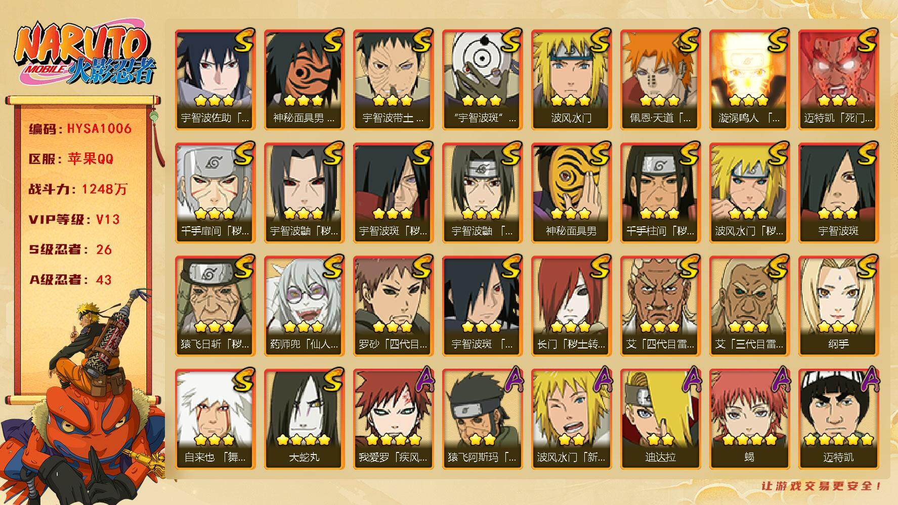 【hysa1006】v13/战力1248w/s忍26/a忍43/通灵兽21/秽土斑/新春水门/纲手/达鲁伊/止水/5星猿飞阿斯玛/宇智波斑/秽土日斩/照美冥/秽土阿斯玛/5星迈特凯/忍战奇拉比/秽土扉间/忍者之路面具男/秽土罗砂/仙人兜/百豪樱/白面具/死门凯/漂泊六道/暴怒带土/博人传黑土/天道超/秽土迪达拉/2星纲手「妖怪奇谭」/3星飞段「死司凭血」/永恒万花筒佐助/迪达拉/4星我爱罗「疾