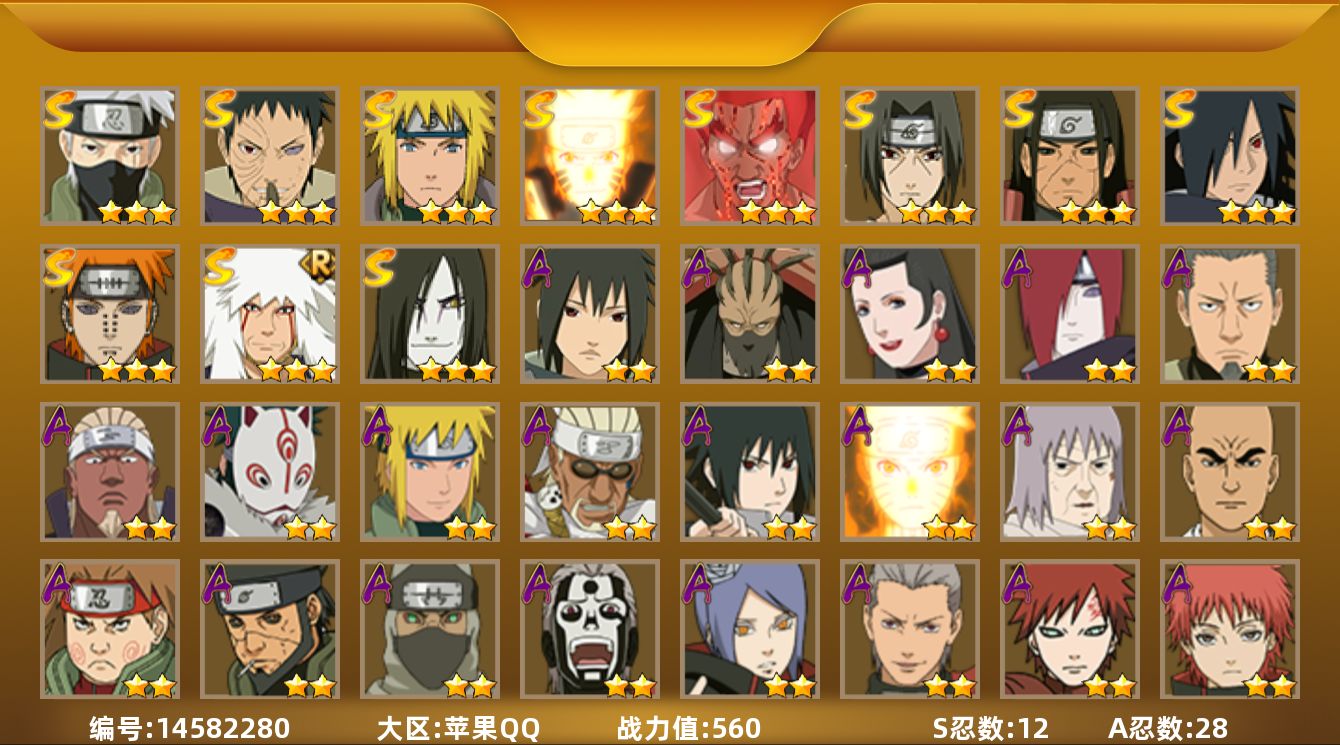 [14582280]v10560w战力,12s级忍者数-28a级忍者数,me1887 【s级忍者】:千手柱间「秽土转生」3星,宇智波带土「忍界大战」3星,宇智波鼬「须佐能乎」3星,旗木卡卡西「须佐能乎」3星,宇智波斑「木叶创立」3星,自来也「舞之豪杰」3星,大蛇丸3星,自来也「传说中的三忍」3星,波风水门3星,漩涡鸣人「九喇嘛连结」3星,迈特凯「死门」3星,佩恩「天道」3星 【a级忍者】:艾「青年」2星,三船「青年」2星,长门「青年」2星,波风水门「青年」2星,达鲁伊「博人传」2星,奇拉比「忍界大战」2星,飞段3星,飞段「死司凭血」2星,干柿鬼鲛5星,漩涡鸣人「九尾查克拉」2星,迈特凯5星,桃地再不斩「秽土转生」2星,我爱罗「疾风传」3星,蝎3星,蝎「绯流琥」2星,小南2星,角都「地怨虞」2星,猿飞阿斯玛5星,猿飞阿斯玛「秽土转生」2星,宇智波鼬2星,宇智波佐助「须佐能乎」2星,神秘面具男「忍者之路」2星,黑土「博人传」2星,秋道丁次「忍界大战」2星,千代「近松十人卫」2星,不缘2星,地陆2星,宇智波泉奈2星