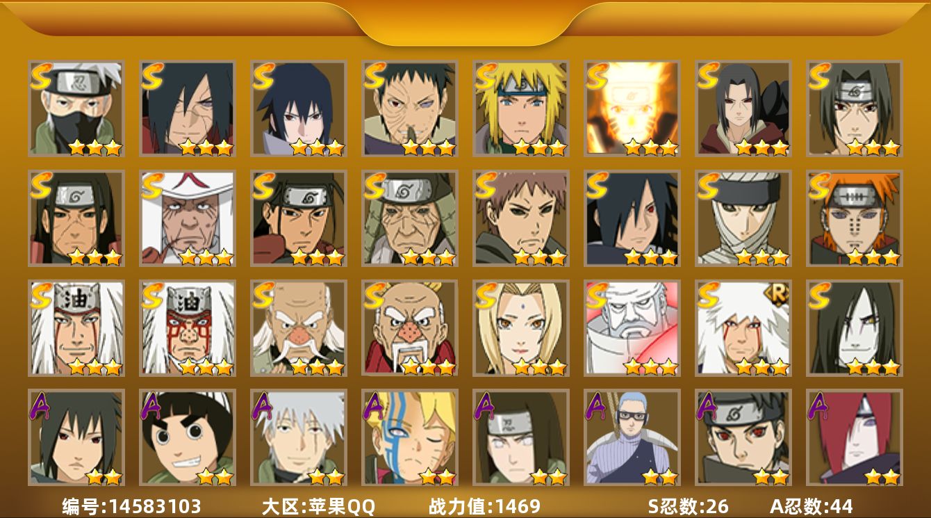 [14583103]v121469w战力,26s级忍者数-44a级忍者数,4.6w金币,350点券,34高招券,me1889 【s级忍者】:猿飞日斩「秽土转生」3星,千手柱间「秽土转生」3星,宇智波鼬「秽土转生」3星,宇智波斑「秽土转生·解」3星,大野木「忍界大战」3星,宇智波带土「忍界大战」3星,宇智波鼬「须佐能乎」3星,旗木卡卡西「须佐能乎」3星,宇智波斑「木叶创立」3星,无「二代目土影」3星,罗砂「四代目风影」3星,大野木「三代目土影」3星,烈斗「初代目风影」3星,自来也3星,自来也「仙人模式」3星,自来也「舞之豪杰」3星,大蛇丸3星,纲手3星,千手柱间3星,猿飞日斩5星,波风水门3星,漩涡鸣人「九喇嘛连结」3星,佩恩「天道」3星,宇智波佐助「永恒万花筒」3星,大筒木金式3星,波风水门「九喇嘛连结」3星 【a级忍者】:艾「青年」2星,长门「青年」2星,波风水门「青年」2星,达鲁伊「博人传」2星,迪达拉2星,大蛇丸「晓」2星,奇拉比2星,奇拉比「忍界大战」2星,飞段3星,飞段「死司凭血」2星,干柿鬼鲛5星,漩涡博人「桃式显现」2星,漩涡鸣人「仙人模式」2星,漩涡鸣人「九尾查克拉」2星,机械鸣人「初始形态」2星,迈特凯5星,旗木卡卡西「忍界大战」2星,旗木卡卡西「幻之真容」2星,桃地再不斩「秽土转生」2星,我爱罗「疾风传」3星,蝎5星,蝎「百机操演」2星,小南「夏日泳装」2星,角都「地怨虞」2星,猿飞阿斯玛5星,宇智波止水2星,宇智波鼬2星,宇智波佐助「万花筒写轮眼」2星,照美冥「五代目水影」2星,日向宁次「忍界大战」2星,长十郎「六代目水影」2星,卑留呼「火之意志继承者」2星,神秘面具男「忍者之路」2星,佩恩·六道「漂泊浪客」2星,李洛克「忍界大战」2星,猿飞木叶丸「博人传」2星,黑土「夏日限定」2星,黑土「博人传」2星,秋道丁次「忍界大战」2星,千代「近松十人卫」2星,神农「羁绊」2星,土台「忍界大战」3星,宇智波泉奈2星,迈特凯「青春爆炸」2星