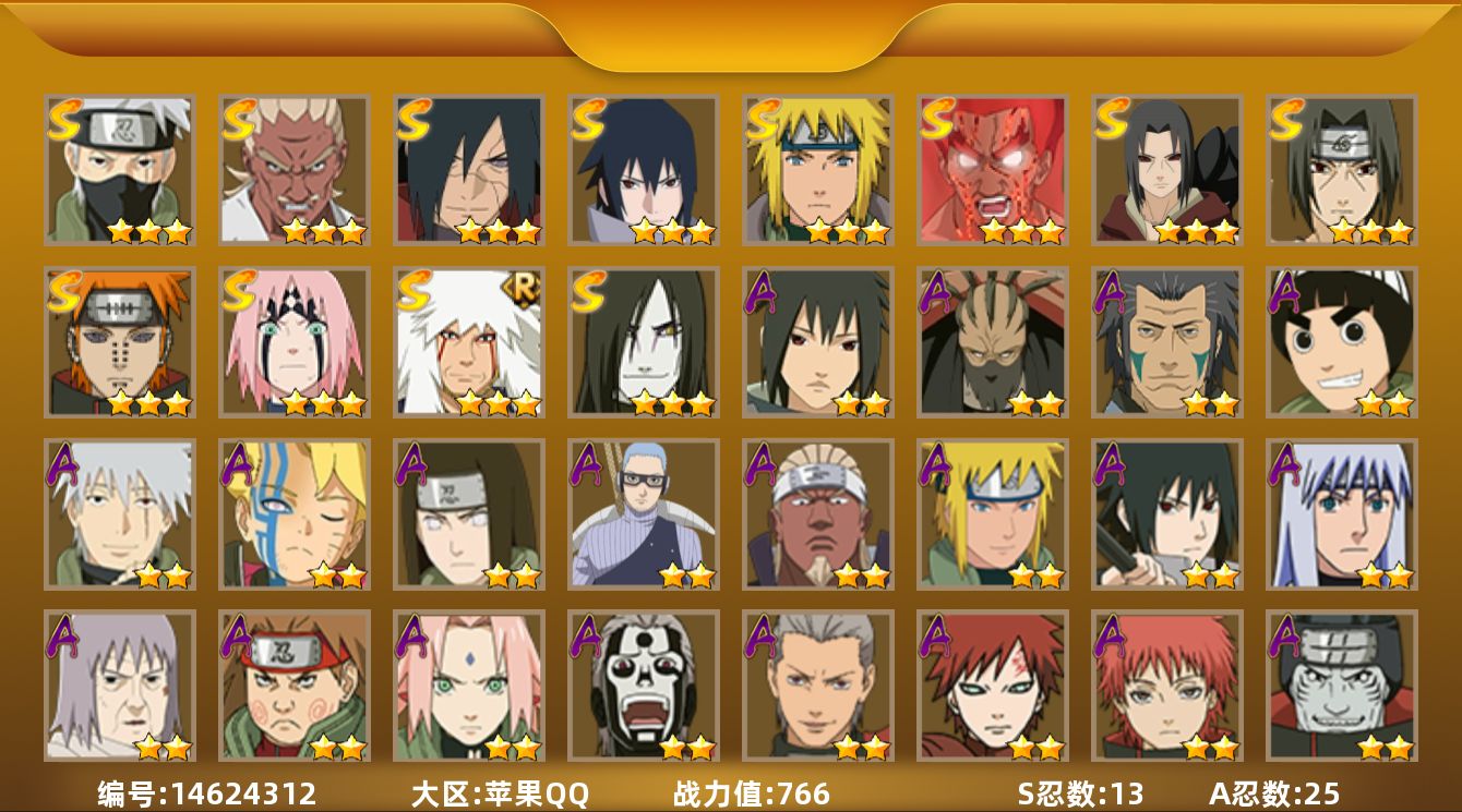 [14624372]v11 10s忍 36a忍 17通灵 718.4w战力 可二次 可修改实名 【s级忍者】:宇智波斑「秽土转生·解」宇智波佐助「永恒万花筒」春野樱 「忍界大战」漩涡鸣人 「九喇嘛连结」自来也 「舞之豪杰」旗木卡卡西「须佐能乎」大筒木舍人 「最终章」宇智波鼬 「须佐能