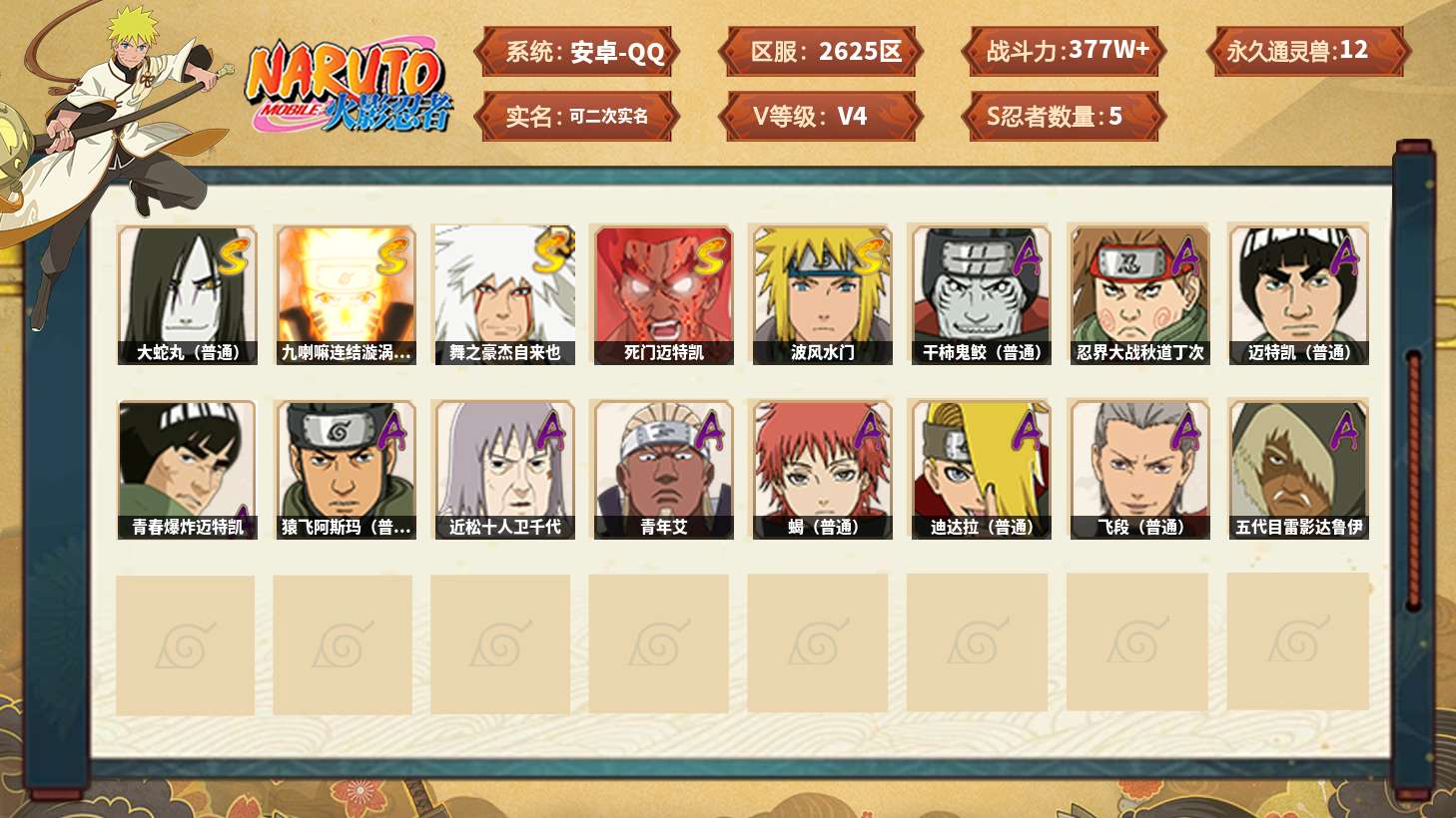 【火影忍者】【lyhy9345】战斗力:377w;段位:暗部1阶;本服排名:2090;vip:v4级;s忍:5个;a忍:11个;通灵兽:12个,s忍:大蛇丸(普通) 4星|九喇嘛连结漩涡鸣人|舞之豪杰自来也|死门迈特凯|波风水门__a忍:干柿鬼鲛(普通) 3星|忍界大战秋道丁次|迈特凯(普通)|青春爆炸迈特凯|猿飞阿斯玛(普通)|近松十人卫千代|青年艾|蝎(普通)|迪达拉(普通)|飞段(普通)|五代目雷影达鲁伊__通灵兽:忍犬(普通)|蓝蛇|蛤蟆吉|忍龟|镰鼬|猿魔|山椒鱼|蜃|蛤蟆仙人|鲛鲨|砂之守鹤|蛤蟆健