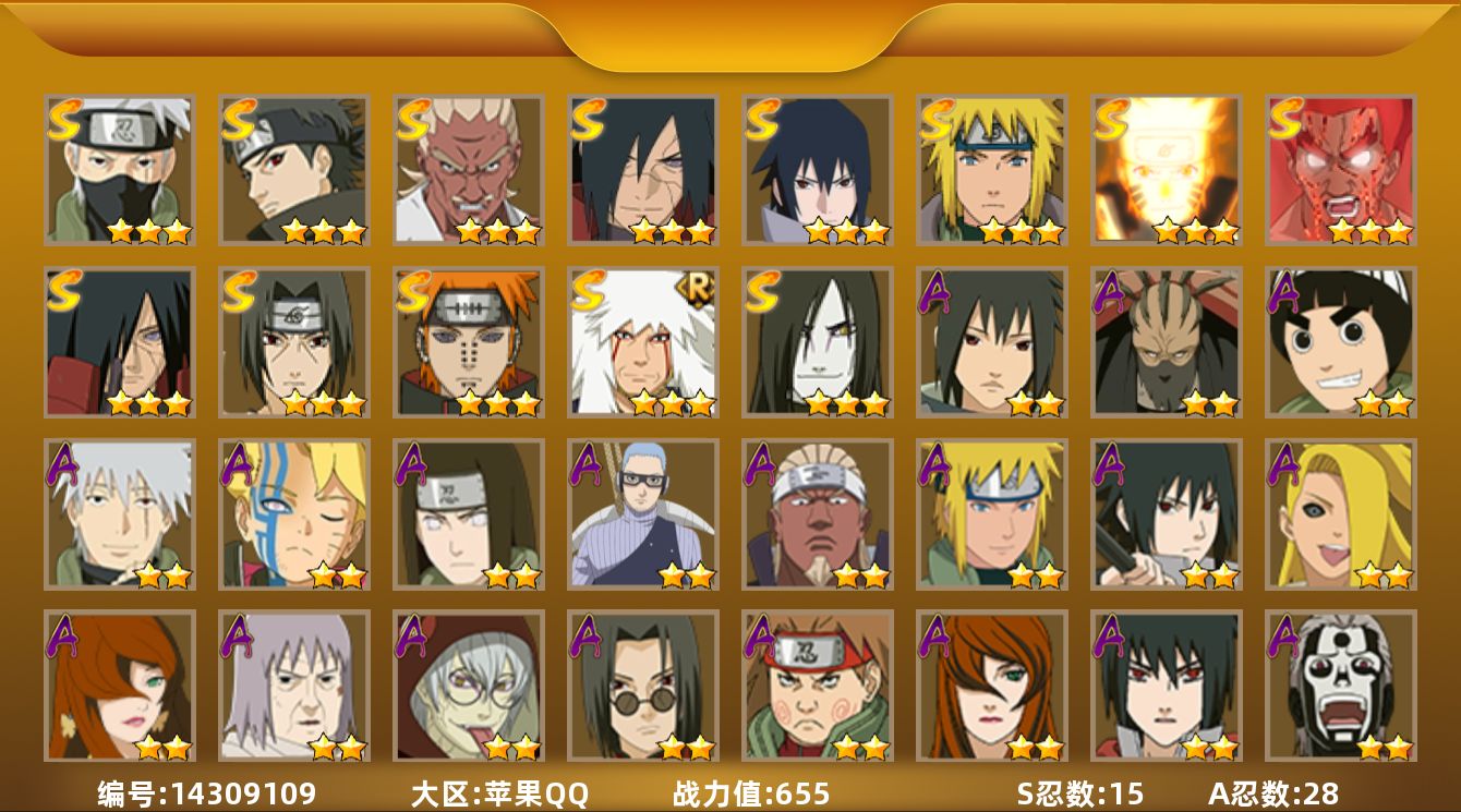 [14309109]v9 15s 28a 655w战力 创立柱间92片 4546金币 21张招募券 yy1432 【s级忍者】:宇智波斑「秽土转生」3星,宇智波斑「秽土转生·解」3星,艾「忍界大战」3星,宇智波鼬「须佐能乎」3星,宇智波止水「须佐能乎」3星,旗木卡卡西「须佐能乎」3星,自来也「舞之豪杰」3星,大蛇丸3星,自来也「传说中的三忍」3星,波风水门3星,漩涡鸣人「九喇嘛连结」3星,迈特凯「死门」3星,佩恩「天道」3星,宇智波佐助「永恒万花筒」3星,漩涡鸣人「暴怒·第六尾」3星 【a级忍者】:艾「青年」2星,波风水门「青年」2星,迪达拉2星,迪达拉「秽土转生」2星,飞段3星,飞段「死司凭血」2星,干柿鬼鲛3星,漩涡博人「桃式显现」2星,迈特凯3星,旗木卡卡西「幻之真容」2星,我爱罗「疾风传」3星,蝎2星,蝎「绯流琥」2星,猿飞阿斯玛3星,宇智波鼬2星,宇智波鼬「新春限定」2星,宇智波佐助「须佐能乎」2星,宇智波佐助「万花筒写轮眼」2星,药师兜「半蛇斗篷」2星,照美冥「夏日泳装」2星,照美冥「五代目水影」2星,日向宁次「忍界大战」2星,长十郎「六代目水影」2星,李洛克「忍界大战」2星,秋道丁次「忍界大战」2星,千代「近松十人卫」2星,神农「羁绊」2星,宇智波泉奈2星