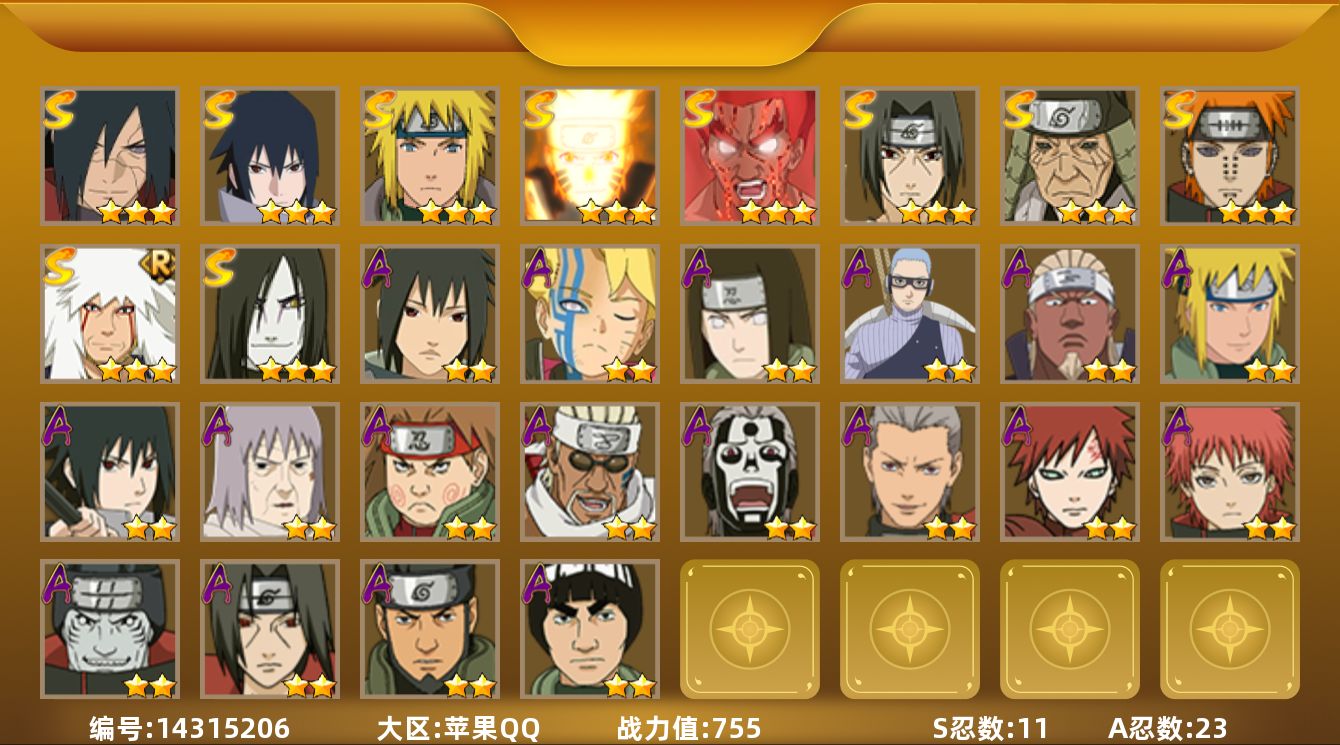 [14315206]v7 11s 23a 755w战力 2852金币 yy1453 【s级忍者】:猿飞日斩「秽土转生」3星,宇智波斑「秽土转生·解」3星,宇智波鼬「须佐能乎」3星,自来也「舞之豪杰」3星,大蛇丸3星,自来也「传说中的三忍」3星,波风水门3星,漩涡鸣人「九喇嘛连结」3星,迈特凯「死门」3星,佩恩「天道」3星,宇智波佐助「永恒万花筒」3星 【a级忍者】:艾「青年」2星,波风水门「青年」2星,达鲁伊「博人传」2星,奇拉比2星,飞段3星,飞段「死司凭血」2星,干柿鬼鲛5星,漩涡博人「桃式显现」2星,迈特凯5星,桃地再不斩「秽土转生」2星,我爱罗「疾风传」2星,蝎2星,猿飞阿斯玛5星,宇智波鼬2星,宇智波佐助「须佐能乎」2星,宇智波佐助「侠隐江湖」2星,日向宁次「忍界大战」2星,长十郎「六代目水影」2星,黑土「博人传」2星,秋道丁次「忍界大战」2星,千代「近松十人卫」2星,神农「羁绊」2星,宇智波泉奈2星