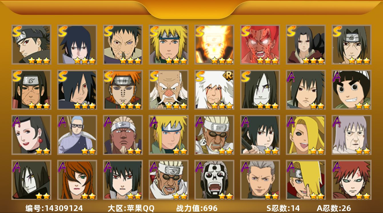 [14309124]v10 14s 26a 696万战力 4000金币 有熊猫 斑77片 白面具73片 zp3214 【s级忍者】:千手柱间「秽土转生」3星,宇智波鼬「秽土转生」3星,大野木「忍界大战」3星,宇智波带土「忍界大战」3星,宇智波鼬「须佐能乎」3星,宇智波止水「须佐能乎」3星,宇智波斑「木叶创立」3星,自来也「舞之豪杰」3星,大蛇丸3星,波风水门3星,漩涡鸣人「九喇嘛连结」3星,迈特凯「死门」3星,佩恩「天道」3星,宇智波佐助「永恒万花筒」3星 【a级忍者】:艾「青年」2星,波风水门「青年」2星,达鲁伊「博人传」2星,迪达拉2星,迪达拉「秽土转生」2星,大蛇丸「晓」2星,奇拉比2星,奇拉比「忍界大战」2星,飞段3星,飞段「死司凭血」2星,干柿鬼鲛4星,迈特凯4星,我爱罗「疾风传」3星,蝎2星,猿飞阿斯玛4星,宇智波鼬2星,宇智波佐助「须佐能乎」2星,宇智波佐助「万花筒写轮眼」2星,照美冥「五代目水影」2星,宇智波带土「漂泊浪客」2星,长十郎「六代目水影」2星,李洛克「忍界大战」2星,千代「近松十人卫」2星,神农「羁绊」2星,不缘2星,宇智波泉奈2星