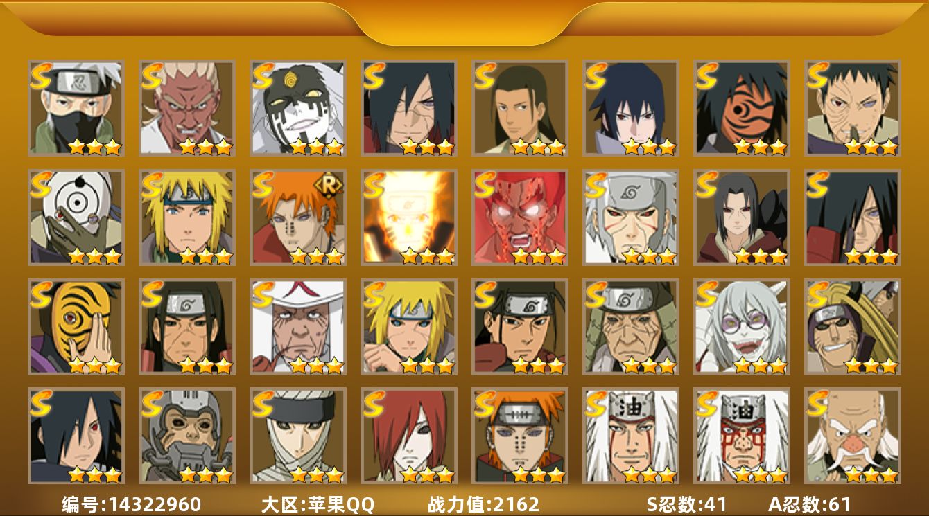 [14322960]v14 2162万战力 41s-61a 金币1.2万 高招95 有1传承奥义图 有熊猫 百豪纲手50片 九喇嘛水门62片 止水40片鬼灯幻月97片 舍人55片 ll4827 【s级忍者】:长门「秽土转生」3星,半藏「秽土转生」3星,金角·银角「秽土转生」3星,猿飞日斩「秽土转生」3星,波风水门「秽土转生」3星,千手扉间「秽土转生」3星,千手柱间「秽土转生」3星,宇智波鼬「秽土转生」3星,宇智波斑「秽土转生」3星,宇智波斑「秽土转生·解」3星,大野木「忍界大战」3星,春野樱「忍界大战」3星,宇智波带土「忍界大战」3星,艾「忍界大战」3星,宇智波鼬「须佐能乎」4星,旗木卡卡西「须佐能乎」3星,宇智波斑「木叶创立」3星,千手柱间「木叶创立」3星,无「二代目土影」3星,大野木「三代目土影」3星,艾「三代目雷影」3星,自来也3星,自来也「仙人模式」3星,自来也「舞之豪杰」3星,大蛇丸4星,纲手5星,千手柱间3星,猿飞日斩5星,波风水门4星,药师兜「仙人模式」3星,神秘面具男3星,神秘面具男「红夜之刃」3星,漩涡鸣人「九喇嘛连结」3星,迈特凯「死门」3星,佩恩「天道」3星,佩恩·天道「超」3星,宇智波佐助「永恒万花筒」3星,宇智波斑 「白面具」3星宇智波斑「白面具」,大筒木金式3星,大筒木桃式3星,漩涡鸣人「暴怒·第六尾」3星 【a级忍者】:艾「青年」2星,长门「青年」2星,波风水门「青年」2星,波风水门「新春限定」2星,达鲁伊「博人传」2星,迪达拉2星,迪达拉「秽土转生」2星,大蛇丸「晓」2星,奇拉比2星,奇拉比「忍界大战」2星,飞段4星,飞段「死司凭血」5星,飞段「晓创生」2星,飞段「恶灵之影」2星,干柿鬼鲛5星,漩涡博人「桃式显现」2星,漩涡鸣人「仙人模式」2星,漩涡鸣人「九尾查克拉」2星,迈特凯5星,迈特凯「忍界大战」2星,旗木卡卡西2星,旗木卡卡西「万花筒写轮眼」2星,桃地再不斩「漂泊武士」2星,桃地再不斩「秽土转生」2星,我爱罗「疾风传」4星,我爱罗「忍界大战」2星,蝎5星,小南2星,小南「新