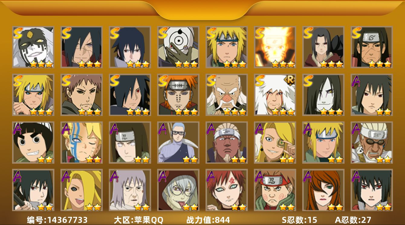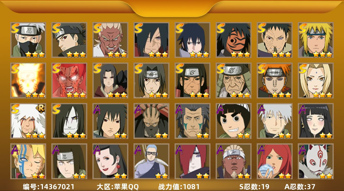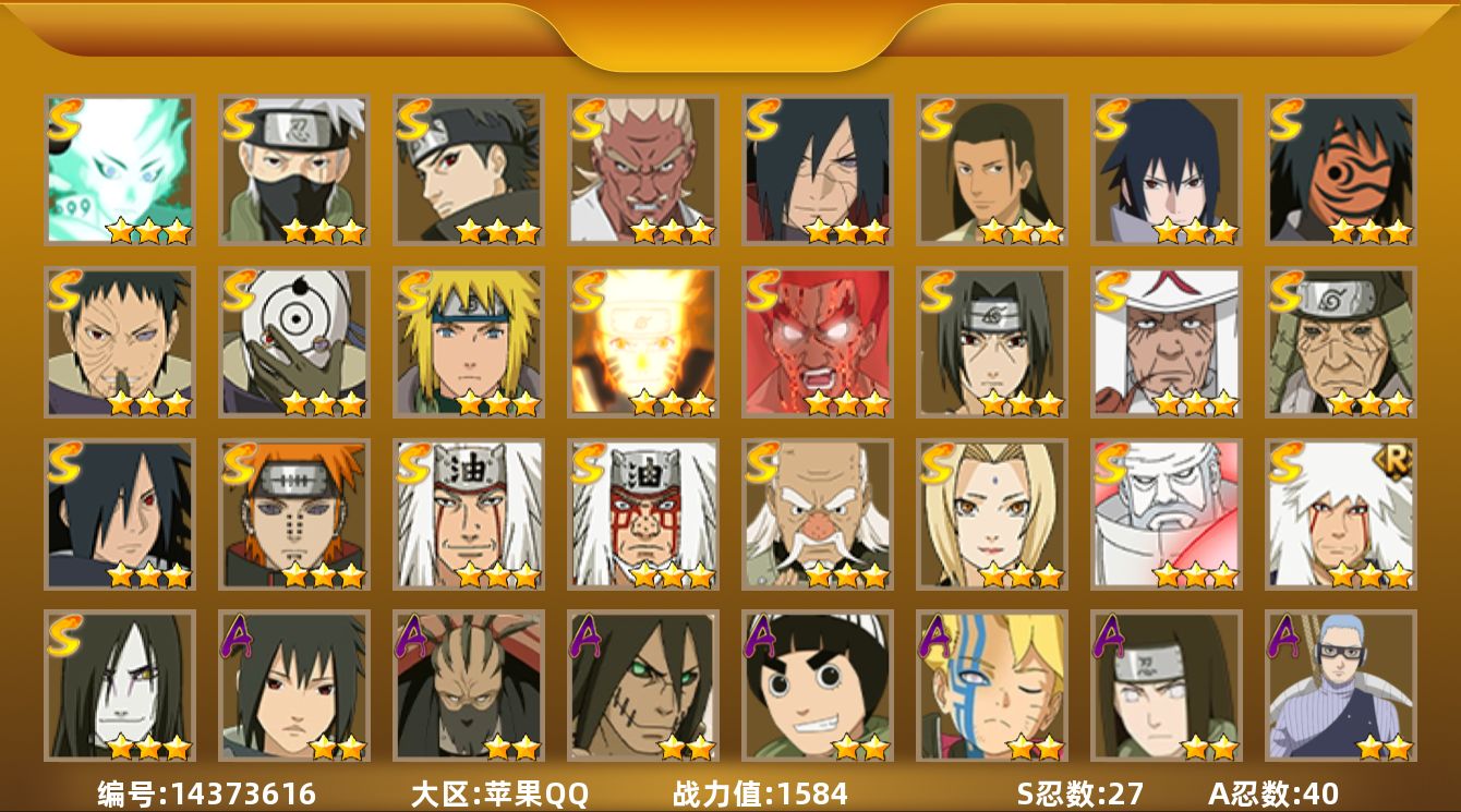 [14339420]v9,811w战力,17s级忍者数-36a级忍者数,金水门81片,传说自来也80片,金角银角61片,最终章舍人80片,me1786 【s级忍者】:波风水门「秽土转生」3星,千手扉间「秽土转生」3星,宇智波鼬「秽土转生」3星,宇智波斑「秽土转生」3星,春野樱「忍界大战」3星,艾「忍界大战」3星,宇智波鼬「须佐能乎」3星,宇智波止水「须佐能乎」3星,旗木卡卡西「须佐能乎」3星,自来也「舞之豪杰」3星,大蛇丸3星,纲手「百豪」3星,千手柱间3星,波风水门3星,佩恩「天道」3星,宇智波佐助「永恒万花筒」3星,宇智波斑 「白面具」3星宇智波斑「白面具」 【a级忍者】:长门「青年」2星,迪达拉2星,大蛇丸「晓」2星,奇拉比「忍界大战」2星,飞段3星,飞段「死司凭血」2星,干柿鬼鲛5星,漩涡博人「桃式显现」2星,漩涡鸣人「仙人模式」2星,漩涡鸣人「九尾查克拉」2星,迈特凯4星,旗木卡卡西「万花筒写轮眼」2星,旗木卡卡西「幻之真容」2星,桃地再不斩「秽土转生」2星,我爱罗「疾风传」3星,我爱罗「忍界大战」2星,蝎2星,蝎「绯流琥」2星,角都「秽土转生」2星,猿飞阿斯玛4星,宇智波鼬2星,宇智波佐助「须佐能乎」2星,宇智波佐助「万花筒写轮眼」2星,药师兜「半蛇斗篷」2星,日向宁次「忍界大战」2星,日向雏田「最终章」2星,宇智波带土「漂泊浪客」2星,李洛克「忍界大战」2星,秋道丁次「忍界大战」2星,千代「近松十人卫」2星,神农「羁绊」2星,不缘2星,不风2星,地陆2星,宇智波泉奈2星,大野木「侠隐江湖」2星