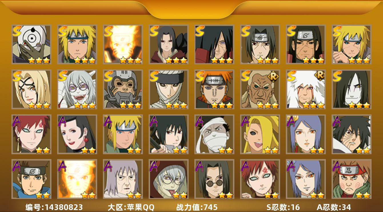 [14380823]v12 745万战力 16s-34a 有3传承奥义图 高招卷51 有熊猫 传说自来也53片 九喇嘛水门61片 忍战艾52片 金角银角52片 tt1462 【s级忍者】:半藏「秽土转生」3星,波风水门「秽土转生」3星,千手柱间「秽土转生」3星,宇智波鼬「秽土转生」3星,宇智波斑「秽土转生」3星,宇智波鼬「须佐能乎」3星,无「二代目土影」3星,艾「三代目雷影」3星,自来也「舞之豪杰」3星,大蛇丸3星,纲手「百豪」3星,波风水门3星,药师兜「仙人模式」3星,漩涡鸣人「九喇嘛连结」3星,佩恩「天道」3星,宇智波斑 「白面具」3星宇智波斑「白面具」 【a级忍者】:波风水门「青年」2星,波风水门「新春限定」2星,迪达拉「秽土转生」2星,大蛇丸「晓」2星,飞段3星,飞段「死司凭血」2星,干柿鬼鲛5星,漩涡鸣人「仙人模式」2星,漩涡鸣人「九尾查克拉」2星,迈特凯5星,旗木卡卡西「万花筒写轮眼」2星,桃地再不斩「漂泊武士」2星,桃地再不斩「秽土转生」2星,我爱罗「疾风传」2星,我爱罗「新春限定」2星,我爱罗「忍界大战」2星,蝎2星,小南「新春限定」2星,小南「夏日泳装」2星,猿飞阿斯玛5星,猿飞日斩「火影继承人」2星,宇智波鼬2星,宇智波鼬「新春限定」2星,宇智波佐助「须佐能乎」2星,宇智波佐助「万花筒写轮眼」2星,药师兜「半蛇斗篷」2星,照美冥「五代目水影」2星,宇智波带土「暴怒」2星,猿飞木叶丸「博人传」2星,黑土「博人传」2星,春野樱「百豪」2星,秋道丁次「忍界大战」2星,千代「近松十人卫」2星,不缘2星