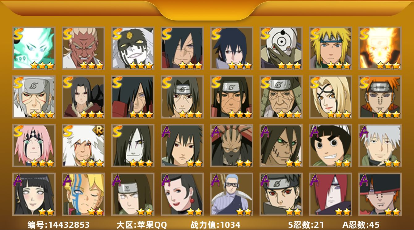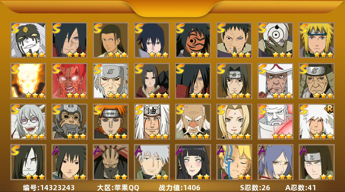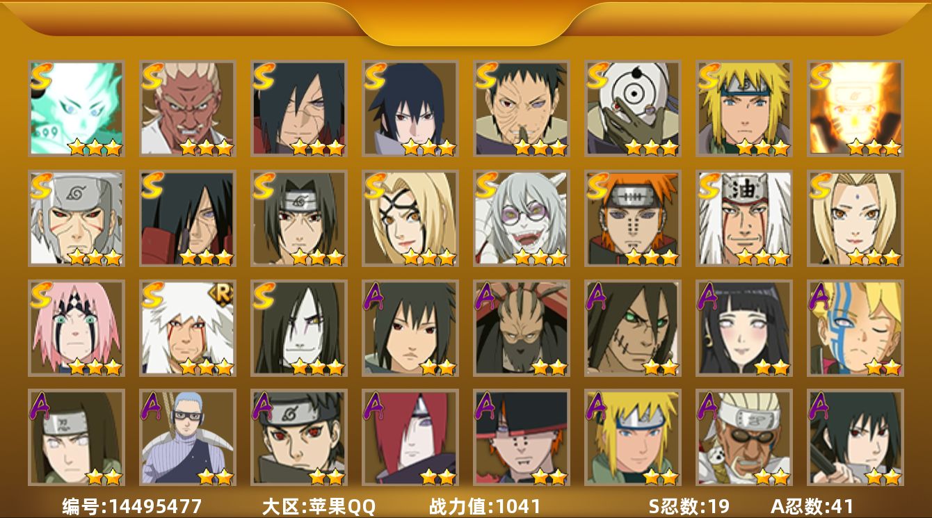 [14495477]v9 1041万战力 19s-41a 卡卡西43片 传说自来也64片 ll5328 【s级忍者】:千手扉间「秽土转生」3星,宇智波斑「秽土转生」3星,宇智波斑「秽土转生·解」3星,春野樱「忍界大战」3星,宇智波带土「忍界大战」3星,艾「忍界大战」3星,宇智波鼬「须佐能乎」3星,自来也3星,自来也「舞之豪杰」3星,大蛇丸3星,纲手3星,纲手「百豪」3星,波风水门3星,药师兜「仙人模式」3星,漩涡鸣人「九喇嘛连结」3星,佩恩「天道」3星,宇智波佐助「永恒万花筒」3星,宇智波斑 「白面具」3星宇智波斑「白面具」,大筒木舍人「最终章」3星 【a级忍者】:长门「青年」2星,波风水门「青年」2星,达鲁伊「博人传」2星,迪达拉2星,迪达拉「秽土转生」2星,大蛇丸「晓」2星,奇拉比「忍界大战」2星,飞段3星,飞段「死司凭血」3星,干柿鬼鲛5星,漩涡博人「桃式显现」2星,漩涡鸣人「仙人模式」2星,漩涡鸣人「九尾查克拉」2星,迈特凯5星,旗木卡卡西「万花筒写轮眼」2星,桃地再不斩2星,桃地再不斩「秽土转生」2星,我爱罗「疾风传」4星,我爱罗「忍界大战」2星,蝎5星,蝎「绯流琥」2星,小南2星,角都「秽土转生」2星,猿飞阿斯玛5星,猿飞阿斯玛「秽土转生」2星,宇智波止水2星,宇智波鼬2星,宇智波佐助「须佐能乎」2星,宇智波佐助「万花筒写轮眼」2星,药师兜「半蛇斗篷」2星,照美冥「五代目水影」2星,日向宁次「忍界大战」2星,日向雏田「最终章」2星,长十郎「六代目水影」2星,佩恩·六道「漂泊浪客」2星,猿飞木叶丸「博人传」2星,黑土「博人传」2星,春野樱「百豪」2星,秋道丁次「忍界大战」2星,千代「近松十人卫」2星,宇智波泉奈2星