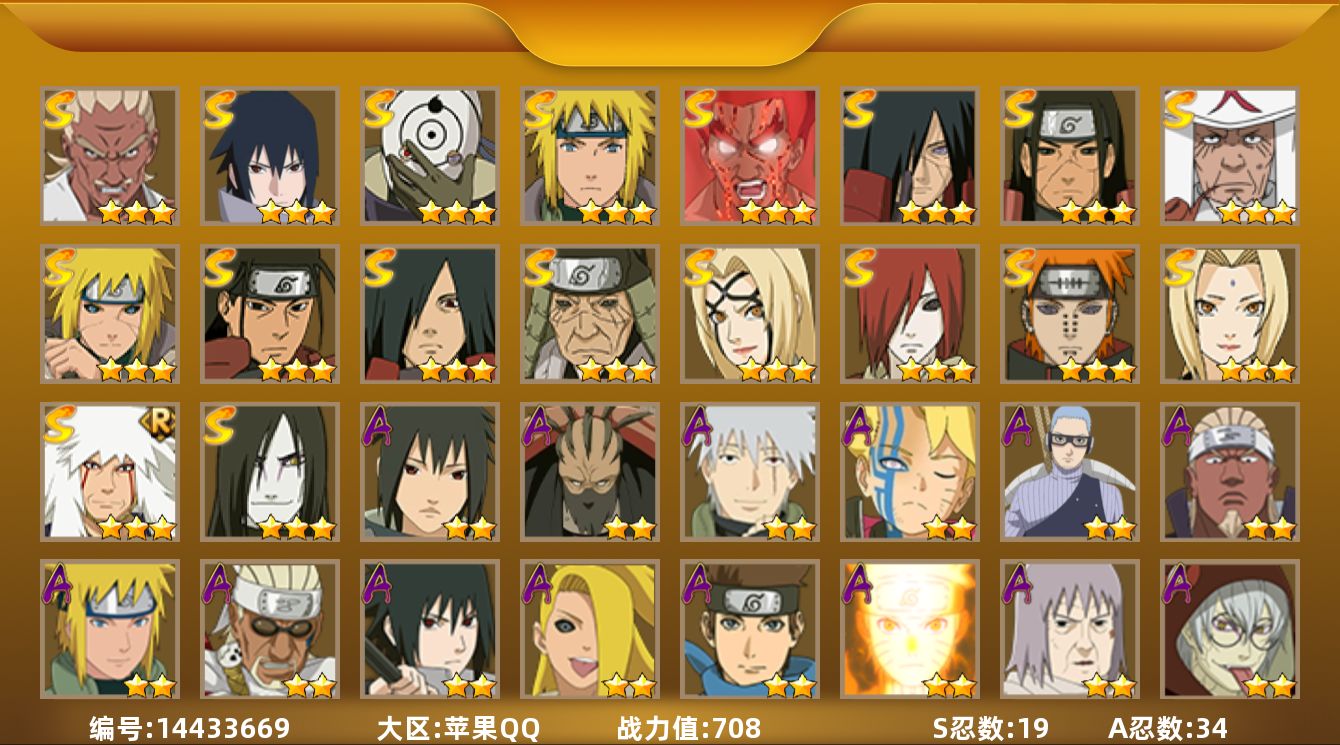 [14433669]v9 19s 34a 708w战力 须佐卡卡西98片 传说自来也92片 木叶创立斑55片 忍战带土53片 鬼灯幻月80片 yy1443 【s级忍者】:长门「秽土转生」3星,猿飞日斩「秽土转生」3星,波风水门「秽土转生」3星,千手柱间「秽土转生」3星,宇智波斑「秽土转生」3星,艾「忍界大战」3星,宇智波鼬「须佐能乎」4星,自来也「舞之豪杰」3星,大蛇丸4星,纲手3星,纲手「百豪」3星,千手柱间3星,猿飞日斩3星,宇智波斑3星,波风水门3星,迈特凯「死门」3星,佩恩「天道」3星,宇智波佐助「永恒万花筒」3星,宇智波斑 「白面具」3星宇智波斑「白面具」 【a级忍者】:艾「青年」2星,波风水门「青年」2星,达鲁伊「博人传」2星,迪达拉「秽土转生」2星,大蛇丸「晓」2星,奇拉比2星,奇拉比「忍界大战」2星,飞段4星,飞段「死司凭血」3星,干柿鬼鲛5星,漩涡博人「桃式显现」2星,漩涡鸣人「仙人模式」2星,漩涡鸣人「九尾查克拉」2星,迈特凯5星,旗木卡卡西「万花筒写轮眼」2星,旗木卡卡西「幻之真容」2星,我爱罗「疾风传」4星,我爱罗「忍界大战」2星,蝎3星,蝎「绯流琥」2星,猿飞阿斯玛4星,宇智波鼬2星,宇智波佐助「须佐能乎」2星,宇智波佐助「万花筒写轮眼」2星,药师兜「半蛇斗篷」2星,照美冥「五代目水影」2星,长十郎「六代目水影」2星,猿飞木叶丸「博人传」2星,黑土「博人传」2星,春野樱「百豪」2星,秋道丁次「忍界大战」2星,千代「近松十人卫」2星,神农「羁绊」2星,宇智波泉奈2星
