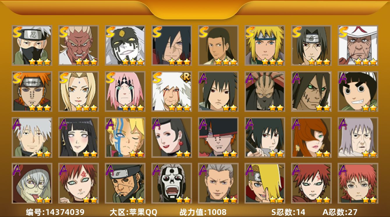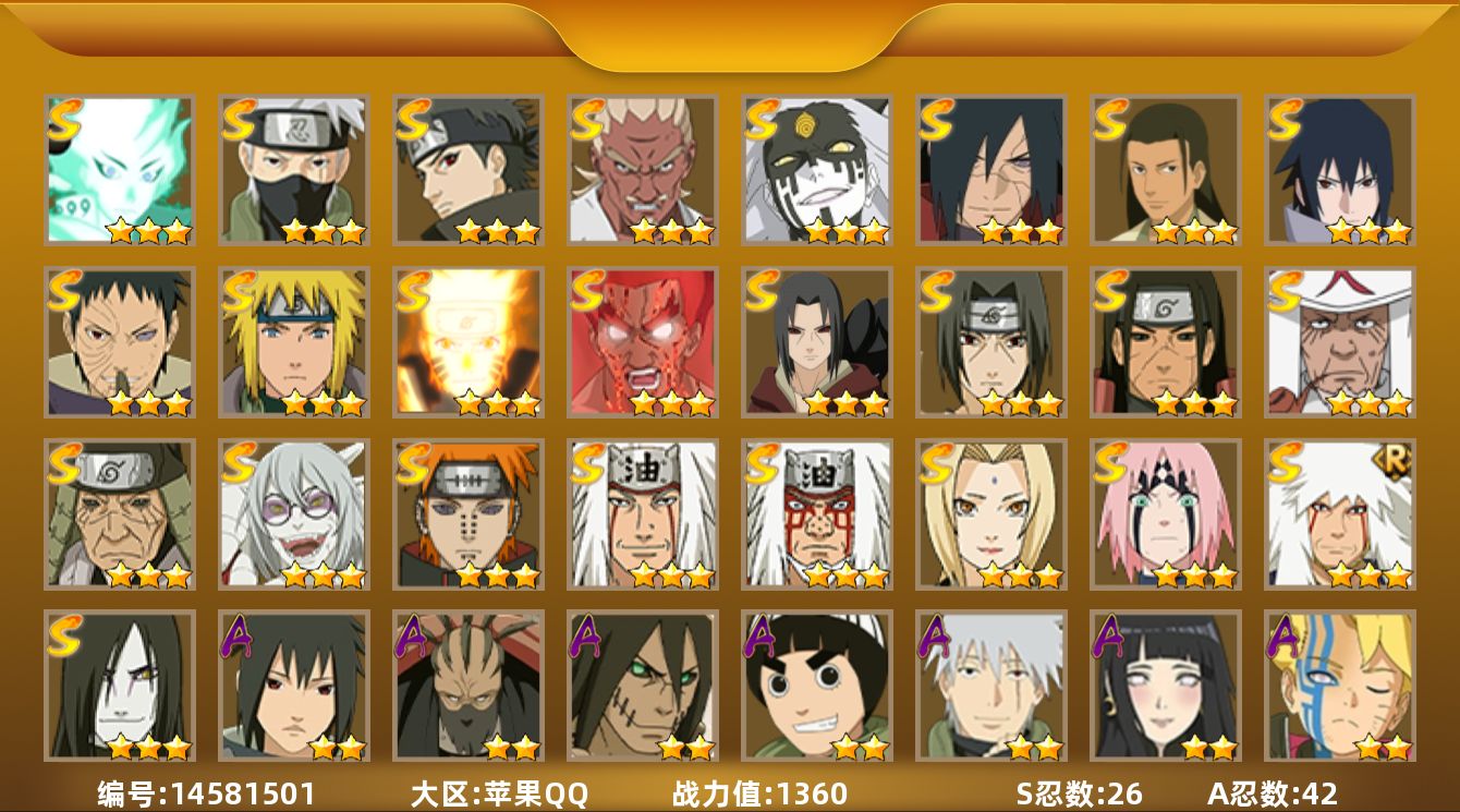 [14374039]v10 1008万战力 14s级忍者数-27a级忍者数 舍人80片 ll5311 【s级忍者】:宇智波斑「秽土转生·解」3星,春野樱「忍界大战」3星,艾「忍界大战」3星,宇智波鼬「须佐能乎」3星,旗木卡卡西「须佐能乎」3星,千手柱间「木叶创立」3星,烈斗「初代目风影」3星,自来也「舞之豪杰」3星,自来也「传说中的三忍」3星,纲手3星,猿飞日斩3星,波风水门4星,佩恩「天道」3星,大筒木桃式3星 【a级忍者】:迪达拉2星,飞段2星,飞段「死司凭血」2星,干柿鬼鲛5星,漩涡博人「桃式显现」2星,迈特凯5星,旗木卡卡西「幻之真容」2星,桃地再不斩「秽土转生」2星,我爱罗「疾风传」3星,我爱罗「忍界大战」2星,蝎3星,蝎「绯流琥」2星,角都「秽土转生」2星,猿飞阿斯玛5星,猿飞阿斯玛「秽土转生」2星,宇智波鼬2星,宇智波佐助「须佐能乎」2星,药师兜「半蛇斗篷」2星,照美冥「夏日泳装」2星,日向雏田「最终章」2星,佩恩·六道「漂泊浪客」2星,李洛克「忍界大战」2星,黑土「博人传」2星,千代「近松十人卫」2星,神农「羁绊」2星,不缘2星,宇智波泉奈2星