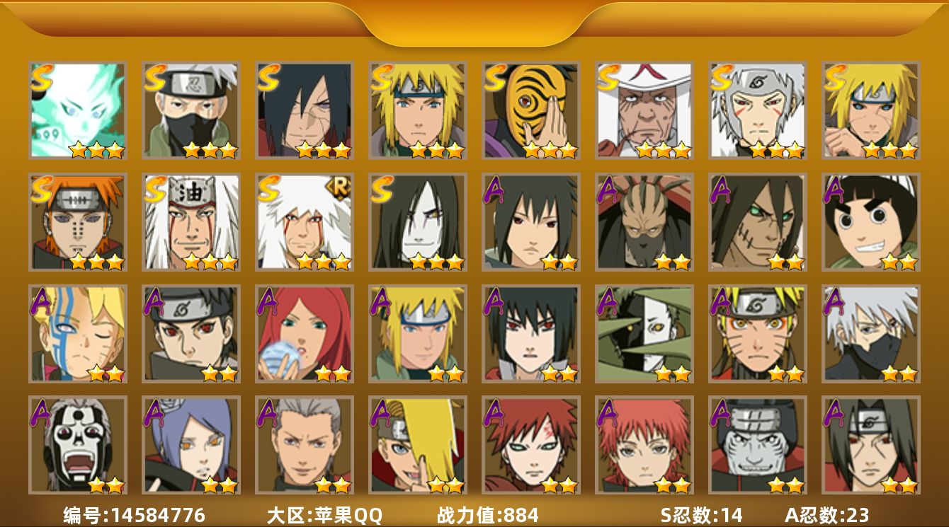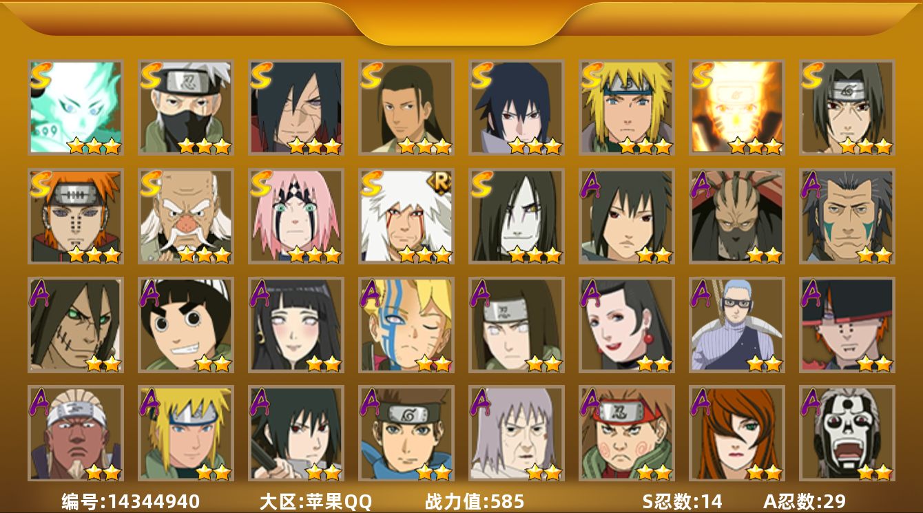 [14344940]v10 585万战力 14s级忍者数-29a级忍者数 九喇嘛水门56片 红夜面具男80片忍战艾85片天道超46片 ll5323 【s级忍者】:宇智波斑「秽土转生·解」3星,大野木「忍界大战」3星,春野樱「忍界大战」3星,宇智波鼬「须佐能乎」3星,旗木卡卡西「须佐能乎」3星,千手柱间「木叶创立」3星,自来也「舞之豪杰」3星,大蛇丸3星,自来也「传说中的三忍」3星,波风水门3星,漩涡鸣人「九喇嘛连结」3星,佩恩「天道」3星,宇智波佐助「永恒万花筒」3星,大筒木舍人「最终章」3星 【a级忍者】:艾「青年」2星,波风水门「青年」2星,迪达拉2星,飞段3星,飞段「死司凭血」2星,干柿鬼鲛2星,漩涡博人「桃式显现」2星,迈特凯2星,桃地再不斩「秽土转生」2星,我爱罗「疾风传」3星,蝎2星,蝎「绯流琥」2星,角都「秽土转生」2星,猿飞阿斯玛2星,宇智波鼬2星,宇智波佐助「须佐能乎」2星,照美冥「五代目水影」2星,日向宁次「忍界大战」2星,日向雏田「最终章」2星,长十郎「六代目水影」2星,佩恩·六道「漂泊浪客」2星,李洛克「忍界大战」2星,猿飞木叶丸「博人传」2星,黑土「博人传」2星,秋道丁次「忍界大战」2星,千代「近松十人卫」2星,不缘2星,宇智波泉奈2星,不动2星