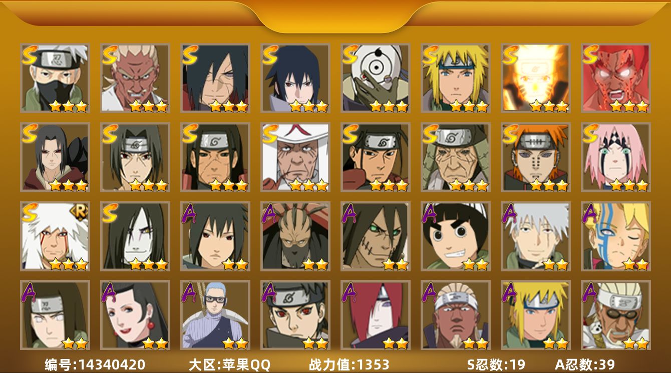 [14340420]v7 1353万战力 19s级忍者数-39a级忍者数 九喇嘛水门52片 罗砂70片 大野木80片 舍人65片 ll5309 【s级忍者】:猿飞日斩「秽土转生」3星,千手柱间「秽土转生」3星,宇智波鼬「秽土转生」3星,宇智波斑「秽土转生·解」3星,春野樱「忍界大战」3星,艾「忍界大战」3星,宇智波鼬「须佐能乎」3星,旗木卡卡西「须佐能乎」3星,自来也「舞之豪杰」3星,大蛇丸4星,自来也「传说中的三忍」3星,千手柱间3星,猿飞日斩3星,波风水门3星,漩涡鸣人「九喇嘛连结」3星,迈特凯「死门」3星,佩恩「天道」3星,宇智波佐助「永恒万花筒」3星,宇智波斑 「白面具」3星宇智波斑「白面具」 【a级忍者】:艾「青年」2星,长门「青年」2星,波风水门「青年」2星,达鲁伊「博人传」2星,迪达拉2星,迪达拉「秽土转生」2星,大蛇丸「晓」2星,奇拉比2星,奇拉比「忍界大战」2星,飞段3星,飞段「死司凭血」2星,干柿鬼鲛5星,漩涡博人「桃式显现」2星,漩涡鸣人「仙人模式」2星,漩涡鸣人「九尾查克拉」2星,迈特凯5星,旗木卡卡西「幻之真容」2星,桃地再不斩「秽土转生」2星,我爱罗「疾风传」3星,我爱罗「忍界大战」2星,蝎5星,蝎「绯流琥」2星,角都「晓创生」2星,角都「秽土转生」2星,猿飞阿斯玛5星,猿飞阿斯玛「秽土转生」2星,宇智波止水2星,宇智波鼬2星,宇智波佐助「须佐能乎」2星,宇智波佐助「万花筒写轮眼」2星,日向宁次「忍界大战」2星,长十郎「六代目水影」2星,李洛克「忍界大战」2星,黑土「博人传」2星,春野樱「百豪」2星,秋道丁次「忍界大战」2星,千代「近松十人卫」2星,不缘2星,宇智波泉奈2星