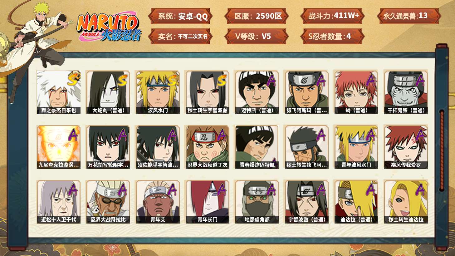 14s忍/26a忍/战力911w/v10/区服2728 【s忍者】 宇智波佐助「永恒万花筒」,漩涡鸣人「九喇嘛连结」,大野木「忍界大战」,迈特凯「死门」,宇智波斑「木叶创立」,宇智波带土「忍界大战」,千手柱间「秽土转生」,自来也「舞之豪杰」,旗木卡卡西「须佐能乎」,猿飞日斩「秽土转生」,佩恩「天道」,波风水门,大蛇丸,纲手, 【a忍者】 长十郎「六代目水影」,日向宁次「忍界大战」,李洛克「忍界大战