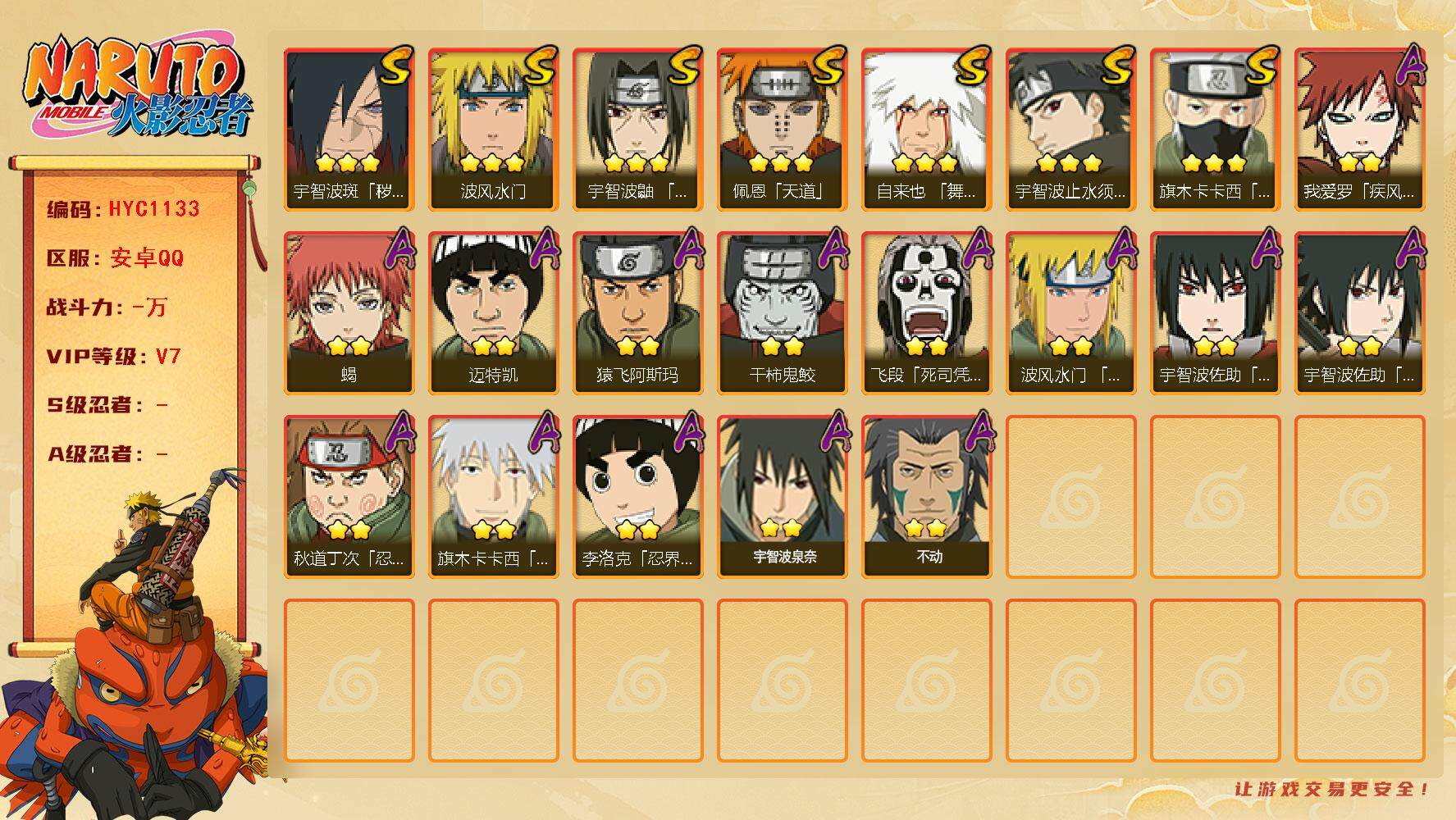 7s忍/23a忍/战力547w/v5/区服2299 【s忍者】 漩涡鸣人「九喇嘛连结」,自来也「舞之豪杰」,宇智波斑「白面具」,宇智波鼬「须佐能乎」,佩恩「天道」,波风水门,大蛇丸, 【a忍者】 长十郎「六代目水影」,漩涡博人「桃式显现」,日向雏田「最终章」,旗木卡卡西「幻之真容」,宇智波泉奈,长门「青年」,艾「青年」,神秘面具男「忍者之路」,波风水门「青年」,奇拉比「忍界大战」,宇智波佐助「须佐
