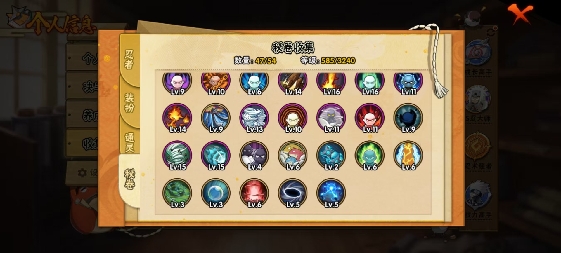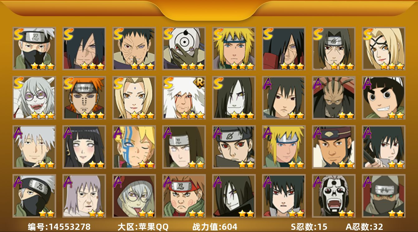 s忍数 19 a忍数 45 时装数 13 战力值万 7596853 s级忍者19 宇智波鼬「秽土转生」宇智波斑 「木叶创立」佩恩「天道」大蛇丸波风水门宇智波鼬 「须佐能乎」迈特凯「死门」自来也 「舞之豪杰」宇智波斑「白面具」漩涡鸣人 「九喇嘛连结」春野樱 「忍界大战」