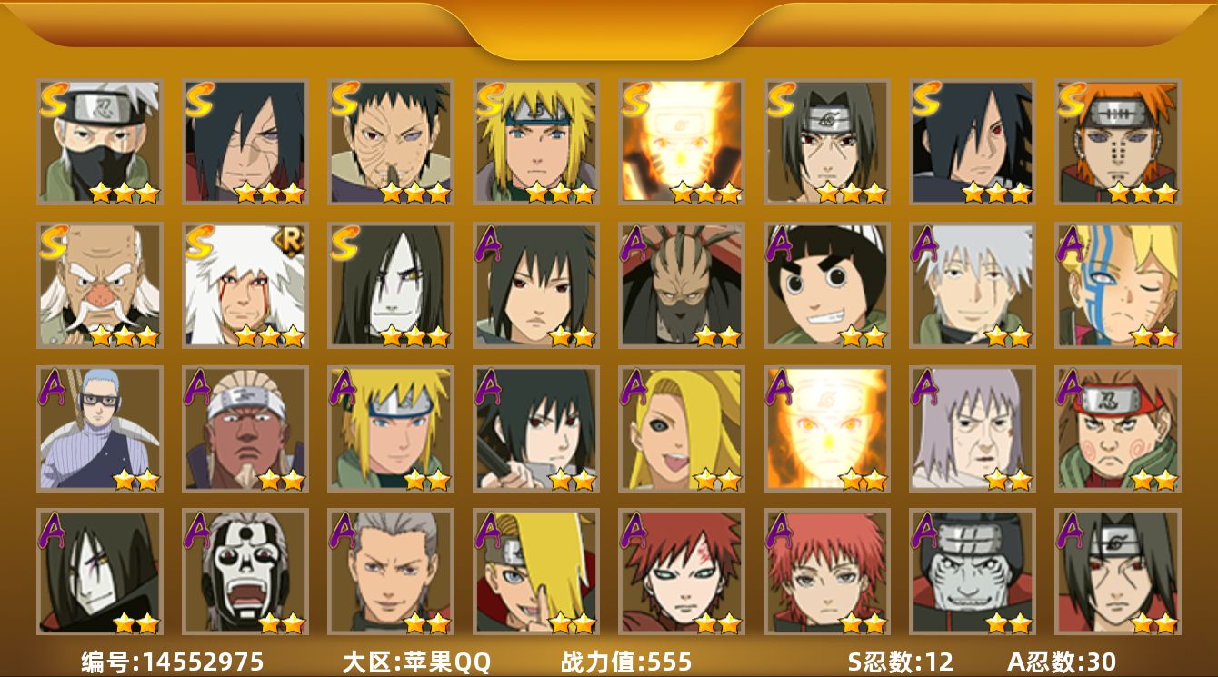v10 23s忍 42a忍 18通灵 837.2w战力 可二次 可修改实名 【s级忍者】:艾「忍界大战」春野樱 「忍界大战」漩涡鸣人 「九喇嘛连结」宇智波带土 「忍界大战」千手柱间「秽土转生」自来也 「舞之豪杰」旗木卡卡西「须佐能乎」药师兜「仙人模式」宇智波斑「秽土转生」宇智波斑