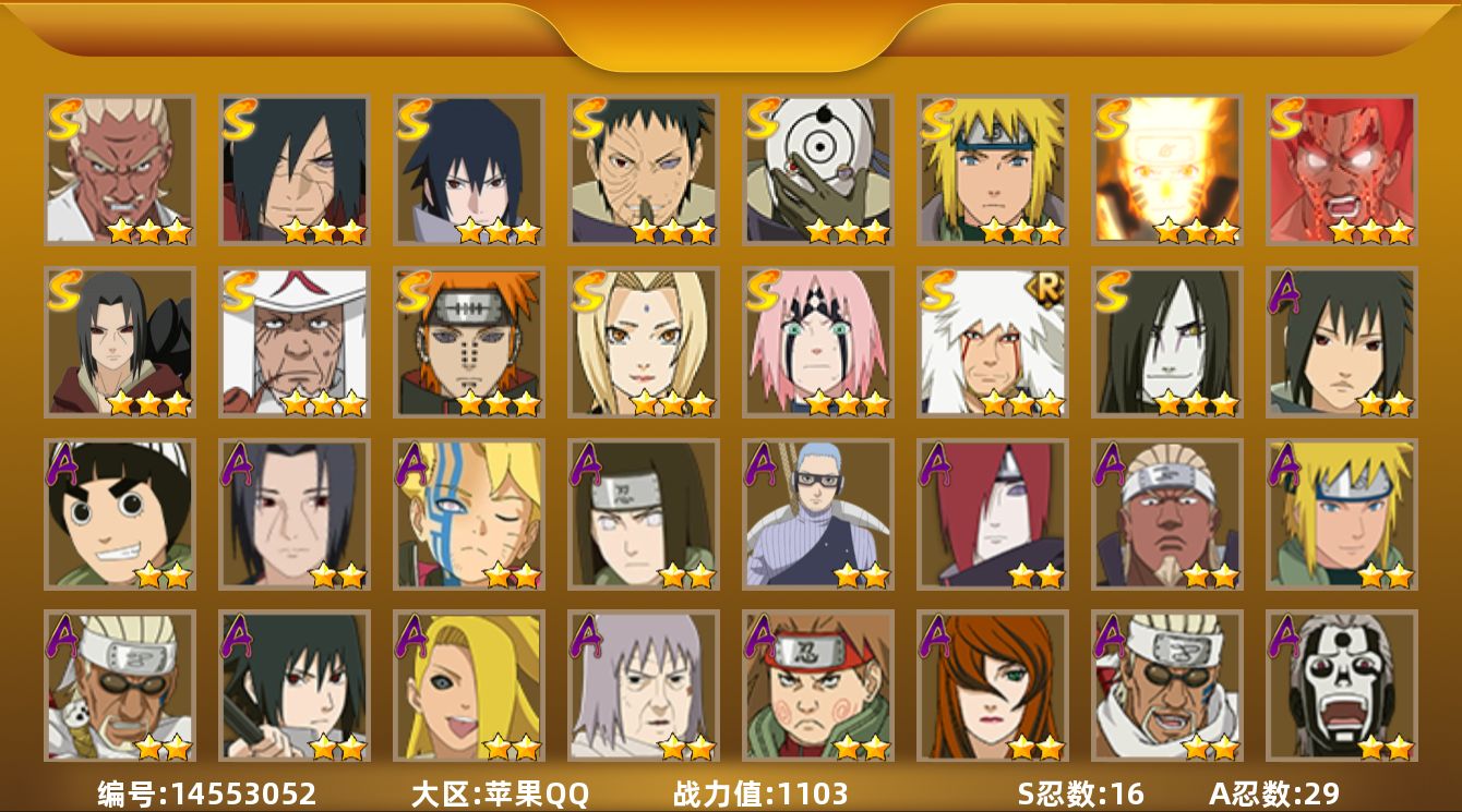 [14553232]v11 17s忍 35a忍 17通灵 843.3w战力 可二次 可修改实名 【s级忍者】:艾「忍界大战」大筒木桃式宇智波斑「秽土转生·解」宇智波佐助「永恒万花筒」漩涡鸣人 「九喇嘛连结」迈特凯「死门」千手柱间「秽土转生」自来也 「舞之豪杰」旗木卡卡西「须佐能乎」药师兜「仙人模式」宇智波斑「秽土转生」艾「三代目雷影」神秘面具男宇智波鼬 「须佐能乎」佩恩「天道」波风水门大蛇丸 【通灵兽】:熊猫