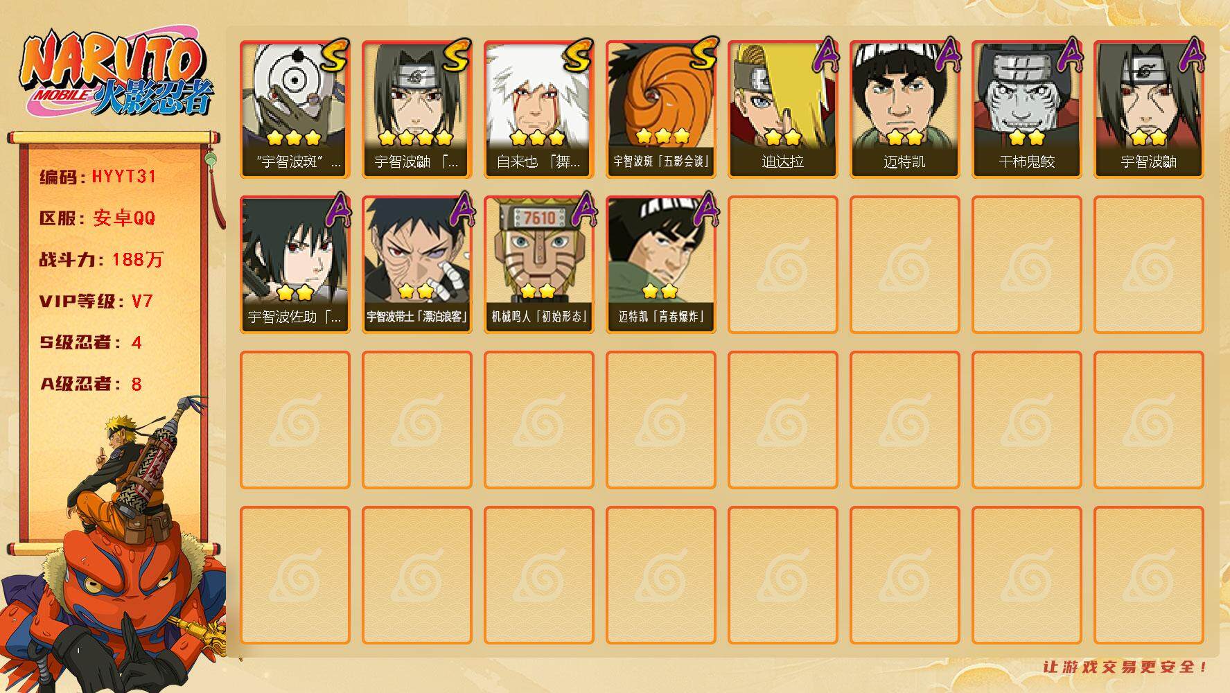 【hyyt31】v7/战力188w/s忍4/a忍8/通灵兽10/3星自来也「舞之豪杰」/3星宇智波斑「白面具」/2星宇智波带土「漂泊浪客」/2星迪达拉/2星干柿鬼鲛/2星宇智波鼬/2星迈特凯/2星迈特凯「青春爆炸」/2星宇智波佐助「须佐能乎」/3星宇智波斑「五影会谈」/2星机械鸣人「初始形态」/4星宇智波鼬「须佐能乎」