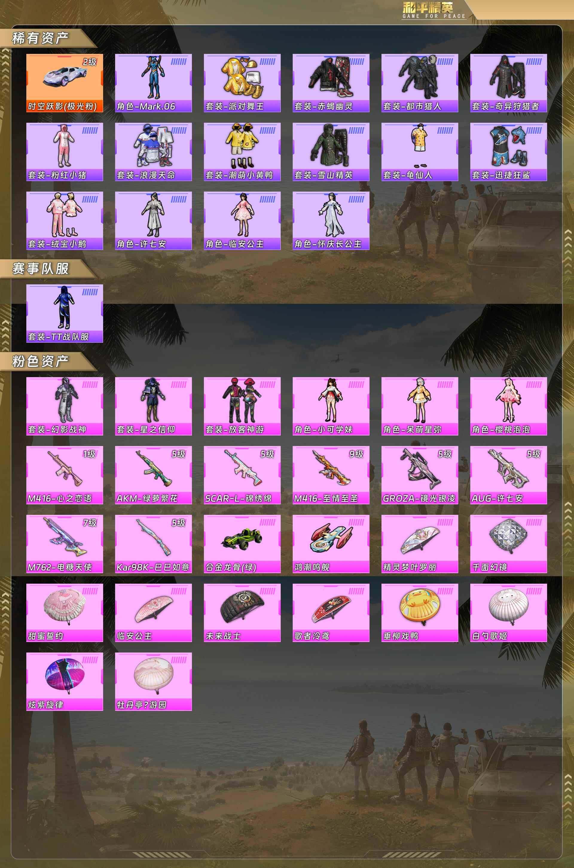 男神三件套-无敌战神框-地铁满天赋-/满级至情至圣/赤蝎/金鞋/都市/时空跃影[2级]/发光眼罩/蓝螳螂/深海小丑鱼/小丑鱼/浪漫天命/奇异狩猎者/绒宝小鹅/许七安/临安公主/怀庆长公主/星之信仰/小可学妹/呆萌星弥/樱桃泡泡【粉色呛皮】m4至情至圣9级/aug许七安5级/m762电糖天使7级【载具】合金龙骨/时空跃影[2级] (2载具6粉套8粉呛)hp1002 可立即换绑无需挂单养号-82652热力值-15印记-191套装-249呛皮 【稀有载具】:合金龙骨(绿) 【稀有载具等级】:时空跃影(极光粉)二级时空跃影(极光粉) 【特效呛等级】:akm-绿萝繁花五级akm-绿萝繁花,scar-l-锦绣绵绵五级scar-l-锦绣绵绵,m416-心之恋语一级m416-心之恋语,m416-至情至圣九级m416-至情至圣,groza-镜光银凌五级groza-镜光银凌,aug-许七安五级aug-许七安,m762-电糖天使七级m762-电糖天使,kar98k-巳巳如意五级kar98k-巳巳如意 【优质套装】:粉装-幻影战神,粉装-星之信仰,粉装-放客神游,角色-呆萌星弥,角色-小可学妹,角色-樱桃泡泡 【稀有套装】:角色-mark.06,角色-临安公主,角色-怀庆长公主,套装-绒宝小鹅,套装-巳巳如意 【优质武器皮肤】:akm-绿萝繁花,scar-l-锦绣绵绵,m416-心之恋语,m416-至情至圣,kar98k-巳巳如意,dbs-创世·救赎 【稀有武器皮肤】:akm-夜灯,akm-奇异狩猎者,akm-彩虹符号,akm-影袭,akm-江南烟雨,akm-灼热熔岩,akm-生命誓言,akm-破晓战魂,akm-萌趣颜团子,akm-虎虎生威,akm-霓虹街区,akm-龙的传人,m16a4-夜灯,m16a4-幻世战舞者,m16a4-甜心亚梦,m16a4-红色方程式,m16a4-蓝色火焰,scar-l-未来战士,scar-l-炫彩节奏,scar-l-玉兔迎春,scar-l-红色方程式,m416-夜灯,m416-暗夜行者,m416-糯团青竹,m416-红色方程式,m416-蓝色火焰,groza-彩虹符号,groza-影袭,groza-春暖花开,groza-治愈之星,groza-田园牧歌,aug-甜蜜菠萝,aug-耀粉歌者,q-彩虹符号,m762-天降萌叽,m762-奇异狩猎者,m762-彩虹符号,m762-牛气冲天,m762-生命誓言,m762-绯红前夜,m762-镭射皇者,mk47-妙红点点,g36c-暗夜玫瑰,ac-val-天降萌叽,ac-val-快闪甜心,ac-val-甜心亚梦,蜜獾-垂柳戏鸭,蜜獾-天降萌叽,蜜獾-娇憨猪猪,uzi-众神之王,uzi-啾咪啾咪,uzi-天降萌叽,uzi-娇憨猪猪,uzi-影袭,uzi-炫彩节奏,uzi-红色方程式,ump45-繁龙极客,ump45-夜灯,ump45-涂山之恋,ump45-生命誓言,ump45-蓝色火焰,vect-焰鹰斗篷,vect-pel轰鸣竞梦者,vect-彩虹符号,vect-治愈之星,vect-生命誓言,vect-田园牧歌,vect-金玉无双,汤姆逊-天降萌叽,汤姆逊-奇异狩猎者,汤姆逊-耀粉歌者,野牛-夜灯,mp5k-众神之王,p90-快闪甜心,p90-巳巳如意,kar98k-彩虹符号,kar98k-影袭,kar98k-炫彩节奏,kar98k-红色方程式,m24-影袭,m24-未来战士,m24-治愈之星,m24-仲夏莫吉托,m24-众神之王,m24-奇异狩猎者,awm-焰鹰斗篷,awm-垂柳戏鸭,sks-心之恋语,vss-未来战士,vss-田园牧歌,vss-繁花小夜曲,vss-镭射皇者,mini14-涂山之恋,mini14-穿刺龙虾,mini14-耀粉歌者,mini14-金鼠迎春,mk14-治愈之星,slr-众神之王,slr-四圣焕新,slr-娇憨猪猪,amr-妙红点点,amr-镜光幻境,amr-墨龙九天,m417-惊鸿侠骨,mk20-h-快闪甜心,m200-仲夏莫吉托,m200-惊鸿侠骨,s686-奇异狩猎者,s686-王牌投手,s686-生命誓言,s686-白勺歌姬,s686-红色方程式,s686-巳巳如意,s1897-星夜魔法师,s1897-炫彩节奏,s1897-镭射皇者,s12k-玩趣呆呆,s12k-破晓战魂,s12k-垂柳戏鸭,s12k-夜灯,s12k-娇憨猪猪,s12k-幻世战舞者,s12k-王子的夏天,dbs-焰鹰斗篷,dbs-甜心亚梦,spas-12-田园牧歌,m249-妙红点点,m249-彩虹符号,m249-破晓战魂,m249-糯团青竹,m249-镭射皇者,dp-28-焰鹰斗篷,dp-28-未来战士,dp-28-甜心亚梦,dp-28-锦绣火鲤,mg3-妙红点点,mg3-幻世战舞者,mg3-惊鸿侠骨,mg3-摩登王国,短管霰弹-竹节火铳,沙墨之鹦-快闪甜心,tmp-9-江南烟雨,爆炸猎弓-惊鸿侠骨,大砍刀-黑金刀,破片手留单-巳巳如意 【热门品类】:套装-赤蝎幽灵,套装-派对舞王,套装-深海小丑鱼,套装-小丑鱼,套装-奇异狩猎者,套装-都市猎人,套装-忍者信条 【其他套装】:角色-情公主,角色-银尘,套装-纯真浪花,套装-热情海星,套装-雏菊兔兔,套装-萝兰蝴蝶,套装-粉日山川,套装-小熊娃娃,套装-ss29特训,套装-ss27特训,套装-ss28特训,套装-曼妙人鱼,套装-ss10特训,套装-ss11特训,套装-ss12特训,套装-ss13特训,套装-ss14特训,套装-ss15特训,套装-ss16特训,套装-ss17特训,套装-ss18特训,套装-ss19特训,套装-ss20特训,套装-ss21特训,套装-ss22特训,套装-ss23特训,套装-ss24特训,套装-ss25特训,套装-ss26特训,套装-ss7特训,套装-ss8特训,套装-ss9特训,套装-tt战队服,套装-丛林猎人,套装-众神之王,套装-光之冒险,套装-军械专家,套装-冰冻风暴,套装-冰川特警,套装-北国孤狼,套装-吉莉礼服,套装-呆萌铁蟹,套装-坚韧舞者,套装-夏日倾情,套装-夏日音浪,套装-妙红点点,套装-娇憨猪猪,套装-幻世战舞者,套装-幻彩翩翩,套装-幻影武者,套装-快闪甜心,套装-惊鸿侠骨,套装-探宝勇士,套装-日照花林,套装-旭日情侣,套装-时尚圣诞,套装-春光漫游,套装-春日漫步,套装-智慧之神,套装-暗夜契约,套装-朱雀圣者,套装-极速红龙,套装-柠萌假日,套装-格斗先锋,套装-森林游猎者,套装-橘黑制服,套装-沙漠兵团,套装-治愈之星,套装-浪漫天命,套装-海岛探路者,套装-涂山之恋,套装-淡雅花蕊,套装-清新柠檬,套装-滨海假日,套装-漫步者,套装-潮萌小黄鸭,套装-灼焰舞者,套装-炫蓝之夏,套装-热血青春,套装-熠彩粉晶,套装-牛气冲天,套装-牛气满满,套装-特战装甲,套装-特种颜团子,套装-特训学院,套装-猎梦纪元,套装-猎鹰,套装-猛禽,套装-玉兔迎春,套装-甜心亚梦,套