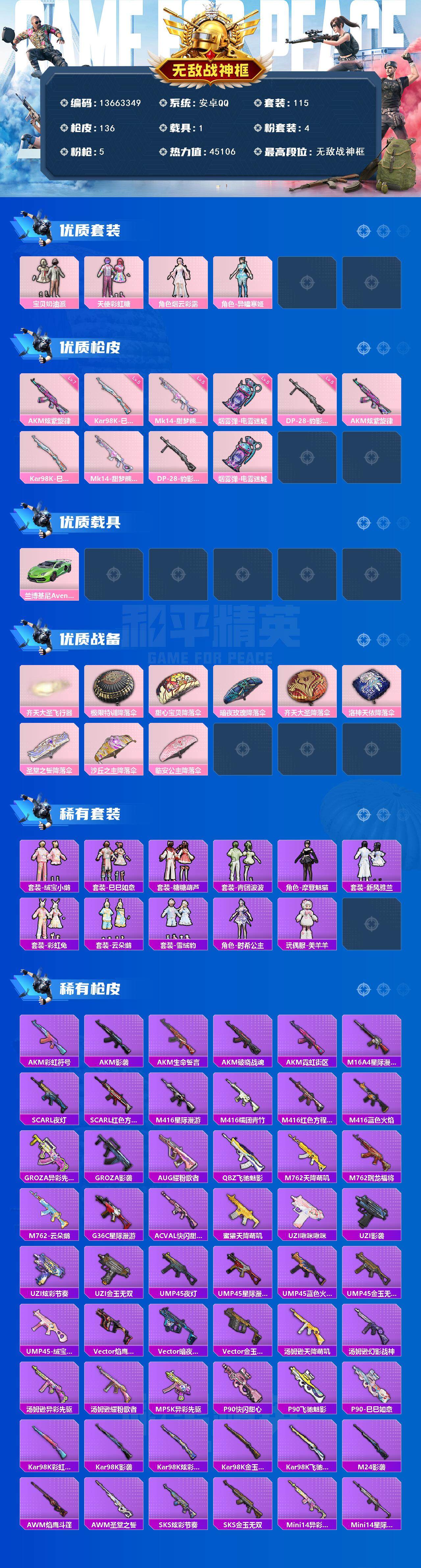 5884 历史无敌战神m416-星际漫游 44413热力值 9王牌印记114套装 134呛皮 【1载具】 兰博svj绿色 【1稀有】 【3粉装】 宝贝奶油派 天使彩虹糖 烟云彩露 【5特效呛】 akm-炫紫旋律 7级 kar98k-巳巳如意 5级 dp-28-豹影疾电 5级 mk