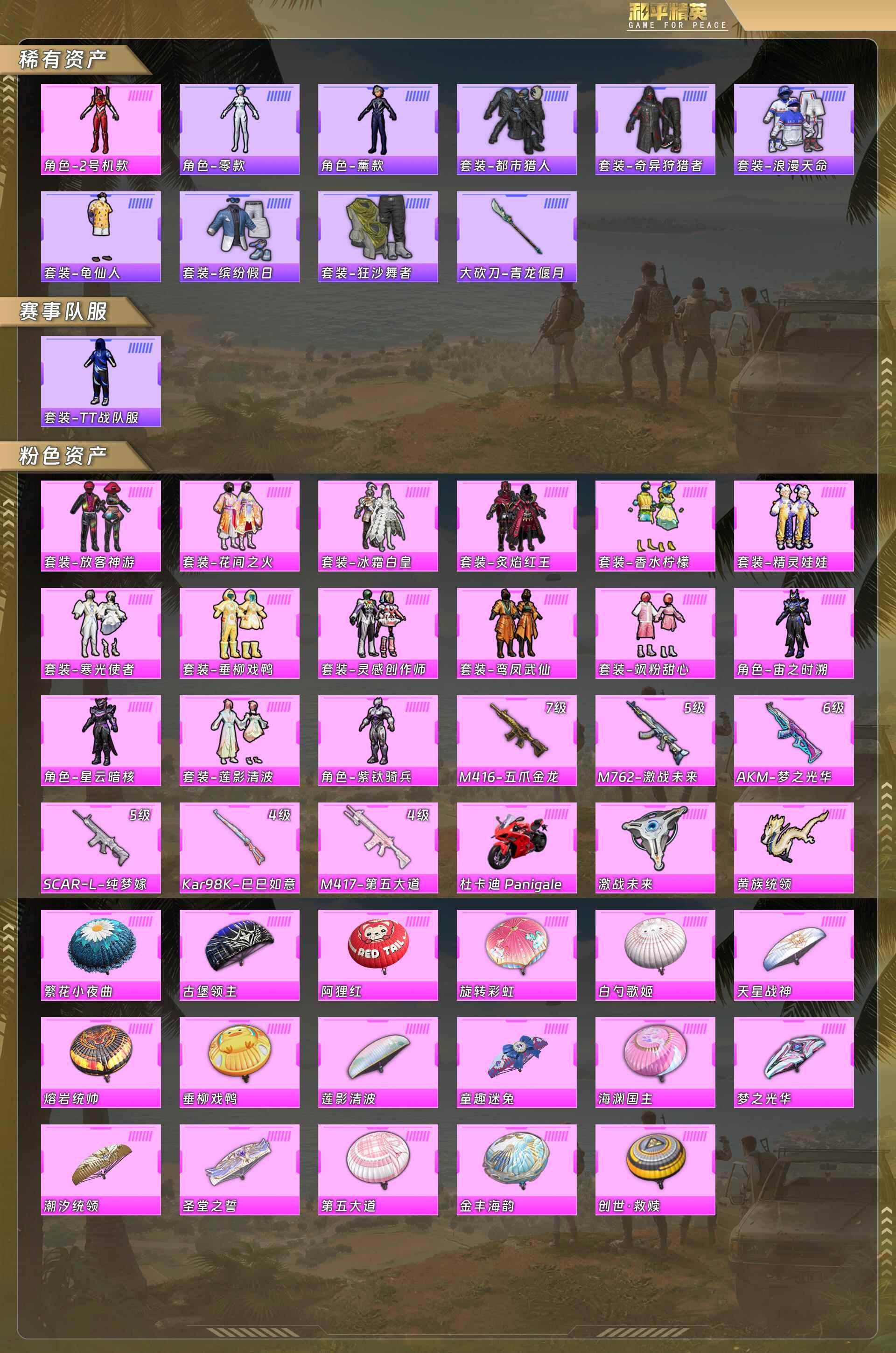 身法号-红螳螂/都市猎人/浪漫天命/缤纷假日/狂沙舞者/tt战队服/放客神游/花间之火/冰霜白皇/炙焰红王/香水柠檬/精灵娃娃/寒光使者/垂柳戏鸭/灵感创作师/鸾凤武仙/飒粉甜心/宙之时溯/星云暗核/莲影清波/紫钛骑兵/m416-五爪金龙[7级]/m762-激战未来[5级]/akm-梦之光华[6级]/scar-l-纯梦嫁纱[5级]/没战神框 hp3117 【热门品类】:套装-浪漫天命,套装-都市猎人,套装-深海小丑鱼,套装-小丑鱼,套装-奇异狩猎者,角色-军刀雅典娜,套装-龟仙人,大砍刀-青龙偃月刀 【粉色载具】:杜卡迪 panigale v4(杜卡迪红) 【粉色套装】:粉装-放客神游,粉装-花间之火,粉装-冰霜白皇,粉装-炙焰红王,粉装-香水柠檬,角色-2号机款机体服,粉装-精灵娃娃,粉装-垂柳戏鸭,粉装-灵感创作师,粉装-鸾凤武仙,粉装-寒光使者,粉装-飒粉甜心,角色-宙之时溯,角色-星云暗核,粉装-莲影清波,角色-紫钛骑兵 【粉色呛皮等级】:akm-梦之光华六级,scar-l-纯梦嫁纱五级,m416-五爪金龙七级,m762-激战未来五级,kar98k-巳巳如意四级,m417-第五大道四级 【粉色呛皮】:akm-梦之光华,scar-l-纯梦嫁纱,m416-五爪金龙,m762-激战未来,kar98k-巳巳如意,m417-第五大道 【粉色飞行器】:激战未来飞行器,黄族统领飞行器 【粉色降落伞】:古堡领主降落伞,繁花小夜曲降落伞,潮汐统领降落伞,阿狸红降落伞,童趣迷兔降落伞,梦之光华降落伞,海渊国主降落伞,垂柳戏鸭降落伞,旋转彩虹降落伞,第五大道降落伞,白勺歌姬降落伞,天星战神降落伞,莲影清波降落伞,熔岩统帅降落伞,圣堂之誓降落伞,创世·救赎降落伞,金丰海韵降落伞 【稀有套装】:套装-龟仙人,角色-绯色魅影 【稀有呛皮】:akm-彩虹符号,akm-灼热熔岩,akm-玉龙,akm-破晓战魂,akm-缤纷海域,akm-萌趣颜团子,m16a4-红色方程式,scar-l-炫彩节奏,scar-l-玉兔迎春,scar-l-甜蜜誓约,m416-彩虹嘻嘻猴,m416-糯团青竹,m416-红色方程式,groza-彩虹符号,groza-影袭,groza-懵萌河马,groza-生命誓言,groza-田园牧歌,aug-天降萌叽,aug-纯梦嫁纱,aug-耀粉歌者,aug-青春冒险家,q-原初圣火,q-神秘黑猫,m762-天降萌叽,m762-深海曼妙,m762-牛气冲天,m762-瑞龙福将,m762-第五大道,m762-镭射皇者,mk47-妙红点点,mk47-青春冒险家,g36c-懵萌河马,ac-val-天降萌叽,ac-val-快闪甜心,蜜獾-天降萌叽,uzi-啾咪啾咪,uzi-天降萌叽,uzi-幻影战神,uzi-影袭,uzi-红色方程式,ump45-春暖花开,ump45-涂山之恋,ump45-生命誓言,ump45-诡娃娃,ump45-金玉无双,vect-焰鹰斗篷,vect-彩虹符号,vect-生命誓言,vect-田园牧歌,vect-黑色刀锋,vect-龙行天下,汤姆逊-天降萌叽,汤姆逊-耀粉歌者,野牛-青春冒险家,p90-倾城蜜语,p90-快闪甜心,kar98k-古堡领主,kar98k-彩虹符号,kar98k-影袭,m24-影袭,awm-焰鹰斗篷,sks-炫彩节奏,sks-糯团青竹,sks-迅猛狂鲨,vss-田园牧歌,vss-镭射皇者,mini14-原初圣火,mini14-海渊国主,mini14-涂山之恋,mini14-炫彩节奏,mini14-穿刺龙虾,mini14-耀粉歌者,mini14-金玉无双,mk14-童趣迷兔,win94-瑞龙福将,slr-彩虹符号,qbu-青春冒险家,莫辛纳甘-懵萌河马,莫辛纳甘-银碳小老虎,amr-妙红点点,m417-惊鸿侠骨,m417-星兔领航员,mk20-h-快闪甜心,m200-惊鸿侠骨,m200-绿野极光,s1897-暗夜鎏金,s1897-潮汐统领,s1897-百万伏特,s1897-镭射皇者,s12k-玩趣呆呆,s12k-瑞龙福将,s12k-童趣迷兔,dbs-焰鹰斗篷,dbs-圣堂之誓,dbs-彩虹甜喵,dbs-彩虹符号,dbs-第五大道,spas-12-田园牧歌,m249-古堡领主,m249-四圣焕新,m249-妙红点点,m249-彩虹符号,m249-糯团青竹,m249-莲影清波,m249-镭射皇者,dp-28-焰鹰斗篷,dp-28-原初圣火,dp-28-彩虹符号,mg3-妙红点点,mg3-幻世战舞者,mg3-惊鸿侠骨,mg3-瑞龙福将,mg3-第五大道,pkm-懵萌河马,p1911-粉锦千层,p18c-原初圣火,沙墨之鹦-全功率超战,沙墨之鹦-快闪甜心,爆炸猎弓-惊鸿侠骨,大砍刀-2p战斗服款,大砍刀-青龙偃月刀 【其他套装】:套装-tt战队服,套装-ss10特训,套装-ss11特训,套装-ss12特训,套装-ss13特训,套装-ss14特训,套装-ss15特训,套装-ss16特训,套装-ss17特训,套装-ss18特训,套装-ss21特训,套装-ss22特训,套装-ss23特训,套装-ss24特训,套装-ss25特训,套装-ss26特训,套装-ss27特训,套装-ss28特训,套装-ss29特训,套装-光之冒险,套装-冰川格斗者,套装-夏日倾情,套装-日冕精灵,套装-柠萌假日,套装-浪漫天命,套装-海岛探路者,套装-涂山之恋,套装-灰色格斗者,套装-热血青春,套装-牛气冲天,套装-牛气满满,套装-狂沙舞者,套装-猛禽,套装-玉兔迎春,套装-王牌教练,套装-疯狂小兔子,套装-白色伏地魔,套装-破晓战魂,套装-空岛之星,套装-竞技名士,套装-绯格组合,套装-缤纷假日,套装-缤纷果语,套装-荣耀,套装-萌趣颜团子,套装-萌黄之夏,套装-血色贵族,套装-野性战心,套装-长空猛禽,套装-霓虹街区,套装-霸义无双,套装-飞行日记,套装-骑行爱好者,套装-魅力单车,套装-麻辣教官,套装-龙的传人,套装-龙腾端午,套装-龟仙人,套装-鹰眼刺客,套装-冰冻风暴,套装-漫步者,套装-奇异狩猎者,套装-蓝调潮人,套装-深海小丑鱼,套装-呆萌铁蟹,套装-弄潮海豚,套装-淡雅花蕊,套装-红酒骑士,套装-荷鲁斯之眼,套装-暗夜契约,套装-纯白誓言,套装-原初圣火,套装-逆风勇士,套装-镭射皇者,套装-银白舞王,套装-抹茶蜜豆,套装-冰爽海盐,套装-迅捷之星,套装-青春冒险家,套装-潮流游乐家,套装-快乐星愿,套装-瑞龙福将,套装-团圆交子,角色-薰款战斗服,角色-零款战斗服,套装-田园牧歌,套装-轻风白浪,套装-和煦暖阳,套装-绚烂繁星,套装-熠彩粉晶,套装-妙红点点,套装-灵蜜圈圈,套装-幻彩翩翩,套装-莱茵河畔,