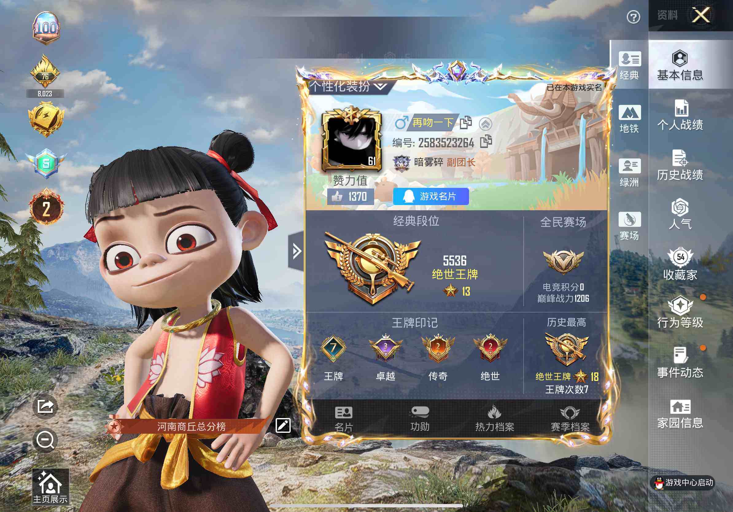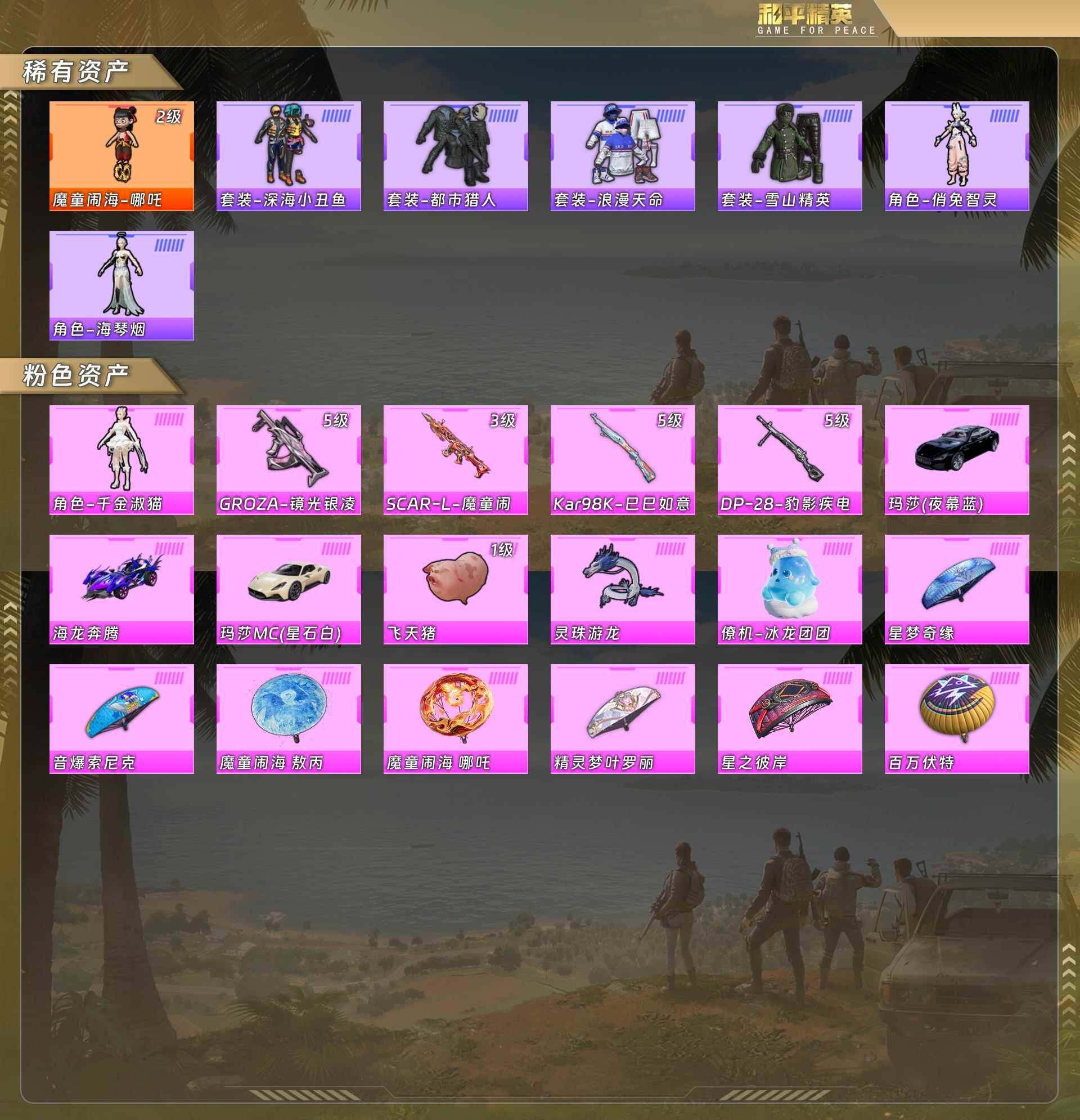 素材号-地铁满天赋-2级哪吒/都市/浪漫天命/雪山精英/深海小丑鱼/千金淑猫/俏兔智灵/海琴烟【呛皮】groza镜光银凌5级/scal魔童闹海哪吒3级/98k巳巳如意5级/dp28豹影疾电5级【载具】玛莎拉蒂夜幕蓝/海龙奔腾/玛莎拉蒂mc20星石白 没战神框(1红装1粉套4粉呛3载具1僚机)hp3340-2粉色飞行器-45286热力值-7王牌印记-95套装-151呛皮 【红色神装等级】:魔童闹海-哪吒二级 【红色角色神装】:魔童闹海-哪吒 【热门品类】:套装-浪漫天命,套装-都市猎人,套装-深海小丑鱼,角色-军刀雅典娜 【粉色载具】:玛莎拉蒂mc20(星石白),玛莎拉蒂quattropte(夜幕蓝),海龙奔腾,僚机-冰龙团团 【粉色套装】:角色-千金淑猫 【粉色呛皮等级】:scar-l-魔童闹海 哪吒三级,groza-镜光银凌五级,kar98k-巳巳如意五级,dp-28-豹影疾电五级 【粉色呛皮】:scar-l-魔童闹海 哪吒,groza-镜光银凌,kar98k-巳巳如意,dp-28-豹影疾电 【粉色飞行器】:飞天猪飞行器,灵珠游龙飞行器 【粉色降落伞】:百万伏特降落伞,星之彼岸降落伞,音爆索尼克降落伞,精灵梦叶罗丽降落伞,星梦奇缘降落伞,魔童闹海 哪吒降落伞,魔童闹海 敖丙降落伞 【稀有套装】:套装-巳巳如意,套装-雏菊兔兔,套装-萝兰蝴蝶,套装-糖糖葫芦,套装-青团波波,角色-俏兔智灵,套装-燕燕于飞,套装-鱼渊荷华,角色-海琴烟,套装-朱霞炽焰,套装-凌霄紫焰,套装-擎苍青焰,角色-紫俏灵猫 【稀有呛皮】:akm-影袭,akm-破晓战魂,m16a4-幻世战舞者,m16a4-红色方程式,scar-l-玉兔迎春,scar-l-红色方程式,scar-l-冷漠罗丽,scar-l-净心行者,m416-暗夜行者,m416-糯团青竹,m416-红色方程式,m416-绿野极光,m416-蓝色火焰,groza-彩虹符号,groza-影袭,groza-恐龙拽拽,groza-田园牧歌,aug-天降萌叽,aug-耀粉歌者,aug-青春冒险家,mk47-妙红点点,蜜獾-千面幻镜,蜜獾-天降萌叽,蜜獾-娇憨猪猪,arx-凌霄紫焰,uzi-天降萌叽,uzi-娇憨猪猪,uzi-影袭,ump45-夜灯,ump45-蓝色火焰,ump45-绒宝小鹅,vect-田园牧歌,汤姆逊-耀粉歌者,aks-74u-鬼刀,js9-凌霄紫焰,p90-巳巳如意,kar98k-影袭,kar98k-梦幻火箭,kar98k-炫彩节奏,m24-影袭,awm-黄金龙骨,sks-迅猛狂鲨,vss-田园牧歌,mini14-耀粉歌者,slr-娇憨猪猪,slr-彩虹符号,amr-妙红点点,amr-喜羊羊与灰太狼,s686-彩虹符号,s686-巳巳如意,s1897-炫彩节奏,s1897-百万伏特,s12k-玩趣呆呆,s12k-破晓战魂,s12k-娇憨猪猪,dbs-彩虹符号,spas-12-田园牧歌,m249-妙红点点,m249-星之彼岸,dp-28-彩虹符号,mg3-妙红点点,mg3-幻世战舞者,mg-36-凌霄紫焰,p92-凌霄紫焰,p18c-百万伏特,爆炸猎弓-喜羊羊与灰太狼,平底锅-凌霄紫焰,破片手留单-巳巳如意 【其他套装】:套装-ss19特训,套装-ss20特训,套装-ss21特训,套装-ss22特训,套装-ss23特训,套装-ss27特训,套装-ss28特训,套装-ss29特训,套装-光之冒险,套装-冷焰舞者,套装-夏日音浪,套装-幻影武者,套装-旭日情侣,套装-柠萌假日,套装-浪漫天命,套装-湖蓝色名流,套装-牛气冲天,套装-特殊使命,套装-特训学院,套装-猎鹰,套装-猛禽,套装-玉兔迎春,套装-王牌教练,套装-甜蜜告白,套装-破蛋小黄鸡,套装-竞技名士,套装-红色运动,套装-绮丽涂鸦,套装-绯格组合,套装-缤纷果语,套装-耀眼新星,套装-萌黄之夏,套装-街头潮人,套装-都市漫游者,套装-长空猛禽,套装-青玉碎影,套装-魅力单车,套装-黄色伏地魔,套装-黄色运动,套装-黎明保卫者,套装-黑色伏地魔,角色-英勇保护者,套装-鹰眼刺客,套装-冰冻风暴,套装-漫步者,套装-深海小丑鱼,套装-呆萌铁蟹,套装-冰川特警,套装-雪山精英,套装-快乐星愿,套装-电音精灵,套装-天籁歌者,套装-娇憨猪猪,套装-萌趣咩咩,套装-田园牧歌,套装-轻风白浪,套装-妙红点点,套装-幻彩翩翩,套装-飞狐塔尔斯,套装-湖畔霞光 【稀有头盔】:梦幻火箭头盔(3级),梦幻火箭头盔(2级),梦幻火箭头盔(1级),百万伏特头盔(3级) 【稀有背包】:梦幻火箭背包(3级),梦幻火箭背包(2级),百万伏特背包(1级),深海小丑鱼背包(1级) 【营地id】:794070605