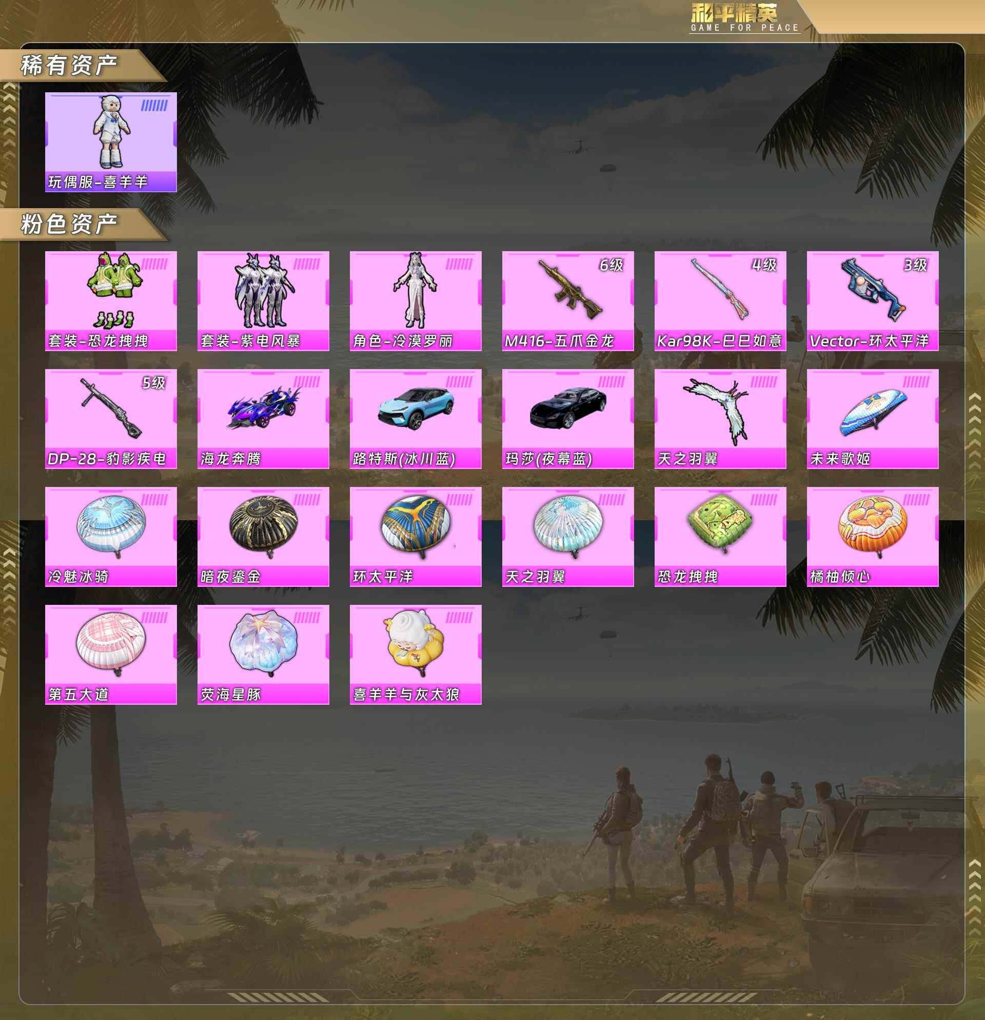 (3粉套4粉呛3载具)恐龙拽拽/紫电风暴/冷漠罗丽【呛皮】m4五爪金龙6级/98k巳巳如意4级/ect环太平洋3级/dp28豹影疾电5级【载具】海龙奔腾/路特斯冰川蓝/玛莎拉蒂夜幕蓝 没战神框 hp3352-1粉色飞行器-48939热力值-10王牌印记-93套装-134呛皮 【热门品类】:角色-军刀雅典娜 【粉色载具】:路特斯eletre(冰川蓝),玛莎拉蒂quattropte(夜幕蓝),海龙奔腾 【粉色套装】:粉装-恐龙拽拽,粉装-紫电风暴,角色-冷漠罗丽 【粉色呛皮等级】:m416-五爪金龙六级,vect-环太平洋三级,kar98k-巳巳如意四级,dp-28-豹影疾电五级 【粉色呛皮】:m416-五爪金龙,vect-环太平洋,kar98k-巳巳如意,dp-28-豹影疾电 【粉色飞行器】:天之羽翼飞行器 【粉色降落伞】:天之羽翼降落伞,恐龙拽拽降落伞,橘柚倾心降落伞,冷魅冰骑降落伞,环太平洋降落伞,暗夜鎏金降落伞,第五大道降落伞,未来歌姬降落伞,荧海星豚降落伞,喜羊羊与灰太狼降落伞 【稀有套装】:套装-糖糖葫芦,套装-青团波波,套装-燕燕于飞,套装-鱼渊荷华,角色-蜜桃派对,玩偶服-喜羊羊 【稀有呛皮】:akm-彩虹符号,akm-海渊国主,akm-环太平洋,akm-生命誓言,akm-破晓战魂,akm-虎虎生威,akm-霓虹街区,akm-龙的传人,m16a4-甜心亚梦,m16a4-红色方程式,scar-l-玉兔迎春,scar-l-红色方程式,scar-l-银碳小老虎,m416-糯团青竹,m416-紫翼圣骑,m416-红色方程式,m416-葫芦兄弟,groza-异彩先驱,groza-恐龙拽拽,groza-田园牧歌,aug-纯梦嫁纱,aug-耀粉歌者,q-飞驰魅影,m762-天降萌叽,m762-瑞龙福将,mk47-妙红点点,g36c-暗夜玫瑰,ac-val-天降萌叽,ac-val-甜心亚梦,蜜獾-娇憨猪猪,uzi-啾咪啾咪,uzi-天降萌叽,uzi-娇憨猪猪,uzi-炫彩节奏,ump45-蓝色火焰,ump45-诡娃娃,vect-暗夜玫瑰,vect-生命誓言,vect-田园牧歌,vect-音爆索尼克,汤姆逊-天降萌叽,汤姆逊-奇异狩猎者,汤姆逊-异彩先驱,汤姆逊-暗夜鎏金,汤姆逊-环太平洋,mp5k-异彩先驱,p90-飞驰魅影,kar98k-炫彩节奏,kar98k-蓝莓炮弹,kar98k-飞驰魅影,awm-绿意幻情,awm-盛世惊鸿,sks-炫彩节奏,vss-田园牧歌,mini14-异彩先驱,mini14-海渊国主,mini14-龙宫之主,mk14-暗星紫秘,win94-瑞龙福将,slr-娇憨猪猪,slr-彩虹符号,amr-妙红点点,s686-红色方程式,s1897-暗夜鎏金,s1897-碧影闪光,s1897-飞驰魅影,s12k-瑞龙福将,s12k-音爆索尼克,s12k-龙宫之主,s12k-垂柳戏鸭,s12k-娇憨猪猪,dbs-彩虹符号,dbs-暗星紫秘,dbs-甜心亚梦,spas-12-田园牧歌,m249-冷魅冰骑,m249-妙红点点,m249-彩虹符号,m249-破晓战魂,dp-28-彩虹符号,dp-28-甜心亚梦,dp-28-齐天大圣,mg3-妙红点点,mg3-幻世战舞者,mg3-瑞龙福将,mg3-第五大道,r45-幻彩电音 【其他套装】:套装-ss16特训,套装-ss17特训,套装-ss18特训,套装-ss19特训,套装-ss20特训,套装-ss21特训,套装-ss22特训,套装-ss23特训,套装-ss24特训,套装-ss25特训,套装-冷焰舞者,套装-北国孤狼,套装-夏日音浪,套装-完美偶像,套装-幻世战舞者,套装-柠萌假日,套装-格斗先锋,套装-湖蓝色名流,套装-滨海假日,套装-炫蓝之夏,套装-特训学院,套装-猎鹰,套装-猛禽,套装-甜蜜熊情侣,套装-白色伏地魔,套装-破蛋小黄鸡,套装-福星高照,套装-空投萌叽,套装-竞技名士,套装-红色运动,套装-绮丽涂鸦,套装-绯格组合,套装-缤纷果语,套装-蓝色运动,套装-虎虎生威吉莉,套装-酷潮明星,套装-长空猛禽,套装-魅力单车,套装-鹤鸣,套装-黑色伏地魔,角色-英勇保护者,套装-沙漠毒蛇,套装-贵族骑装,套装-清新柠檬,套装-冰川特警,套装-暗夜傀儡,角色-捷德奥特曼,套装-醒狮腾龙,套装-瑞龙福将,套装-团圆交子,套装-电音精灵,套装-冰爽风暴,套装-异彩先驱,套装-缤纷焰火,套装-霓虹极客,套装-炫光向阳,套装-极速竞梦,套装-飞驰魅影,套装-音速流光,套装-豚鼠丹丹,套装-猎梦纪元,套装-甜心亚梦,套装-虚音幻奏,套装-娇憨猪猪,套装-萌趣咩咩,套装-田园牧歌,套装-轻风白浪,套装-绚烂繁星,套装-熠彩粉晶,套装-妙红点点,套装-幻彩翩翩,套装-惊鸿侠骨 【稀有头盔】:梦幻火箭头盔(3级) 【稀有背包】:梦幻火箭背包(3级),梦幻火箭背包(1级),神秘黑猫背包(2级) 【营地id】:775944909