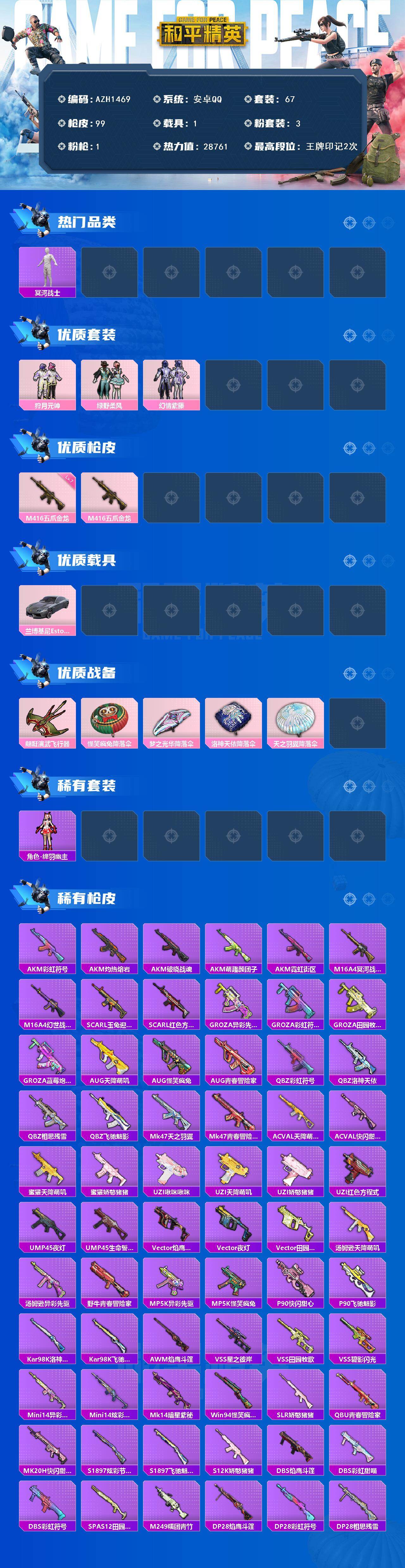安卓 手q【木乃伊满级五爪进来 3粉1呛1车】-3粉装-1特效呛-1载具-1粉色飞行器-28761热力值-2王牌印记-67套装-99呛皮 【热门品类】:套装-冥河战士,套装-龟仙人 【粉色载具】:兰博基尼estoque(银翼灰) 【粉色套装】:粉装-狩月元帅,粉装-绿野柔风,粉装-幻情紫藤 【粉色呛皮等级】:m416-五爪金龙七级 【粉色呛皮】:m416-五爪金龙 【粉色飞行器】:翩跹演武