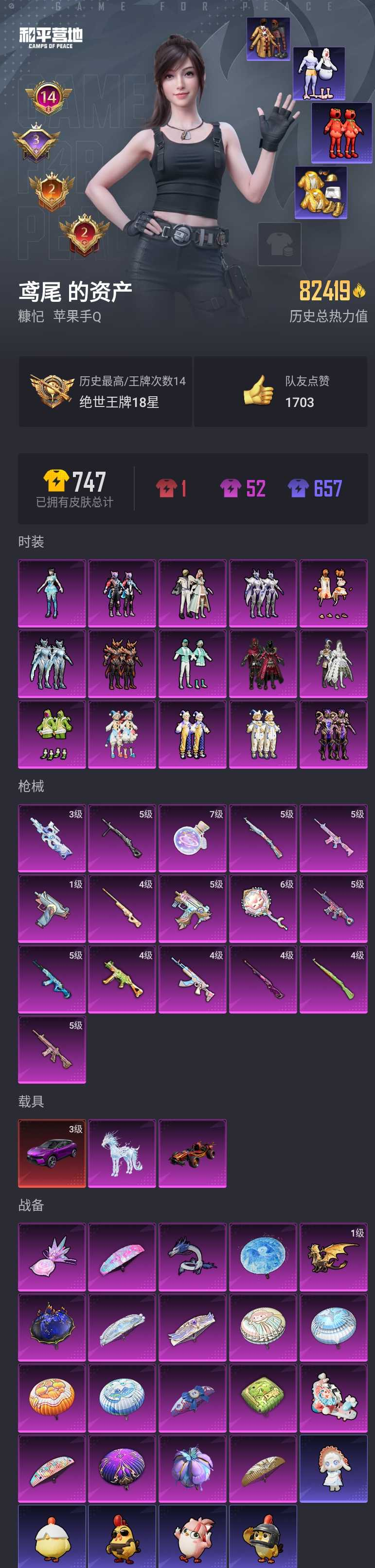 【和平精英】【lyhp17070】高印记 15粉装16特效呛3载具 红熊番茄 青涩年华 小鸟芋圆 派对舞王 5级m4心之恋语 5级akm百合物语 5级死噶童趣迷兔 4级ump45恐龙拽拽 3级p90魔童闹海 满级手蕾 3级路特斯 冰绡玉鳞 红蹦子 15粉装,16特效呛,3载具,历史最高段位:绝世王牌18星 王牌印记14次 热力值:82419,146套装,196呛械,275装备,104战备;套装:套装-冰霜白皇,套装-炙焰红王,套装-筑梦精灵,套装-暗星紫秘,套装-恐龙拽拽,套装-甜心娃娃,套装-精灵娃娃,套装-酣梦娃娃,套装-橘柚倾心,套装-薄荷物语,套装-赤焰黑爵,套装-冷魅冰骑,套装-紫电风暴,角色-异瞳寒姬,套装-幻影飞狐,套装-猎鹰,套装-黄色运动,套装-白色伏地魔,套装-竞技名士,套装-深蓝色名流,套装-酒红色名流,套装-湖蓝色名流,套装-黄色名流,套装-猛禽,套装-长空猛禽,套装-黎明保卫者,套装-旭日情侣,套装-灼焰舞者,套装-贵族骑装,套装-青春校园,套装-灰色格斗者,套装-甜蜜告白,套装-龙腾端午,套装-鹰眼刺客,套装-暗金炫舞,套装-蓝彩潮人,套装-魅力单车,套装-绮丽涂鸦,套装-坚韧舞者,套装-幻世保卫者,套装-派对舞王,套装-幻世战舞者,套装-冰凉西瓜,套装-金耀舞者,套装-蓝调潮人,套装-缤纷果语,套装-青涩年华,套装-极速红龙,套装-麻辣教官,套装-破蛋小黄鸡,套装-萌黄之夏,套装-海洋之心,套装-深海来使,套装-白糯汤圆,套装-战术大师,套装-ss12特训,套装-飞行日记,套装-ss13特训,套装-热情海星,套装-纯真浪花,套装-吉莉礼服,套装-水晶王族,套装-智慧隐士,套装-冰川谧蓝,套装-焰山流火,套装-豚鼠丹丹,套装-雪兔飞飞,套装-ss19特训,套装-沁蓝冰爽,套装-浓情蜜辣,套装-极速竞梦,套装-飞驰魅影,套装-音速流光,套装-茉莉之诺,套装-风铃甜诗,套装-炫蓝之夏,套装-ss21特训,套装-红熊茄茄,套装-ss22特训,套装-光之冒险,套装-ss23特训,套装-王牌教练,套装-柠萌假日,套装-ss24特训,套装-龟仙人,套装-ss25特训,套装-香桃花海,套装-ss26特训,套装-快闪甜心,套装-春光漫游,套装-空岛之星,套装-贝斯之夜,套装-焰鹰斗篷,套装-幻羽潜行,套装-ss27特训,套装-恋语绒绒,套装-老实芭蕉,套装-ss28特训,套装-铁血战翼,套装-街头风暴,套装-蝶变,套装-ss29特训,套装-雏菊兔兔,套装-萝兰蝴蝶,套装-异域银装,角色-摩登魅猫,角色-都市丽猫,套装-ss30特训,套装-青团波波,套装-棉花软糖,套装-糖糖葫芦,套装-小鸟芋圆,套装-绒宝小鹅,套装-ss31特训,套装-鱼渊荷华,套装-燕燕于飞,套装-智谋强哥,套装-紫幽梦,套装-粉恋花,套装-ss33特训,套装-云朵鹅,套装-巳巳如意,套装-ss32特训,套装-彩虹兔,套装-蓝冰羽,套装-顶瓜瓜,套装-雪绒豹,套装-大橘大利,套装-霓虹热舞,套装-炫彩糖果,套装-星影赞美诗,玩偶服-懒羊羊,套装-元气之梦,套装-ss34特训,套装-擎苍青焰,套装-朱霞炽焰,套装-游乐,套装-凌霄紫焰,套装-薄荷星砂,套装-ss35特训,套装-午间小调,套装-秘语星愿,套装-风迹短诗,套装-粉黛兰香,套装-ss36特训,套装-萌鸡速递;呛皮:蜜獾-天降萌叽,蜜獾-糖糖葫芦,蜜獾-风迹短诗,蜜獾-冰澜龙吟,蜜獾-乌木金纹,mk47-林间仙鹿,mk47-洛神天依,mk47-乌木金纹,mk47-风迹短诗,famas-霓彩脉冲,famas-乌木金纹,m16a4-红色方程式,m16a4-幻世战舞者,m16a4-千金淑猫,4级m762-甜心娃娃,m762-奇异狩猎者,m762-橘柚倾心,m762-雏菊兔兔,m762-云朵鹅,m762-登顶巅峰,q-潮汐统领,q-彩虹符号,q-飞驰魅影,q-纯真浪花,aug-甜蜜菠萝,aug-耀粉歌者,aug-异域银装,aug-冰晶雪宝,5级scar-l-童趣迷兔,scar-l-炫彩节奏,scar-l-彩虹符号,scar-l-玉兔迎春,ac-val-乌木金纹,ac-val-天降萌叽,ac-val-快闪甜心,5级akm-百合蜜语,akm-破晓战魂,akm-霓虹街区,akm-涂鸦街区,akm-恐龙拽拽,akm-筑梦精灵,akm-龙的传人,akm-霓彩节奏,akm-霓彩脉冲,5级m416-心之恋语,5级m416-电玩时刻,m416-蓝色火焰,m416-潮汐统领,m416-暗星紫秘,m416-糯团青竹,g36c-冷魅冰骑,g36c-星穹咏叹调,arx-凌霄紫焰,groza-恐龙拽拽,4级m24-暗星紫秘,m24-百合蜜语,m24-乌木金纹,4级kar98k-绿意幻情,5级kar98k-巳巳如意,kar98k-影袭,kar98k-彩虹符号,kar98k-炫彩节奏,kar98k-飞驰魅影,kar98k-顶峰精英,svd-云朵鹅,svd-霓彩脉冲,莫辛纳甘-乌木金纹,莫辛纳甘-风迹短诗,4级awm-橘柚倾心,awm-恐龙拽拽,awm-焰鹰斗篷,awm-纯真浪花,awm-乌木金纹,amr-喜羊羊与灰太狼,amr-乌木金纹,win94-乌木金纹,m200-乌木金纹,mk14-童趣迷兔,mk14-暗星紫秘,mk14-乌木金纹,mk14-紫幽梦,mk14-薄荷星砂,mk20-h-快闪甜心,mk20-h-糖糖葫芦,mk20-h-圣域龙灵,mk20-h-乌木金纹,vss-彩虹符号,slr-霓彩脉冲,mini14-炫彩节奏,mini14-甜心娃娃,mini14-筑梦精灵,mini14-香桃花海,mini14-雏菊兔兔,sks-心之恋语,mk12-风迹短诗,vect-生命誓言,vect-百合蜜语,vect-焰鹰斗篷,vect-燕燕于飞,3级p90-魔童闹海 敖丙,p90-飞驰魅影,p90-筑梦精灵,p90-快闪甜心,p90-玩趣呆呆,p90-巳巳如意,p90-乌木金纹,js9-凌霄紫焰,5级uzi-绮梦青鸾,1级uzi-筑梦精灵,uzi-影袭,uzi-啾咪啾咪,uzi-炫彩糖果,aks-74u-鸡智如我,aks-74u-乌木金纹,汤姆逊-林间仙鹿,汤姆逊-纯真浪花,汤姆逊-幽焰骑士,汤姆逊-乌木金纹,野牛-雏菊兔兔,野牛-燕燕于飞,4级ump45-恐龙拽拽,ump45-生命誓言,ump45-海盐豹豹,ump45-糖糖葫芦,mp5k-乌木金纹,s1897-潮汐统领,s1897-飞驰魅影,s1897-紫幽梦,s1897-糯团青竹,s686-未来战士,s686-生命誓言,s686-橘柚倾心,s686-千金淑猫,s686-巳巳如意,spas-12-燕燕于飞,spas-12-云朵鹅,spas-12-乌木金纹,dbs-暗星紫秘,dbs-焰鹰斗篷,dbs-幻彩电音,dbs-风迹短诗,dbs-乌木金纹,s12k-童趣迷兔,s12k-玩趣