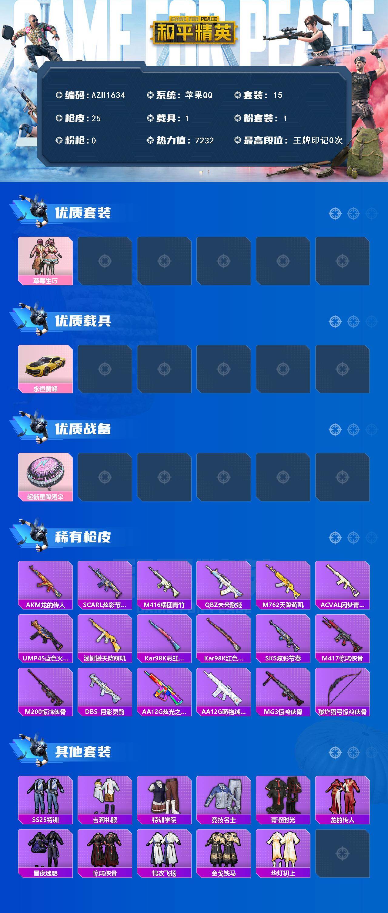 苹果 手q【草莓生巧 1载具】1粉装-0特效呛-1载具-0粉色飞行器-7232热力值-0王牌印记-15套装-25呛皮 【粉色载具】:永恒黄蜂 【粉色套装】:粉装-草莓生巧 【粉色降落伞】:超新星降落伞 【稀有呛皮】:akm-龙的传人,scar-l-炫彩节奏,m416-糯团青竹,q-未来歌姬,m762-天降萌叽,ac-val-闲梦青缨,ump45-蓝色火焰,汤姆逊-天降萌叽,kar98k-彩