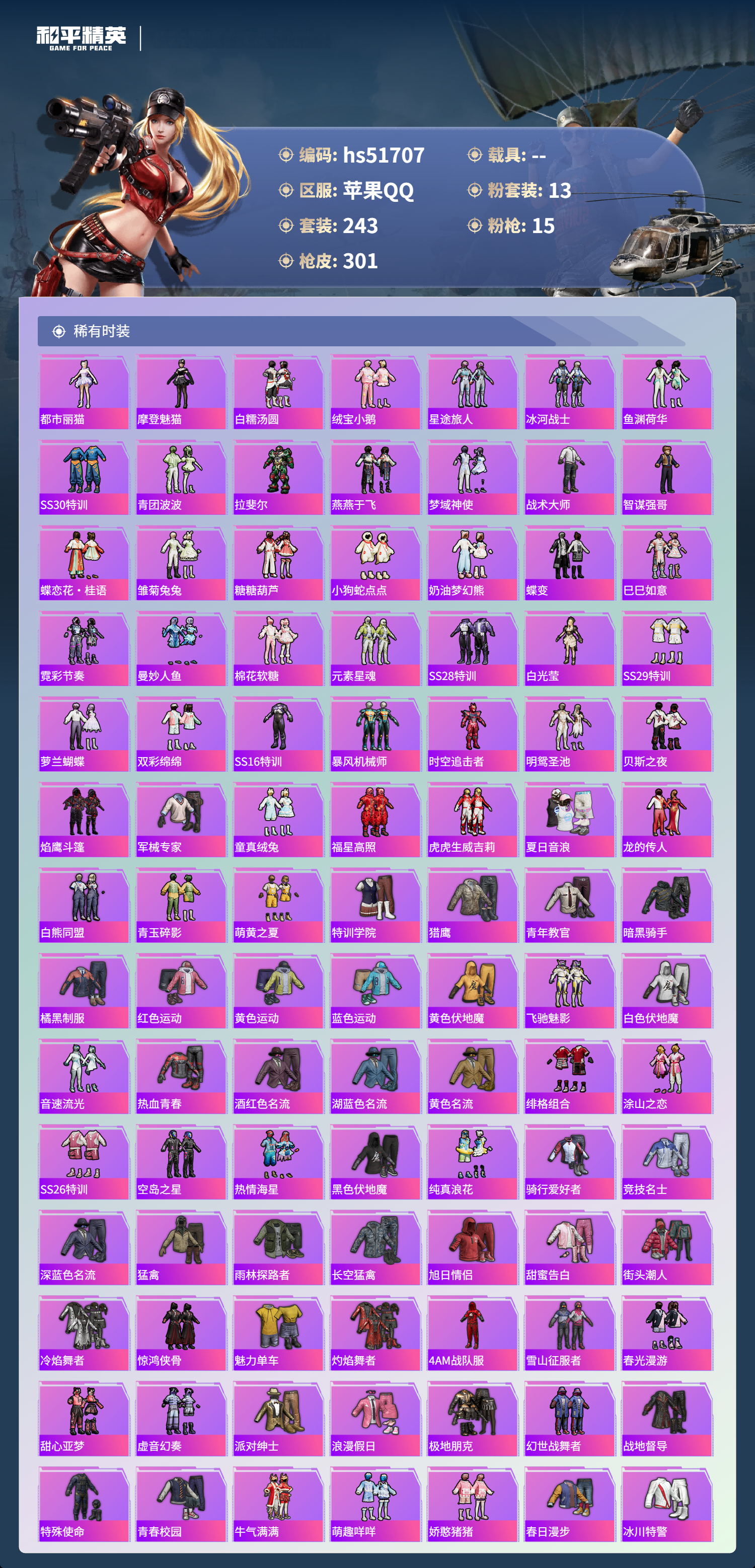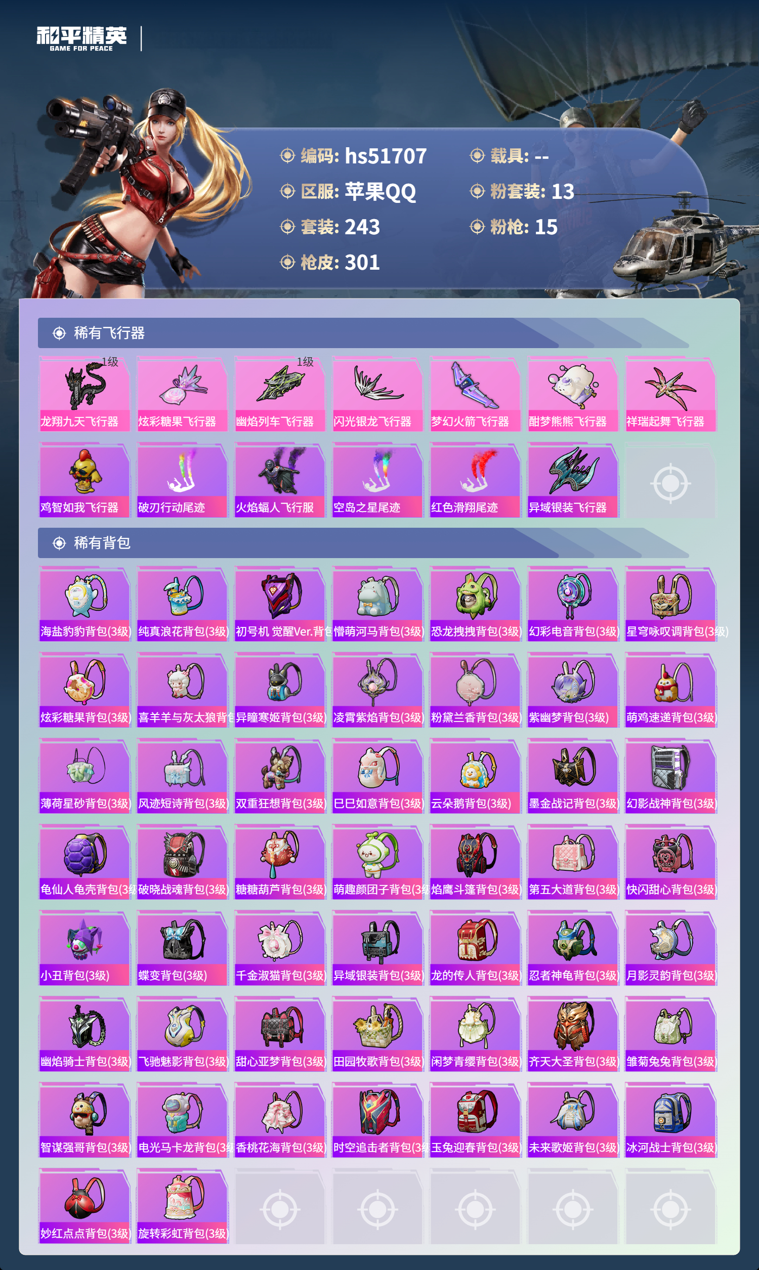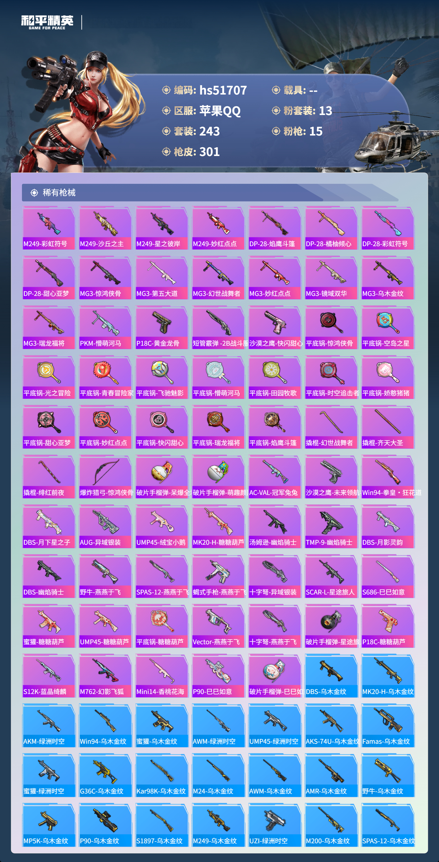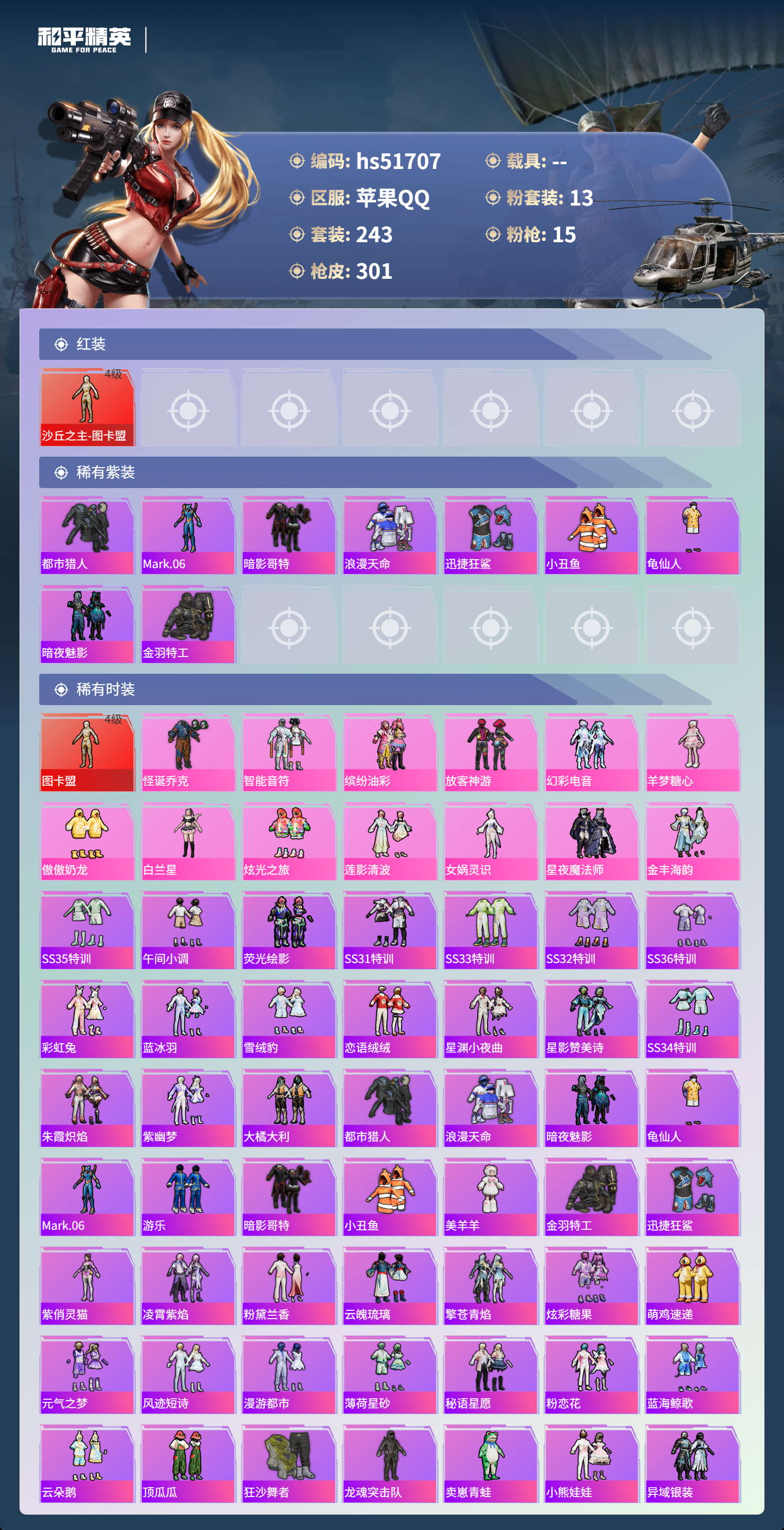 hs51707 苹果手q-17王牌印记-有战神框-1红装-13粉装-15特效呛-热力值-243套装-301呛皮-5卓越印记-2传奇印记【1红装】沙丘之主-图卡盟/4级【13粉装】套装-傲傲奶龙套装-星夜魔法师套装-放客神游套装-莲影清波套装-怪诞乔克套装-幻彩电音套装-智能音符角色-女娲灵识套装-炫光之旅套装-金丰海韵角色-白兰星角色-羊梦糖心套装-缤纷油