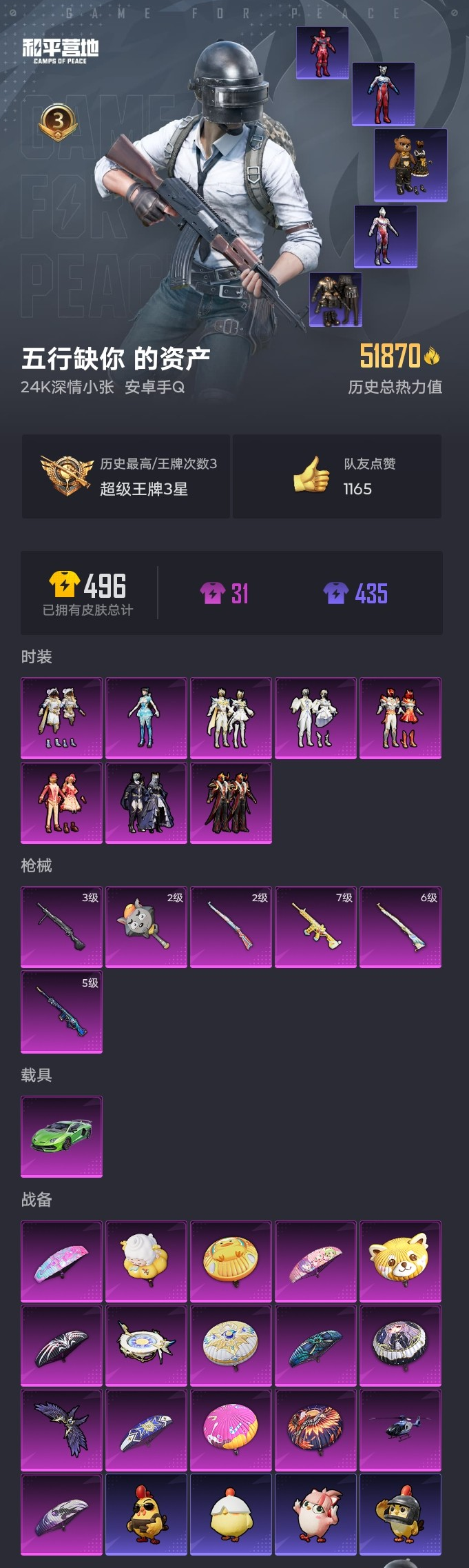 【和平精英】【lyhp17250】8粉6特1载具 浪漫波比 8粉装,6特效呛,1载具,历史最高段位:超级王牌3星 王牌印记3次 热力值:51870,103套装,138呛械,157装备,77战备;套装:套装-星夜魔法师,套装-炙焰牛王,套装-圣光天使,套装-霞光圣骑,套装-寒光使者,套装-妙趣可丽,角色-异瞳寒姬,套装-极意拳锋,套装-黑色伏地魔,套装-骑行爱好者,套装-竞技名士,套装-深蓝色名流,套装-酒红色名流,套装-湖蓝色名流,套装-黄色名流,套装-长空猛禽,套装-漫步者,套装-冷焰舞者,套装-特战装甲,套装-燃烧卡路里,套装-决胜时刻,套装-魅力单车,套装-竞技达人朋克,套装-都市漫游者,套装-幻世保卫者,套装-都市魅力,套装-极地朋克,套装-缤纷果语,套装-极速红龙,套装-海上生明月,套装-麻辣教官,套装-初雨海棠,套装-黑夜传说,套装-破蛋小黄鸡,套装-疯狂小兔子,套装-浪漫波比,套装-北国孤狼,套装-霓虹街区,套装-神秘黑猫,套装-萌黄之夏,套装-特种颜团子,套装-战术大师,套装-牛气冲天,套装-ss18特训,套装-耀粉歌者,套装-飞行日记,套装-电音精灵,角色-迪迦奥特曼,角色-赛罗奥特曼,套装-吉莉礼服,套装-ss15特训,套装-ss16特训,套装-暴风机械师,套装-时空追击者,套装-暗夜魅影,套装-暗夜傀儡,套装-极速先驱,套装-ss17特训,套装-醒狮腾龙,套装-瑞龙福将,套装-团圆交子,套装-爆裂葡萄,套装-福星高照,套装-虎虎生威吉莉,套装-异彩先驱,套装-霓虹极客,套装-空投萌叽,套装-ss19特训,套装-ss20特训,套装-浑天鲲鹏,套装-软羊咩咩,套装-猎梦纪元,套装-甜心亚梦,套装-虚音幻奏,套装-ss21特训,套装-暖心熊熊,套装-萌趣咩咩,套装-娇憨猪猪,套装-玉兔迎春,套装-ss22特训,套装-和煦暖阳,套装-田园牧歌,套装-轻风白浪,套装-光之冒险,套装-ss23特训,套装-王牌教练,套装-柠萌假日,套装-龟仙人,套装-ss25特训,套装-龙的传人,套装-ss26特训,套装-空岛之星,套装-ss27特训,玩偶服-美羊羊,套装-ss34特训,套装-擎苍青焰,套装-朱霞炽焰,套装-凌霄紫焰,套装-ss35特训,套装-午间小调,套装-秘语星愿,套装-风迹短诗,套装-萌鸡速递;呛皮:aug-幻影战神,aug-怪笑疯兔,aug-圣光天使,aug-海螺星光,aug-天降萌叽,m16a4-甜心亚梦,m16a4-幻世战舞者,scar-l-暗夜玫瑰,scar-l-彩虹符号,scar-l-玉兔迎春,scar-l-海盐豹豹,7级m416-暖熊萌萌,m416-蓝色火焰,m416-红色方程式,m416-暗夜行者,m416-糯团青竹,m416-乌木金纹,mk47-洛神天依,mk47-乌木金纹,mk47-风迹短诗,ac-val-甜心亚梦,ac-val-乌木金纹,ac-val-天降萌叽,akm-生命誓言,akm-彩虹符号,akm-虎虎生威,akm-龙的传人,akm-霓彩脉冲,蜜獾-娇憨猪猪,蜜獾-天降萌叽,蜜獾-风迹短诗,groza-影袭,groza-异彩先驱,groza-田园牧歌,m762-烈焰拳霸,m762-瑞龙福将,m762-风花雪月,m762-暖熊萌萌,m762-天降萌叽,arx-凌霄紫焰,g36c-时空追击者,g36c-暗夜玫瑰,g36c-炙焰牛王,g36c-乌木金纹,q-彩虹符号,q-电玩视界,q-妙趣可丽,famas-霓彩脉冲,莫辛纳甘-乌木金纹,莫辛纳甘-风迹短诗,6级kar98k-圣光天使,2级kar98k-巳巳如意,kar98k-电玩视界,kar98k-乌木金纹,awm-炙焰牛王,win94-瑞龙福将,win94-乌木金纹,amr-喜羊羊与灰太狼,amr-乌木金纹,mk12-风迹短诗,sks-时空追击者,sks-糯团青竹,mk14-乌木金纹,mini14-炫彩节奏,mini14-异彩先驱,mini14-星夜魔法师,qbu-烈焰拳霸,5级slr-暗夜玫瑰,slr-娇憨猪猪,slr-彩虹符号,slr-霓彩脉冲,vss-田园牧歌,mk20-h-狂鲨锋刃,js9-凌霄紫焰,uzi-影袭,uzi-炫彩节奏,uzi-烈焰拳霸,uzi-娇憨猪猪,uzi-天降萌叽,野牛-电玩视界,野牛-乌木金纹,p90-玩趣呆呆,p90-乌木金纹,ump45-生命誓言,ump45-春暖花开,ump45-时空追击者,mp5k-蓝莓炮弹,mp5k-异彩先驱,mp5k-乌木金纹,aks-74u-乌木金纹,vect-生命誓言,vect-暗夜玫瑰,vect-田园牧歌,汤姆逊-异彩先驱,汤姆逊-暗夜鎏金,s1897-炫彩节奏,s1897-星夜魔法师,s1897-乌木金纹,s12k-瑞龙福将,s12k-暖熊萌萌,s12k-娇憨猪猪,s12k-霓彩脉冲,s686-生命誓言,s686-葫芦兄弟,s686-王牌投手,dbs-时空追击者,dbs-甜心亚梦,dbs-圣光天使,dbs-歌者泠鸢,dbs-风迹短诗,spas-12-田园牧歌,3级dp-28-豹影疾电,dp-28-彩虹符号,dp-28-甜心亚梦,mg3-瑞龙福将,mg3-幻世战舞者,mg3-乌木金纹,m249-彩虹符号,m249-糯团青竹,mg-36-凌霄紫焰,信号呛-异瞳寒姬,p92-凌霄紫焰,电击呛-喜羊羊与灰太狼,2级平底锅-喜羊羊与灰太狼,平底锅-飞行日记,平底锅-时空追击者,平底锅-瑞龙福将,平底锅-异彩先驱,平底锅-青春物语,平底锅-甜心亚梦,平底锅-娇憨猪猪,平底锅-田园牧歌,平底锅-光之冒险,平底锅-空岛之星,平底锅-凌霄紫焰,破片手留单-拽到爆炸,破片手留单-火尖莲影,爆炸猎弓-喜羊羊与灰太狼;载具:兰博基尼aventad svj翡翠绿;降落伞:星夜魔法师飞行翼,圣光天使飞行器,光之冒险尾迹,鸡智如我飞行器;滑翔尾迹:空客h135-蔚蓝之翼; 详情看图
