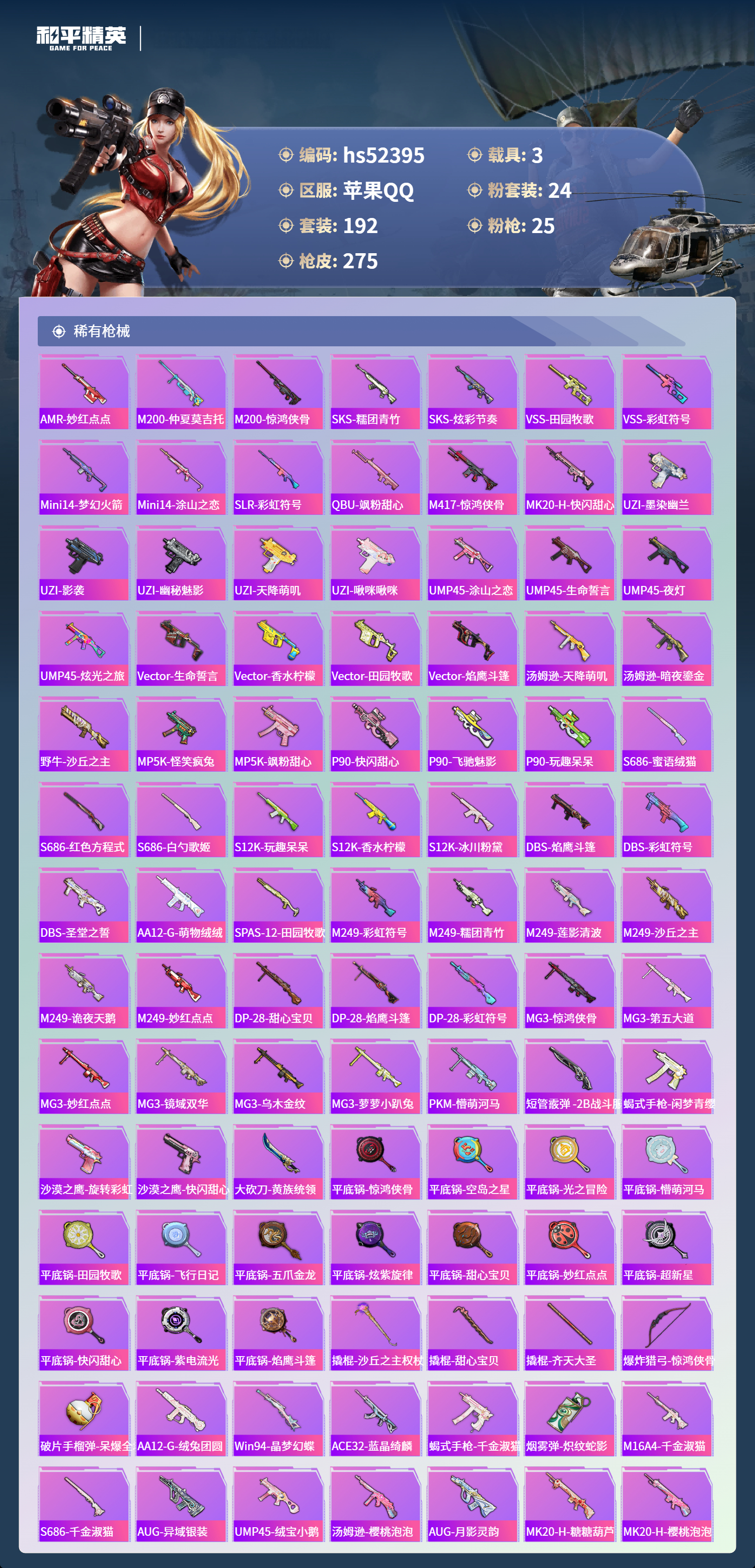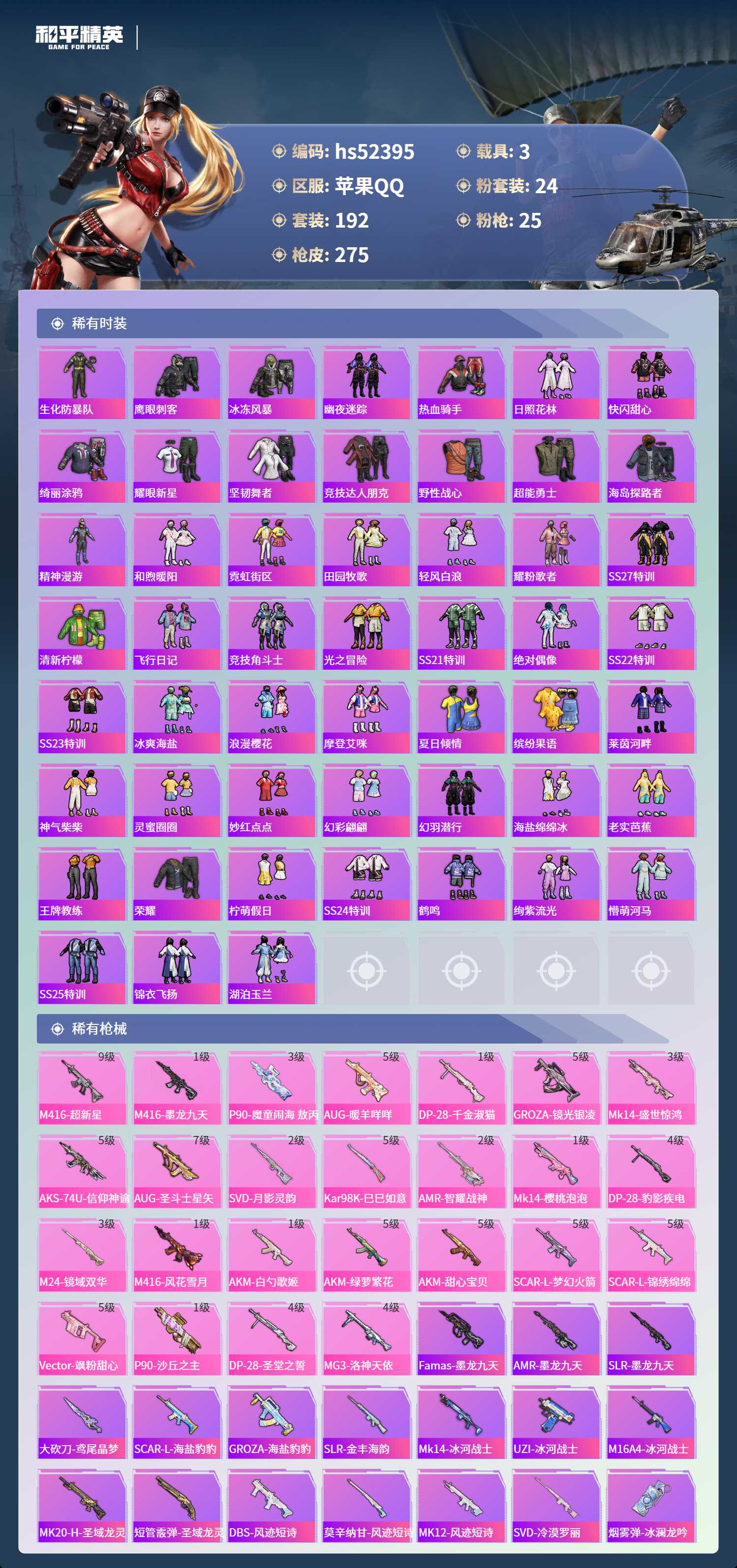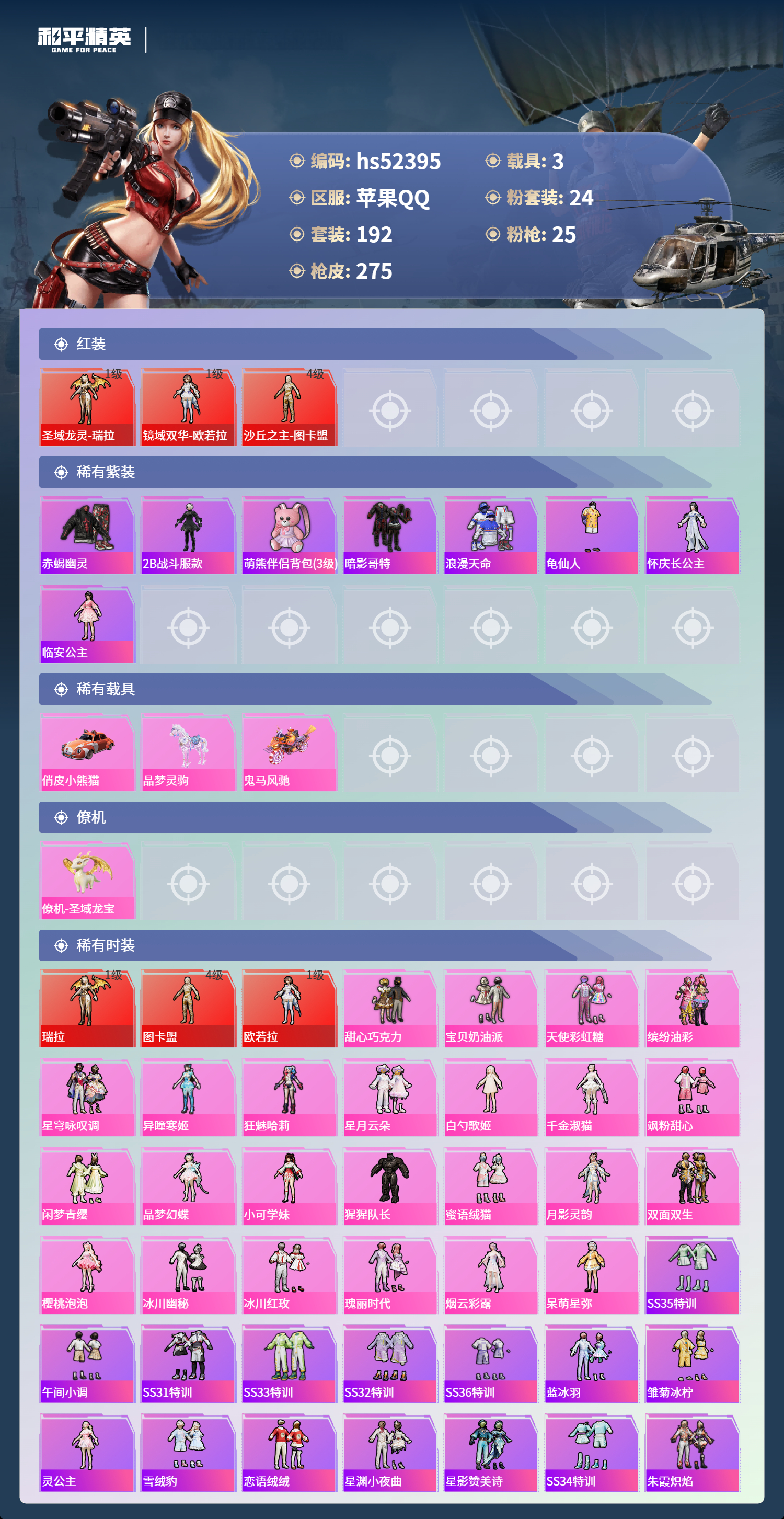 hs52395 苹果手q-14王牌印记-有战神框-3红装-24粉装-25特效呛-3载具-热力值-192套装-275呛皮-5卓越印记-4传奇印记【3红装】镜域双华-欧若拉/1级圣域龙灵-瑞拉/1级沙丘之主-图卡盟/4级【24粉装】套装-天使彩虹糖套装-双面双生角色-狂魅哈莉套装-飒粉甜心套装-甜心巧克力套装-冰川幽秘套装-星穹咏叹调角色-月影灵韵套装-缤纷油彩套