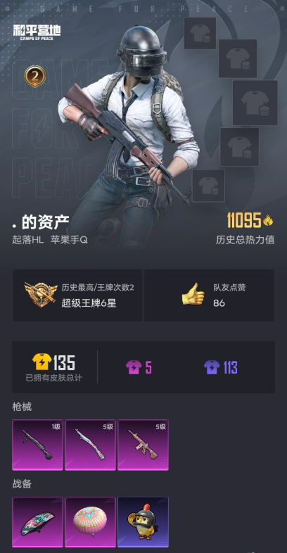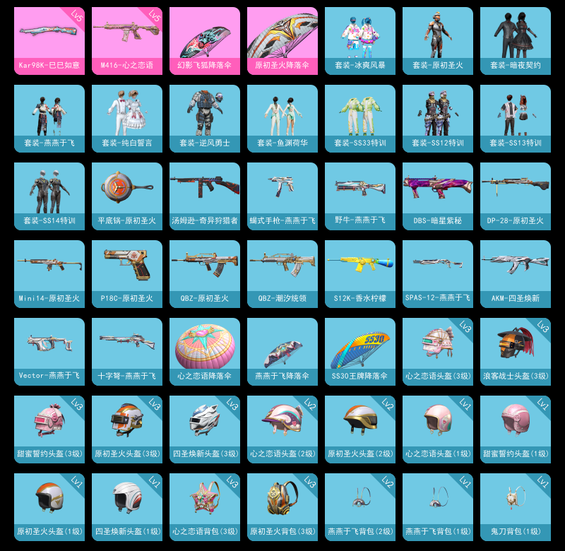【和平精英】【lyhp17688】3特 5级心之恋语 0粉装,3特效呛,0载具,历史最高段位:超级王牌6星 王牌印记2次 热力值:11095,24套装,37呛械,44装备,18战备;套装:套装-湖蓝色名流,套装-特殊使命,套装-缤纷果语,套装-鹤鸣,套装-暗夜契约,套装-纯白誓言,套装-萌黄之夏,套装-牛气满满,套装-原初圣火,套装-逆风勇士,套装-战术大师,套装-ss12特训,套装-牛气冲天,套装-ss13特训,套装-ss14特训,套装-冰爽风暴,套装-玉兔迎春,套装-ss30特训,套装-ss31特训,套装-鱼渊荷华,套装-燕燕于飞,套装-ss33特训,套装-巳巳如意,套装-ss32特训;呛皮:akm-四圣焕新,5级m416-心之恋语,m762-牛气冲天,aug-紫晶流影,scar-l-黄金龙骨,scar-l-炫彩节奏,ac-val-天降萌叽,q-潮汐统领,q-原初圣火,awm-乌木金纹,5级kar98k-巳巳如意,m200-乌木金纹,sks-心之恋语,vss-香桃花海,mini14-原初圣火,mini14-炫彩节奏,汤姆逊-奇异狩猎者,汤姆逊-乌木金纹,ump45-生命誓言,p90-巳巳如意,vect-彩虹符号,vect-燕燕于飞,野牛-燕燕于飞,spas-12-燕燕于飞,spas-12-乌木金纹,dbs-暗星紫秘,s12k-香水柠檬,m249-乌木金纹,1级dp-28-豹影疾电,dp-28-原初圣火,dp-28-彩虹符号,mg3-幻世战舞者,蝎式手呛-燕燕于飞,p18c-原初圣火,平底锅-原初圣火,十子怒-燕燕于飞,破片手留单-巳巳如意; 详情看图