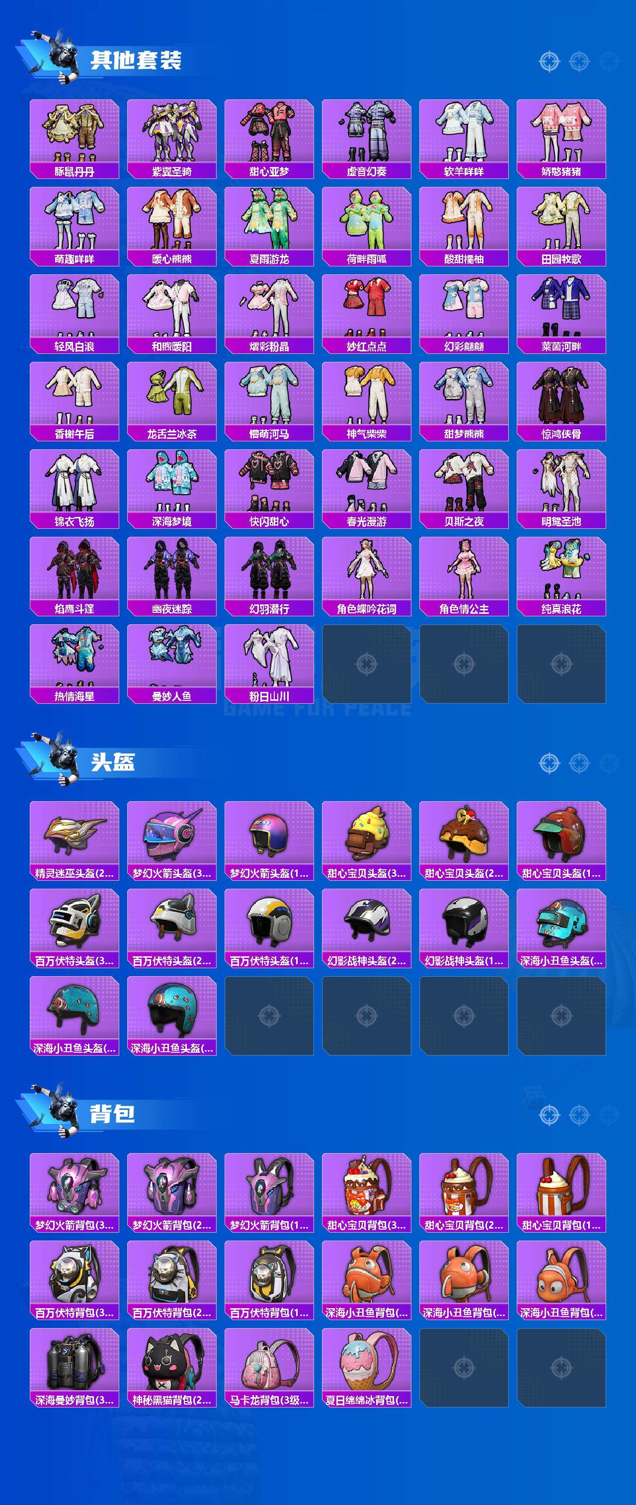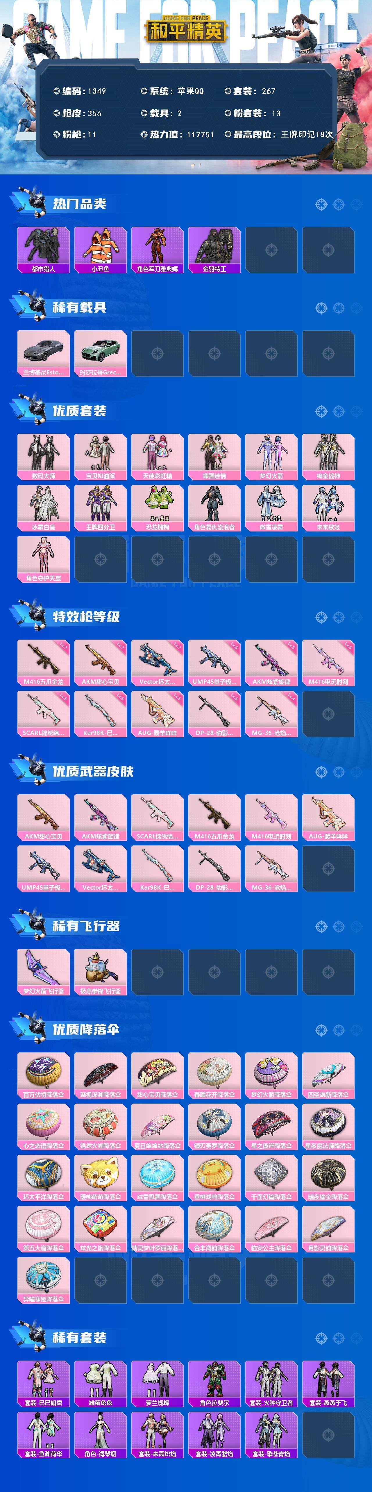 2载具-267套装-356呛皮-267套装/呛械11/装备438/载具2/战备256/王牌印记18/热力值/七级akm-甜心宝贝/五级akm-炫紫旋律/五级scar-l-锦绣绵绵/七级m416-五爪金龙/五级m416-电玩时刻/五级aug-暖羊咩咩/五级ump45-量子极限/七级vect-环太平洋/五级kar98k-巳巳如意/五级dp-28-豹影疾电/四级mg-36-沧焰双生/粉装-梦幻火箭/套装-浪漫天命/