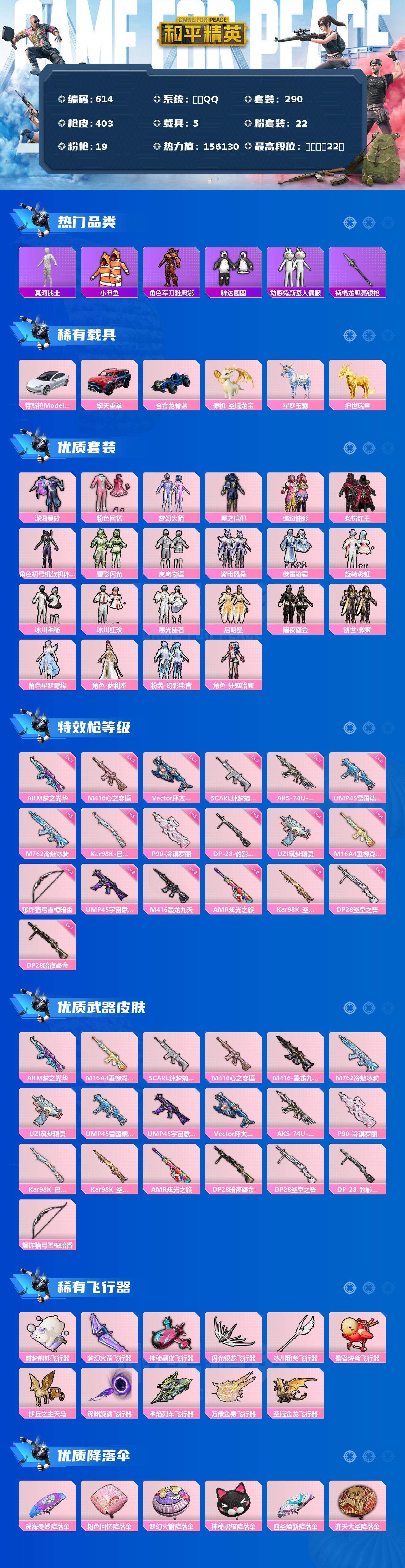 5载具-290套装-403呛皮-290套装/呛械19/装备543/载具5/战备298/王牌印记22/热力值/七级akm-梦之光华/四级m16a4-垂柳戏鸭/七级scar-l-纯梦嫁纱/七级m416-心之恋语/三级m416-墨龙九天/五级m762-冷魅冰骑/四级uzi-筑梦精灵/六级ump45-雪国精灵/三级ump45-宇宙意志/七级vect-环太平洋/七级aks-74u-信仰神谕/五级p90-冷漠罗丽/五级k