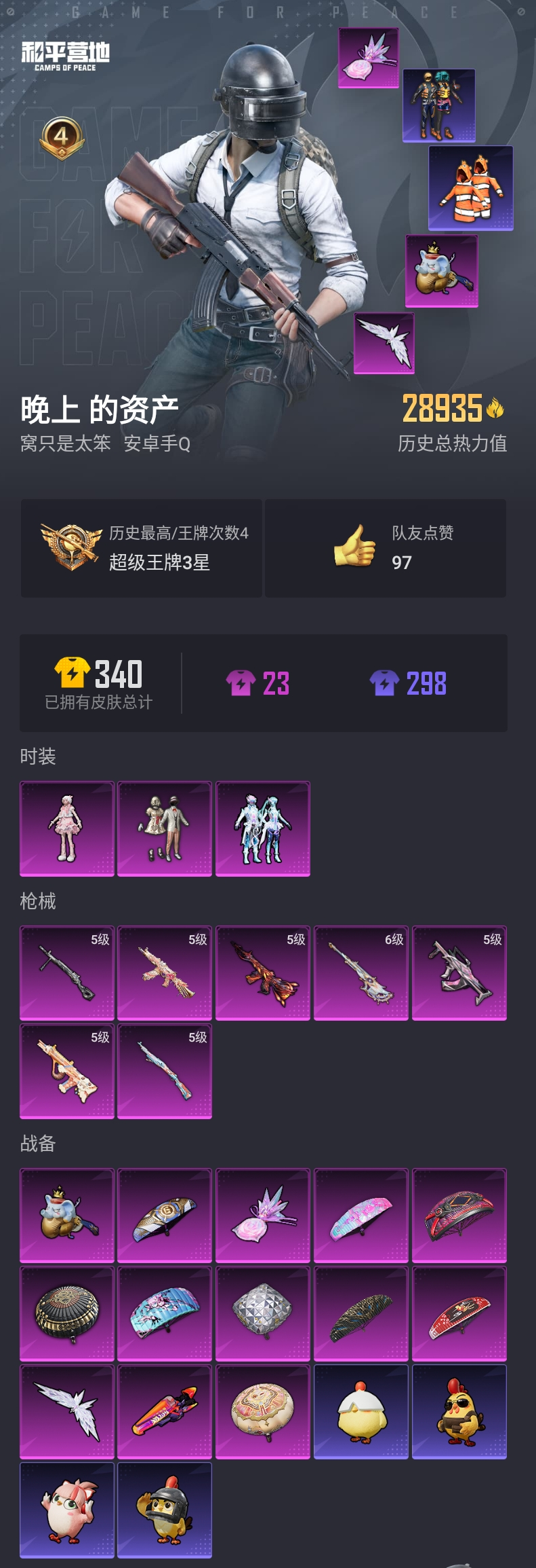 【和平精英】【lyhp17780】小女号 3粉7特 奶油 小丑鱼 m4风花雪月 3粉装,7特效呛,0载具,历史最高段位:超级王牌3星 王牌印记4次 热力值:28935,60套装,98呛械,113装备,57战备;套装:套装-宝贝奶油派,套装-幻彩电音,角色-羊梦糖心,套装-猎鹰,套装-白色伏地魔,套装-黑色伏地魔,套装-竞技名士,套装-旭日情侣,套装-水银刺客,套装-特战装甲,套装-春日漫步,套装-沙漠毒蛇,套装-冷酷挑战者,套装-魅力单车,套装-绮丽涂鸦,套装-超能勇士,套装-幻世保卫者,套装-森林游猎者,套装-甜蜜菠萝,套装-深海小丑鱼,套装-缤纷果语,套装-滨海厨神,套装-风暴特警,套装-冰川特警,套装-小丑鱼,套装-鹤鸣,套装-战术大师,套装-星梦畅游,套装-龙舌兰冰茶,套装-王牌教练,套装-锦衣飞扬,套装-漫游都市,套装-恋语绒绒,角色-绯色魅影,套装-ss31特训,套装-鱼渊荷华,套装-燕燕于飞,套装-智谋强哥,角色-海琴烟,套装-紫幽梦,套装-粉恋花,套装-ss33特训,套装-云朵鹅,套装-巳巳如意,套装-ss32特训,套装-蓝冰羽,套装-顶瓜瓜,套装-雪绒豹,套装-大橘大利,套装-星渊小夜曲,套装-炫彩糖果,套装-星影赞美诗,套装-元气之梦,套装-ss34特训,套装-擎苍青焰,套装-朱霞炽焰,套装-凌霄紫焰,套装-ss35特训,套装-ss36特训,套装-萌鸡速递;呛皮:5级aug-暖羊咩咩,aug-耀粉歌者,aug-异域银装,aug-冰晶雪宝,aug-紫晶流影,scar-l-彩虹符号,scar-l-星途旅人,m762-彩虹符号,m762-云朵鹅,5级groza-镜光银凌,groza-荧海星豚,5级m416-风花雪月,m416-蓝色火焰,ac-val-天降萌叽,g36c-星穹咏叹调,蜜獾-乌木金纹,mk47-虚空骇客,arx-凌霄紫焰,akm-破晓战魂,akm-涂鸦街区,akm-霓彩脉冲,famas-乌木金纹,svd-云朵鹅,5级kar98k-巳巳如意,kar98k-金玉无双,kar98k-星穹咏叹调,awm-天降萌叽,6级amr-智耀战神,m200-乌木金纹,win94-乌木金纹,mini14-金玉无双,mini14-千面幻镜,mini14-鸡智如我,slr-圣穹绘梦,slr-霓彩脉冲,mk14-冰河战士,mk14-紫幽梦,mk14-薄荷星砂,sks-金玉无双,mk12-乌木金纹,mk20-h-狂鲨锋刃,js9-凌霄紫焰,p90-巳巳如意,uzi-金玉无双,uzi-冰河战士,uzi-炫彩糖果,野牛-燕燕于飞,汤姆逊-炫彩节奏,汤姆逊-智耀战神,ump45-金玉无双,ump45-绒宝小鹅,5级aks-74u-星穹咏叹调,aks-74u-鸡智如我,aks-74u-乌木金纹,vect-生命誓言,vect-金玉无双,vect-燕燕于飞,s12k-夜灯,s12k-霓彩脉冲,s686-奇异狩猎者,s686-生命誓言,s686-巳巳如意,dbs-彩虹符号,dbs-荧海星豚,s1897-紫幽梦,s1897-糯团青竹,spas-12-燕燕于飞,spas-12-狂鲨锋刃,spas-12-云朵鹅,spas-12-乌木金纹,pkm-啾咪啾咪,pkm-紫幽梦,mg-36-凌霄紫焰,5级dp-28-豹影疾电,mg3-幻世战舞者,mg3-霓彩脉冲,p92-紫幽梦,p92-凌霄紫焰,沙墨之鹦-云朵鹅,蝎式手呛-燕燕于飞,短管霰弹-竹节火铳,短管霰弹-星穹咏叹调,信号呛-异瞳寒姬,平底锅-紫幽梦,平底锅-属我最6,平底锅-凌霄紫焰,大砍刀-云朵鹅,铝热弹-炫彩糖果,破片手留单-呆爆全场,破片手留单-海盐豹豹,破片手留单-拽到爆炸,破片手留单-巳巳如意,盐雾蛋-冰氧夏日,十子怒-燕燕于飞,十子怒-异域银装,爆炸猎弓-虚空骇客,突击盾牌-智趣喵喵,突击盾牌-绝对恒星;降落伞:镜光幻境飞行翼,霓虹漫游飞行器,炫彩糖果飞行器,极意拳锋飞行器,粉色滑翔尾迹,异域银装飞行器,破刃行动尾迹; 详情看图