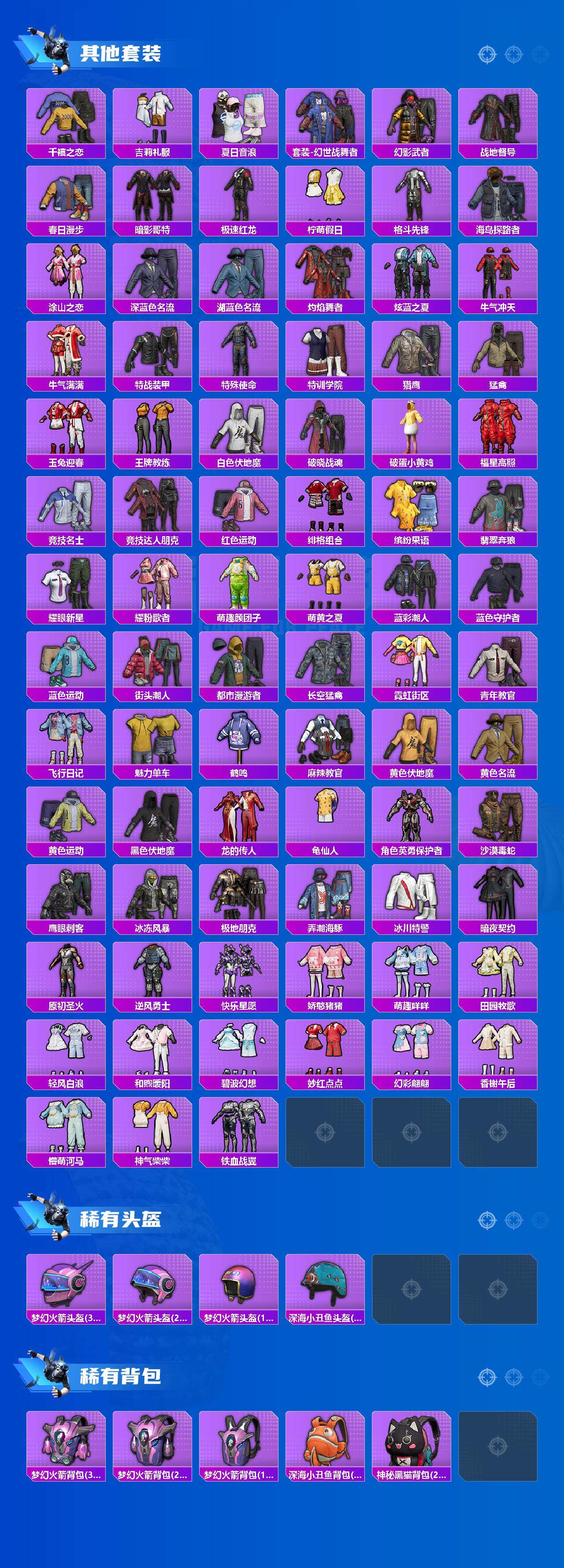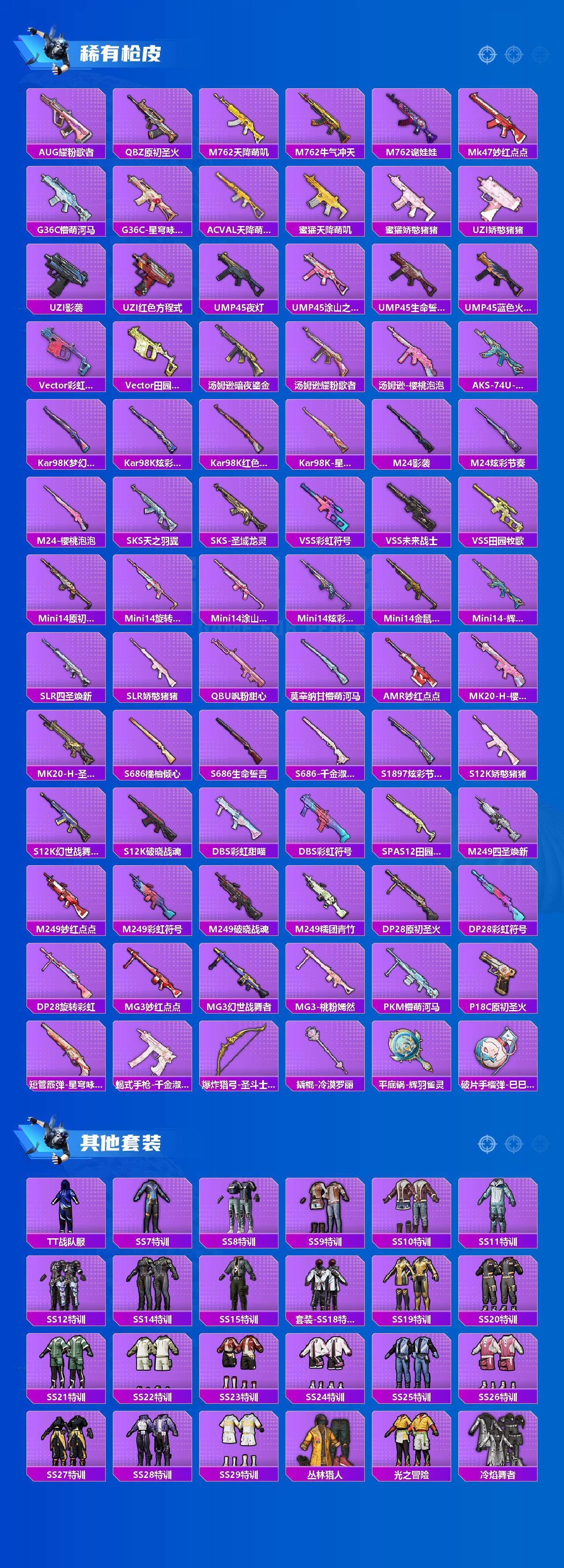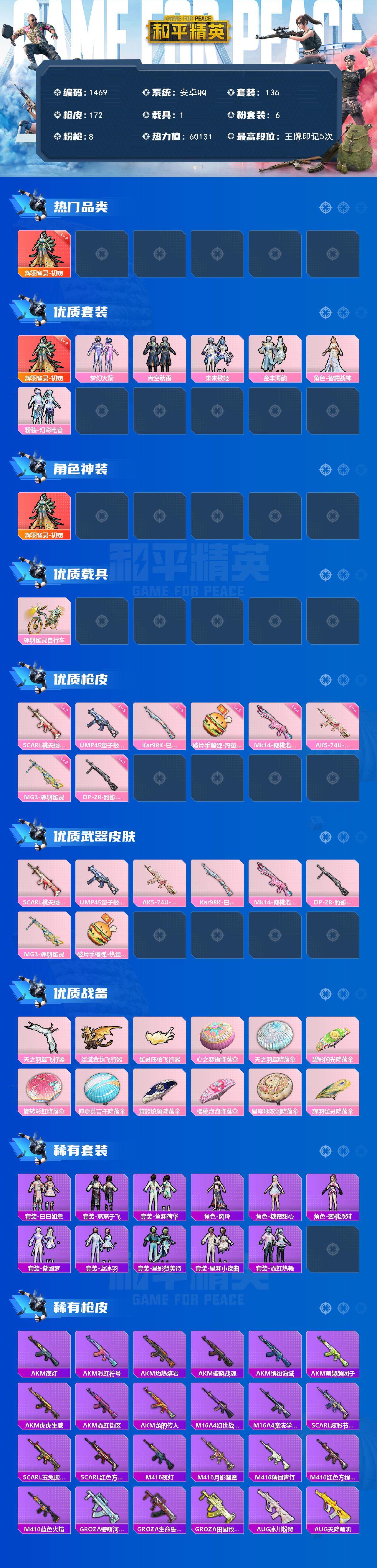 1载具-136套装-172呛皮-136套装/呛械8/装备219/载具1/战备119/王牌印记5/热力值60131/七级scar-l-桃夭倾城/五级ump45-量子极限/四级aks-74u-星穹咏叹调/五级kar98k-巳巳如意/四级mk14-樱桃泡泡/一级dp-28-豹影疾电/三级mg3-辉羽雀灵/五级破片手留单-热量炸弹/二级辉羽雀灵-初翊/辉羽雀灵-初翊/粉装-梦幻火箭/套装-龟仙人/套装-暗影哥特/辉羽雀灵自行车/梦幻