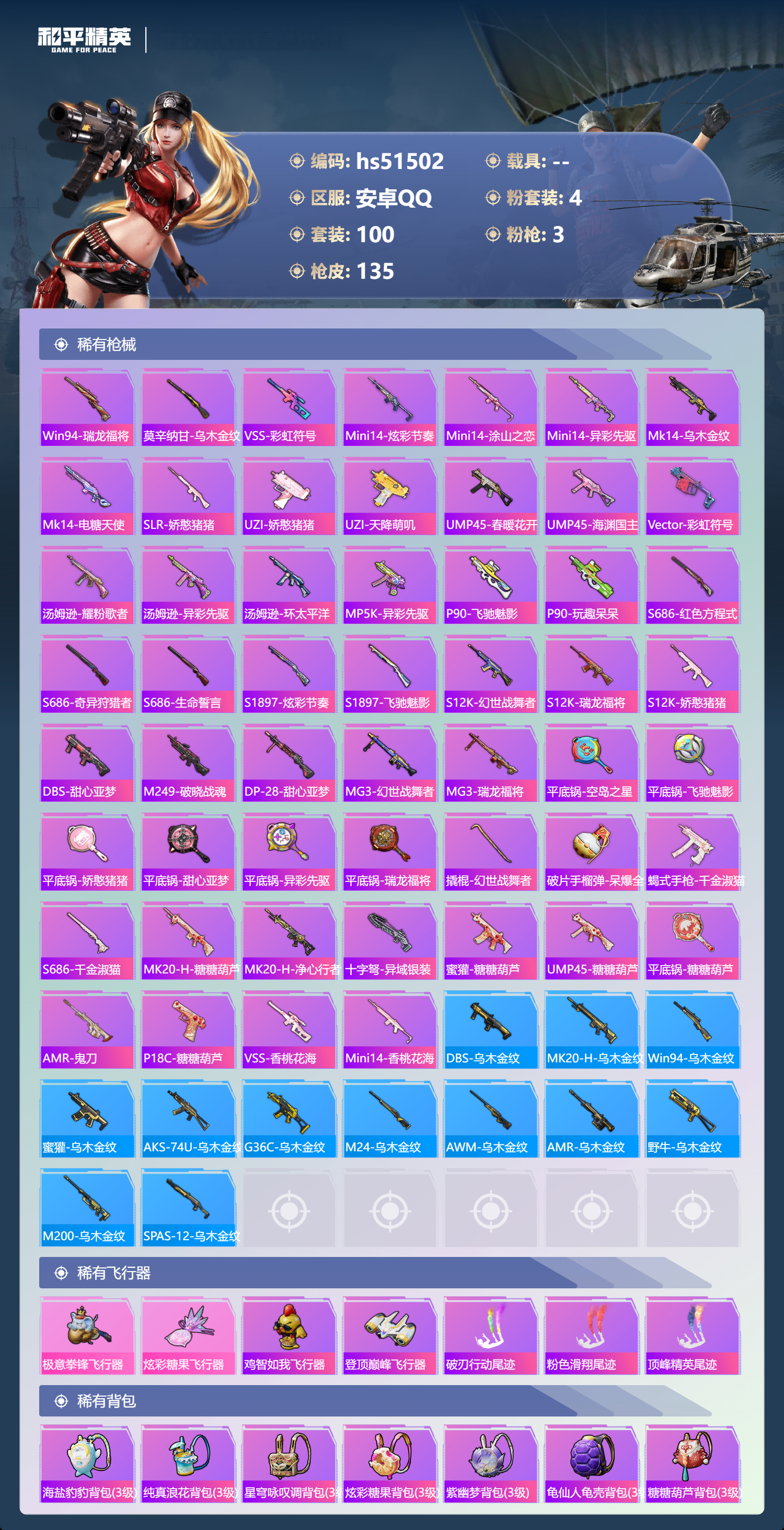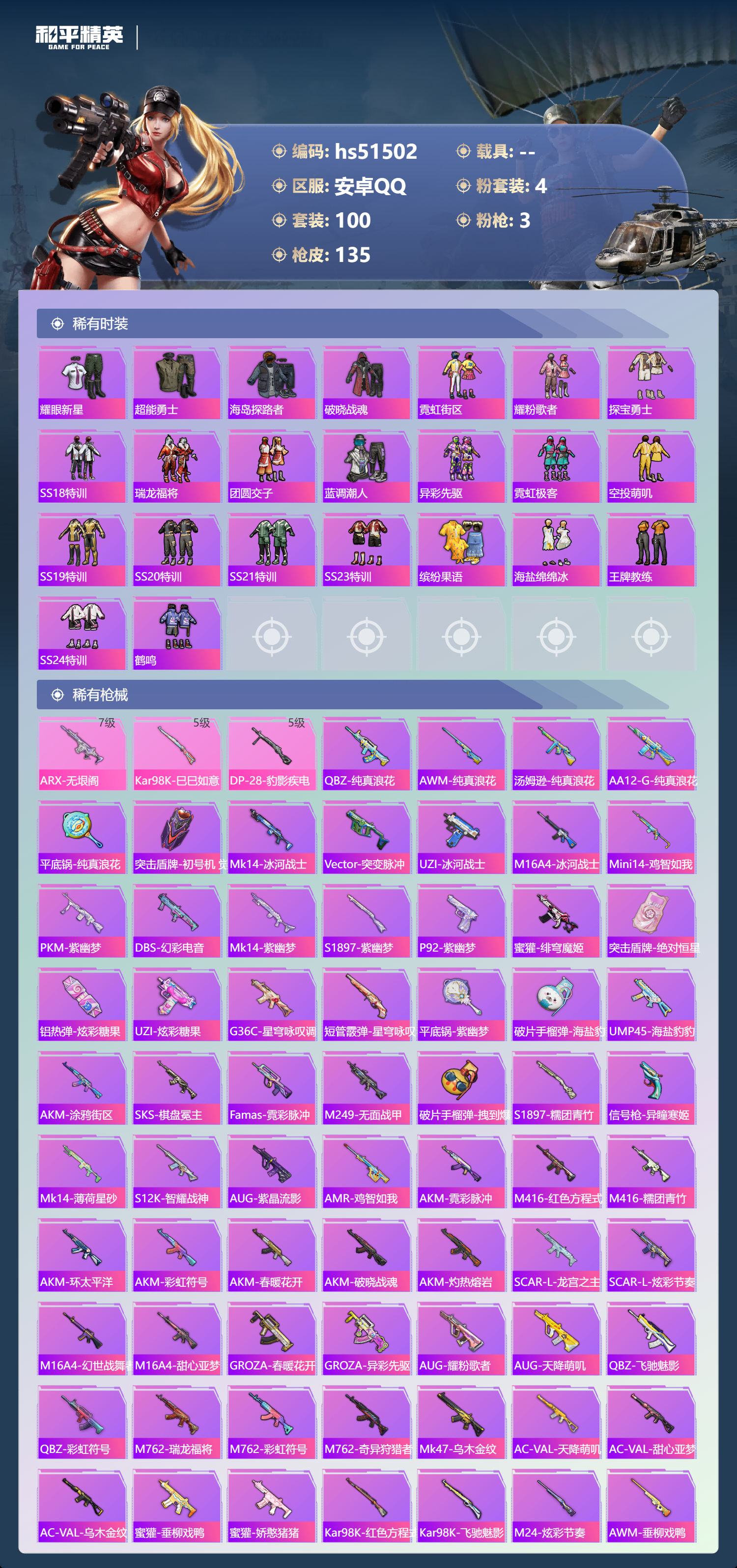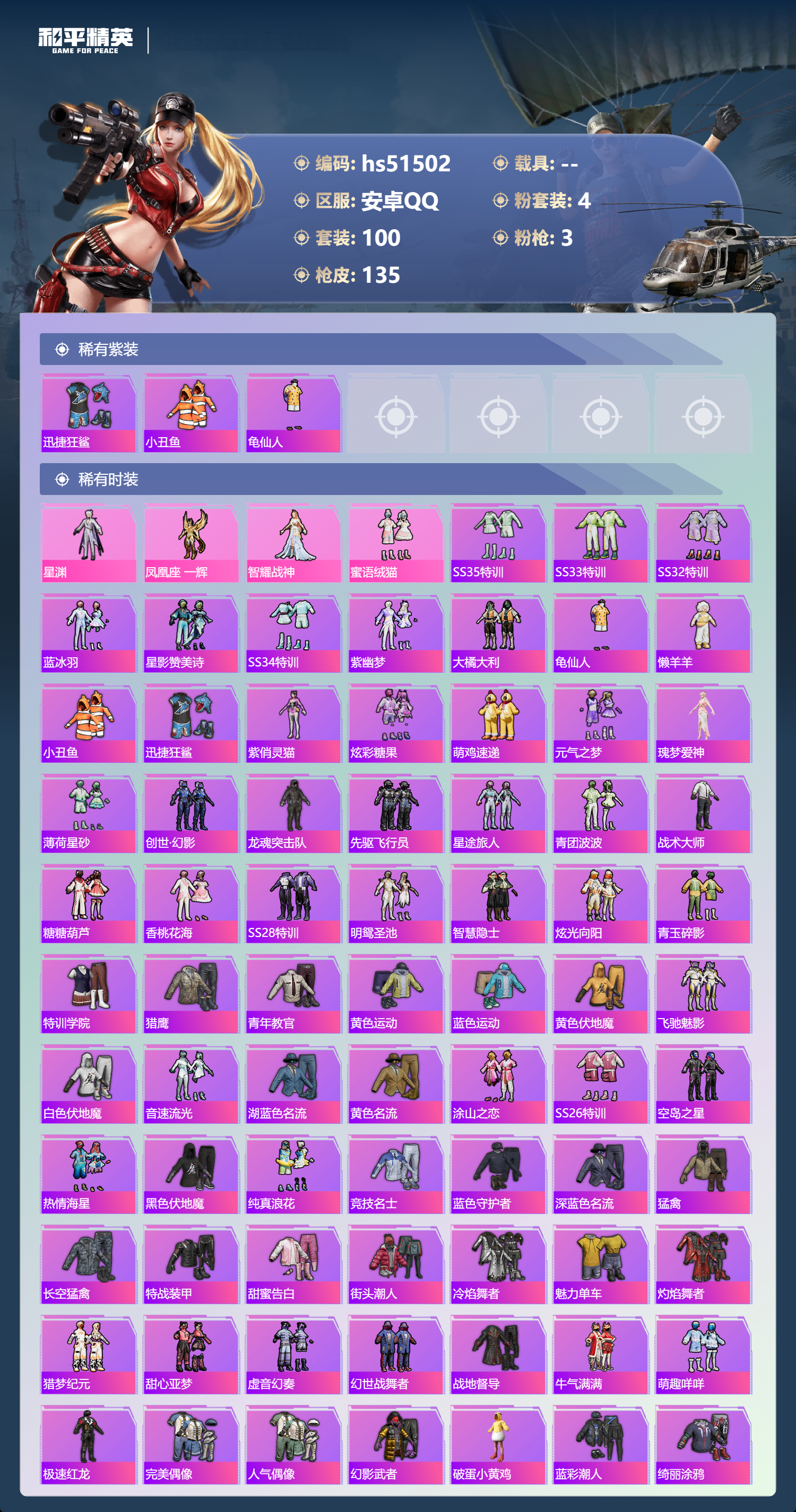 hs51502 安卓手q-2王牌印记-4粉装-3特效呛-38692热力值-100套装-135呛皮【4粉装】角色-凤凰座 一辉角色-星渊角色-智耀战神套装-蜜语绒猫【3特效呛】kar98k-巳巳如意/5级dp-28-豹影疾电/5级arx-无垠阁/7级【3稀有紫装】迅捷狂鲨小丑鱼龟仙人【100稀有时装】星渊凤凰座 一辉智耀战神ss35特训ss33特训ss32特训蓝冰羽