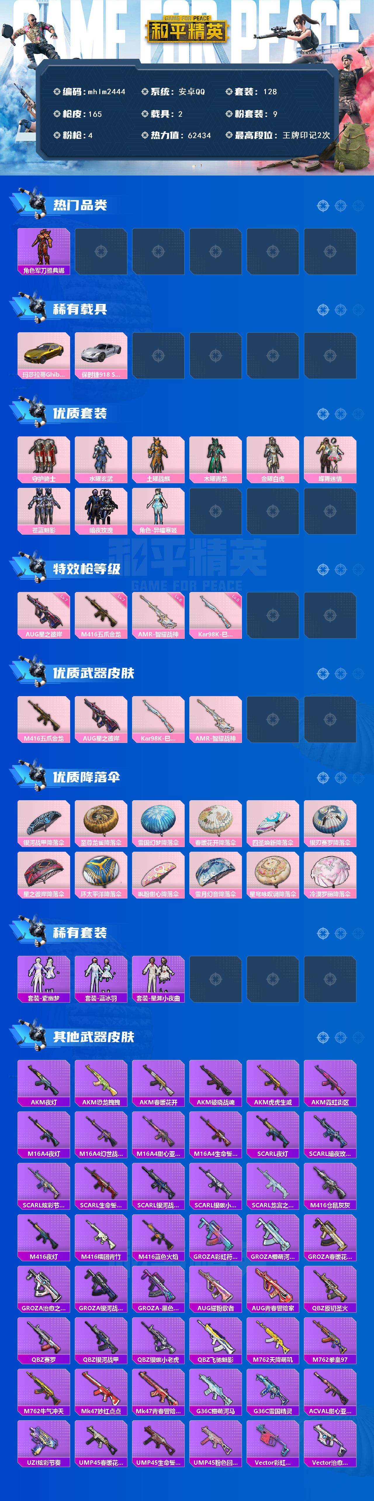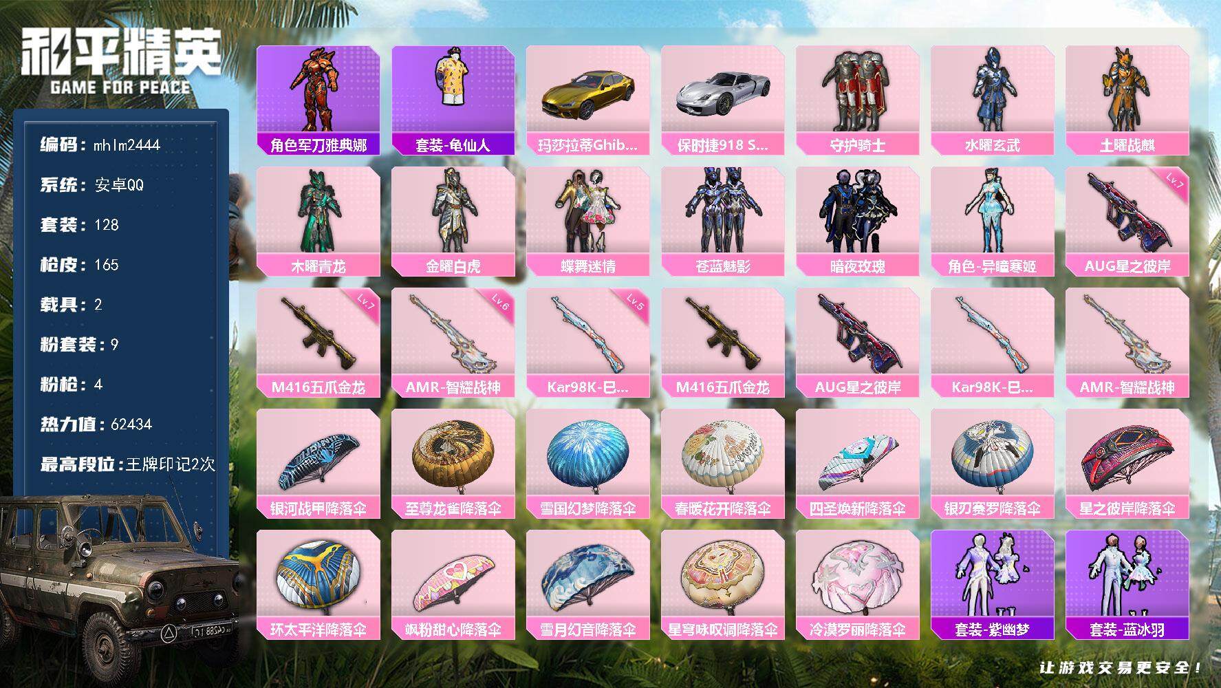 [14240686]【mhlm2444】安卓 手q-9粉装-4特效呛-2载具-1粉色飞行器-62434热力值-2王牌印记-128套装-165呛皮 【热门品类】:角色-军刀雅典娜,套装-龟仙人 【粉色载具】:玛莎拉蒂ghibli(金),保时捷918 sper(液态银) 【粉色套装】:粉装-守护骑士,粉装-水曜玄武,粉装-土曜战麒,粉装-木曜青龙,粉装-金曜白虎,粉装-蝶舞迷情,粉装-苍蓝魅影,粉装-暗夜玫瑰,角色-异瞳寒姬 【粉色呛皮等级】:m416-五爪金龙七级,aug-星之彼岸七级,kar98k-巳巳如意五级,amr-智耀战神六级 【粉色呛皮】:m416-五爪金龙,aug-星之彼岸,kar98k-巳巳如意,amr-智耀战神 【粉色降落伞】:银河战甲降落伞,至尊龙雀降落伞,雪国幻梦降落伞,春暖花开降落伞,四圣焕新降落伞,银刃赛罗降落伞,星之彼岸降落伞,环太平洋降落伞,飒粉甜心降落伞,雪月幻音降落伞,星穹咏叹调降落伞,冷漠罗丽降落伞 【稀有套装】:套装-龟仙人,套装-紫幽梦,套装-蓝冰羽,套装-星渊小夜曲 【稀有呛皮】:akm-夜灯,akm-恐龙拽拽,akm-春暖花开,akm-破晓战魂,akm-虎虎生威,akm-霓虹街区,m16a4-夜灯,m16a4-幻世战舞者,m16a4-甜心亚梦,m16a4-生命誓言,scar-l-夜灯,scar-l-暗夜玫瑰,scar-l-炫彩节奏,scar-l-生命誓言,scar-l-银河战甲,scar-l-银碳小老虎,scar-l-龙宫之主,m416-仓鼠灰灰,m416-夜灯,m416-糯团青竹,m416-蓝色火焰,groza-彩虹符号,groza-懵萌河马,groza-春暖花开,groza-治愈之星,groza-银河战甲,groza-黑色刀锋,aug-耀粉歌者,aug-青春冒险家,q-原初圣火,q-赛罗,q-银河战甲,q-银碳小老虎,q-飞驰魅影,m762-天降萌叽,m762-拳皇97,m762-牛气冲天,mk47-妙红点点,mk47-青春冒险家,g36c-懵萌河马,g36c-雪国精灵,ac-val-甜心亚梦,uzi-炫彩节奏,ump45-春暖花开,ump45-生命誓言,ump45-粉色回忆,vect-彩虹符号,vect-治愈之星,vect-银河战甲,vect-黑色刀锋,汤姆逊-天降萌叽,汤姆逊-环太