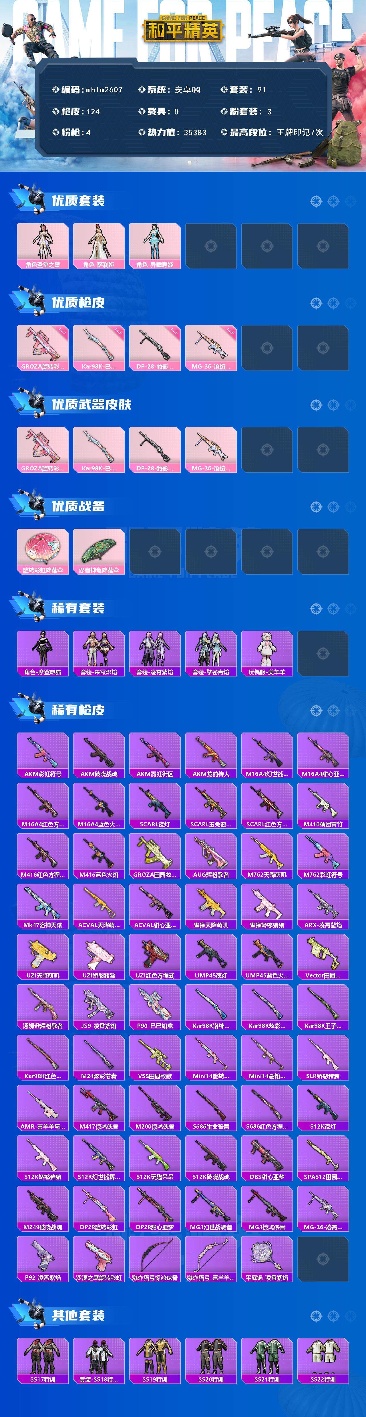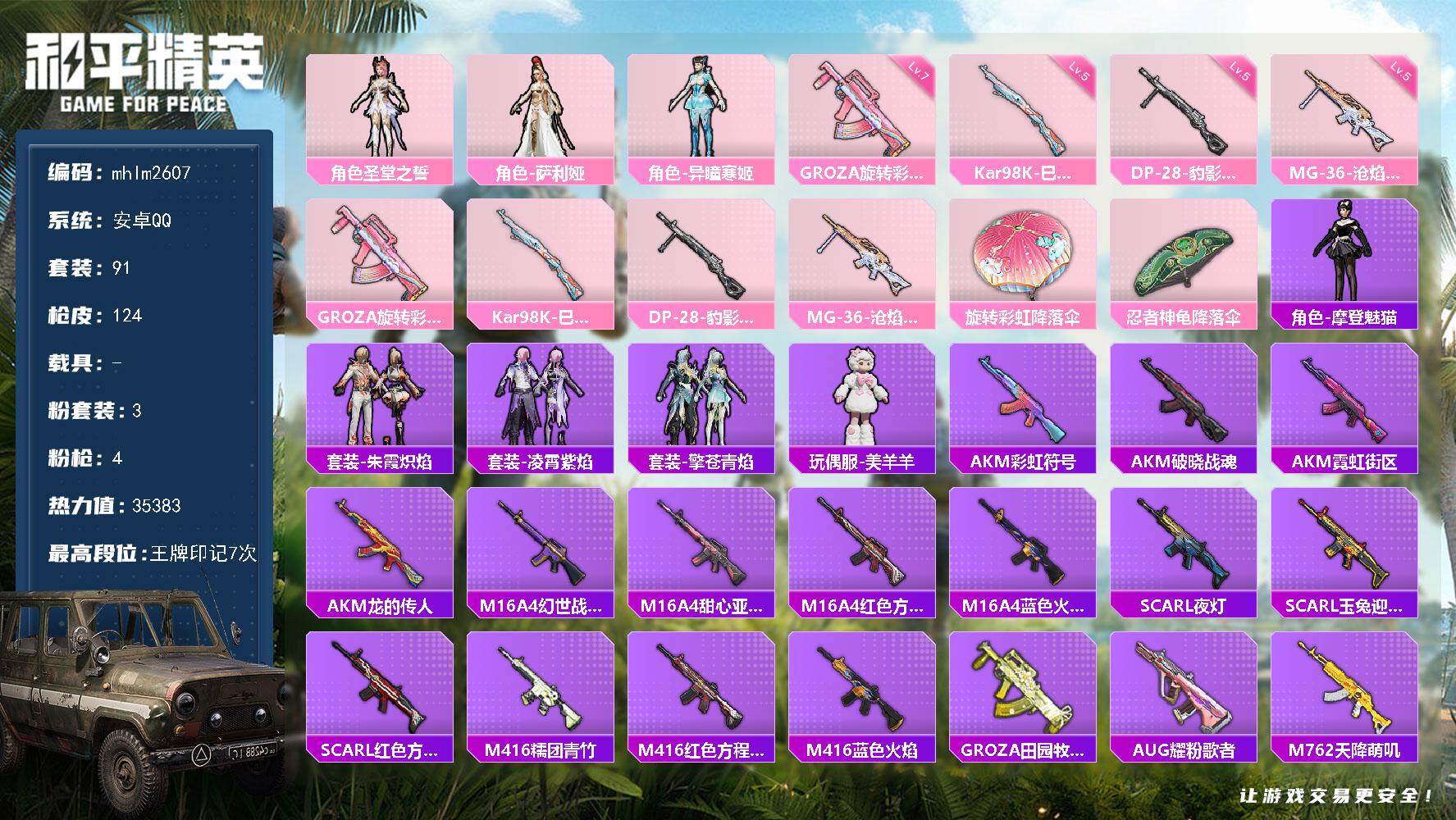 [14504563]【mhlm2607】安卓 手q-3粉装-4特效呛-0载具-1粉色飞行器-35383热力值-7王牌印记-91套装-124呛皮 【粉色套装】:角色-圣堂之誓,角色-萨利娅,角色-异瞳寒姬 【粉色呛皮等级】:groza-旋转彩虹七级,kar98k-巳巳如意五级,dp-28-豹影疾电五级,mg-36-沧焰双生五级 【粉色呛皮】:groza-旋转彩虹,kar98k-巳巳如意,dp-28-豹影疾电,mg-36-沧焰双生 【粉色降落伞】:旋转彩虹降落伞,忍者神龟降落伞 【稀有套装】:角色-摩登魅猫,套装-朱霞炽焰,套装-凌霄紫焰,套装-擎苍青焰,玩偶服-美羊羊 【稀有呛皮】:akm-彩虹符号,akm-破晓战魂,akm-霓虹街区,akm-龙的传人,m16a4-幻世战舞者,m16a4-甜心亚梦,m16a4-红色方程式,m16a4-蓝色火焰,scar-l-夜灯,scar-l-玉兔迎春,scar-l-红色方程式,m416-糯团青竹,m416-红色方程式,m416-蓝色火焰,groza-田园牧歌,aug-耀粉歌者,m762-天降萌叽,m762-彩虹符号,mk47-洛神天依,ac-val-天降萌叽,ac-val-甜心亚梦,蜜獾-天降萌叽,蜜獾-娇憨猪猪,arx-凌霄紫焰,uzi-天降萌叽,uzi-娇憨猪猪,uzi-红色方程式,ump45-夜灯,ump45-蓝色火焰,vect-田园牧歌,汤姆逊-耀粉歌者,js9-凌霄紫焰,p90-巳巳如意,kar98k-洛神天依,kar98k-炫彩节奏,kar98k-王子的夏天,kar98k-红色方程式,m24-炫彩节奏,vss-田园牧歌,mini14-旋转彩虹,mini14-耀粉歌者,slr-娇憨猪猪,amr-喜羊羊与灰太狼,m417-惊鸿侠骨,m200-惊鸿侠骨,s686-生命誓言,s686-红色方程式,s12k-玩趣呆呆,s12k-破晓战魂,s12k-夜灯,s12k-娇憨猪猪,s12k-幻世战舞者,dbs-甜心亚梦,spas-12-田园牧歌,m249-破晓战魂,dp-28-旋转彩虹,dp-28-甜心亚梦,mg3-幻世战舞者,mg3-惊鸿侠骨,mg-36-凌霄紫焰,p92-凌霄紫焰,沙墨之鹦-旋转彩虹,爆炸猎弓-惊鸿侠骨,爆炸猎弓-喜羊羊与灰太狼,平底锅-凌霄紫焰 【其他套装】:套装-ss17特训,套装-ss18特训,套装-ss19特