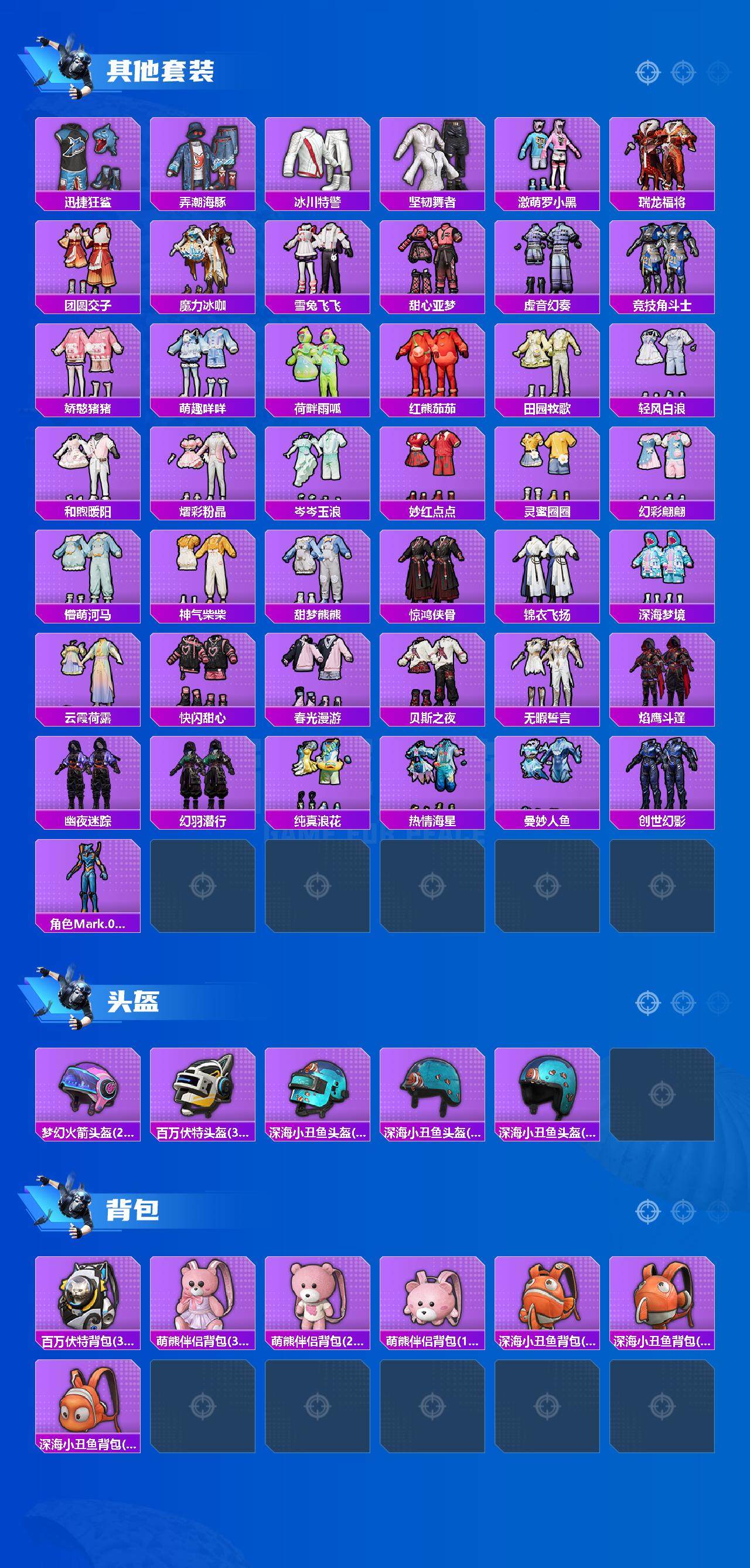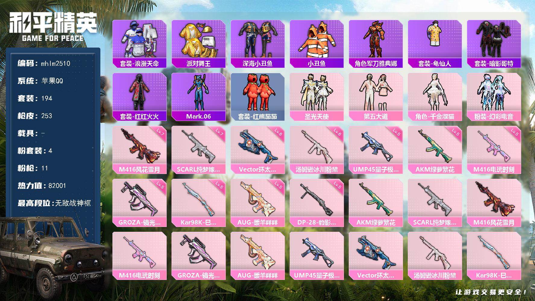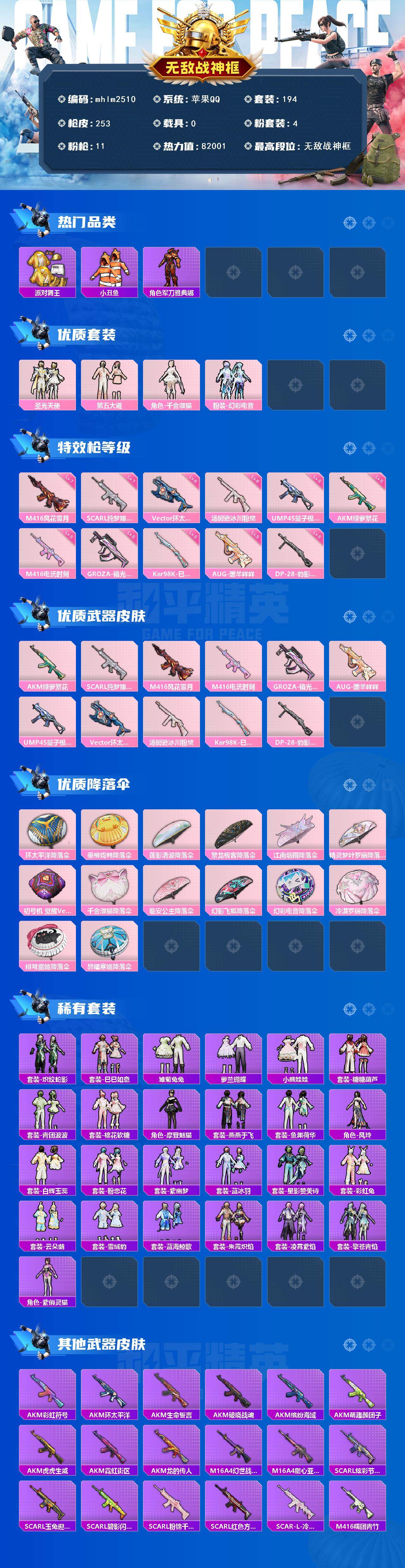 [14348546]【mhlm2510】苹果 手q-无敌战神框-4粉装-11特效呛-0载具-2粉色飞行器-82001热力值-17王牌印记-194套装-253呛皮 【热门品类】:套装-浪漫天命,套装-派对舞王,套装-深海小丑鱼,套装-小丑鱼,角色-军刀雅典娜,套装-龟仙人,套装-暗影哥特,套装-红红火火,角色-mark.06,套装-红熊茄茄 【粉色套装】:粉装-圣光天使,粉装-第五大道,角色-千金淑猫,粉装-幻彩电音 【粉色呛皮等级】:akm-绿萝繁花五级,scar-l-纯梦嫁纱七级,m416-风花雪月七级,m416-电玩时刻五级,groza-镜光银凌五级,aug-暖羊咩咩五级,ump45-量子极限五级,vect-环太平洋六级,汤姆逊-冰川粉黛六级,kar98k-巳巳如意五级,dp-28-豹影疾电五级 【粉色呛皮】:akm-绿萝繁花,scar-l-纯梦嫁纱,m416-风花雪月,m416-电玩时刻,groza-镜光银凌,aug-暖羊咩咩,ump45-量子极限,vect-环太平洋,汤姆逊-冰川粉黛,kar98k-巳巳如意,dp-28-豹影疾电 【粉色降落伞】:环太平洋降落伞,垂柳戏鸭降落伞,莲影清波降落伞,繁龙极客降落伞,江南烟雨降落伞,精灵梦叶罗丽降落伞,初号机 觉醒ver.降落伞,千金淑猫降落伞,临安公主降落伞,幻影飞狐降落伞,幻彩电音降落伞,冷漠罗丽降落伞,绯穹魔姬降落伞,异瞳寒姬降落伞 【稀有套装】:套装-龟仙人,套装-炽纹蛇影,套装-巳巳如意,套装-雏菊兔兔,套装-萝兰蝴蝶,套装-小熊娃娃,套装-糖糖葫芦,套装-青团波波,套装-棉花软糖,角色-摩登魅猫,套装-燕燕于飞,套装-鱼渊荷华,角色-风玲,套装-白辉玉蕊,套装-粉恋花,套装-紫幽梦,套装-蓝冰羽,套装-星影赞美诗,套装-彩虹兔,套装-云朵鹅,套装-雪绒豹,套装-蓝海鲸歌,套装-朱霞炽焰,套装-凌霄紫焰,套装-擎苍青焰,角色-紫俏灵猫,套装-炫彩糖果 【稀有呛皮】:akm-彩虹符号,akm-环太平洋,akm-生命誓言,akm-破晓战魂,akm-缤纷海域,akm-萌趣颜团子,akm-虎虎生威,akm-霓虹街区,akm-龙的传人,m16a4-幻世战舞者,m16a4-甜心亚梦,scar-l-炫彩节奏,scar-l-玉兔迎春,scar-l-碧影闪光,scar-l-粉锦千层,scar