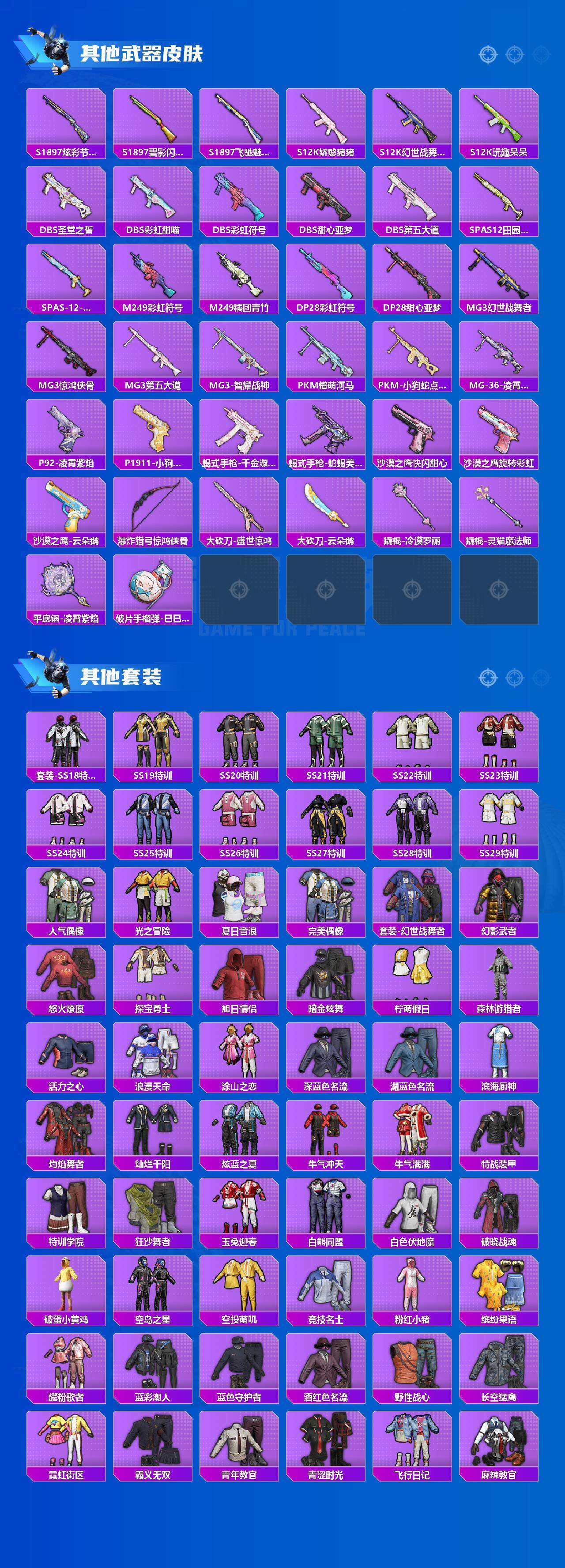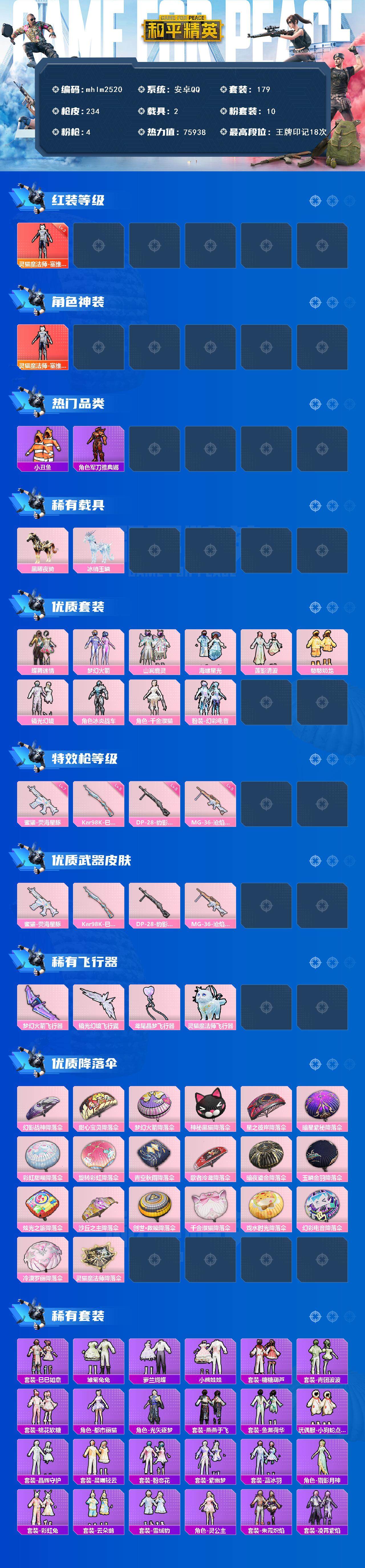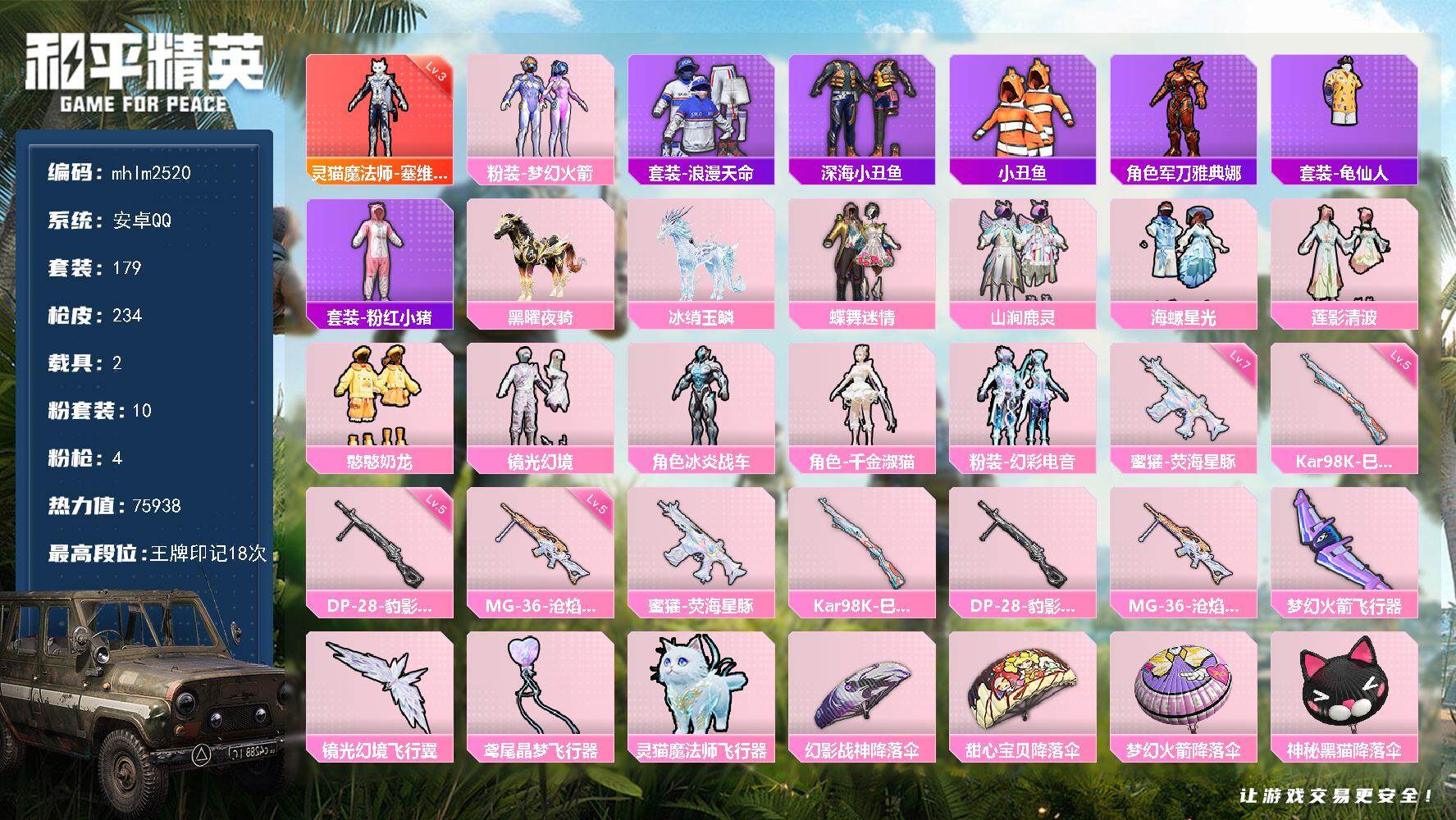[14349442]【mhlm2520】安卓 手q-1神装-10粉装-4特效呛-2载具-5粉色飞行器-75938热力值-18王牌印记-179套装-234呛皮 【红色神装等级】:灵猫魔法师-塞维尔三级 【红色角色神装】:灵猫魔法师-塞维尔 【热门品类】:粉装-梦幻火箭,套装-浪漫天命,套装-深海小丑鱼,套装-小丑鱼,角色-军刀雅典娜,套装-龟仙人,套装-粉红小猪 【粉色载具】:黑曜夜骑,冰绡玉鳞 【粉色套装】:粉装-蝶舞迷情,粉装-梦幻火箭,粉装-山涧鹿灵,粉装-海螺星光,粉装-莲影清波,粉装-憨憨奶龙,粉装-镜光幻境,角色-冰炎战车,角色-千金淑猫,粉装-幻彩电音 【粉色呛皮等级】:蜜獾-荧海星豚七级,kar98k-巳巳如意五级,dp-28-豹影疾电五级,mg-36-沧焰双生五级 【粉色呛皮】:蜜獾-荧海星豚,kar98k-巳巳如意,dp-28-豹影疾电,mg-36-沧焰双生 【粉色飞行器】:梦幻火箭飞行器,镜光幻境飞行翼,鸢尾晶梦飞行器,灵猫魔法师飞行器 【粉色降落伞】:幻影战神降落伞,甜心宝贝降落伞,梦幻火箭降落伞,神秘黑猫降落伞,星之彼岸降落伞,暗星紫秘降落伞,彩虹甜喵降落伞,旋转彩虹降落伞,青空秋雨降落伞,歌者泠鸢降落伞,暗夜鎏金降落伞,玉鳞金羽降落伞,炫光之旅降落伞,沙丘之主降落伞,创世·救赎降落伞,千金淑猫降落伞,戏水时光降落伞,幻彩电音降落伞,冷漠罗丽降落伞,灵猫魔法师降落伞 【稀有套装】:套装-龟仙人,套装-巳巳如意,套装-雏菊兔兔,套装-萝兰蝴蝶,套装-小熊娃娃,套装-糖糖葫芦,套装-青团波波,套装-棉花软糖,角色-都市丽猫,角色-光矢逐梦,套装-燕燕于飞,套装-鱼渊荷华,玩偶服-小狗蛇点点,套装-晶辉守护,套装-晨曦轻云,套装-粉恋花,套装-紫幽梦,套装-蓝冰羽,角色-猎影月神,套装-彩虹兔,套装-云朵鹅,套装-雪绒豹,角色-灵公主,套装-朱霞炽焰,套装-凌霄紫焰,套装-擎苍青焰,玩偶服-懒羊羊,玩偶服-喜羊羊 【稀有呛皮】:akm-奇异狩猎者,akm-影袭,akm-破晓战魂,akm-缤纷海域,akm-霓虹街区,akm-龙的传人,akm-灵猫魔法师,m16a4-幻世战舞者,m16a4-甜心亚梦,m16a4-千金淑猫,scar-l-玉兔迎春,scar-l-红色方程式,scar-l-绯月迷踪,scar-l-小狗蛇点点,m416-暗夜行者,m416-