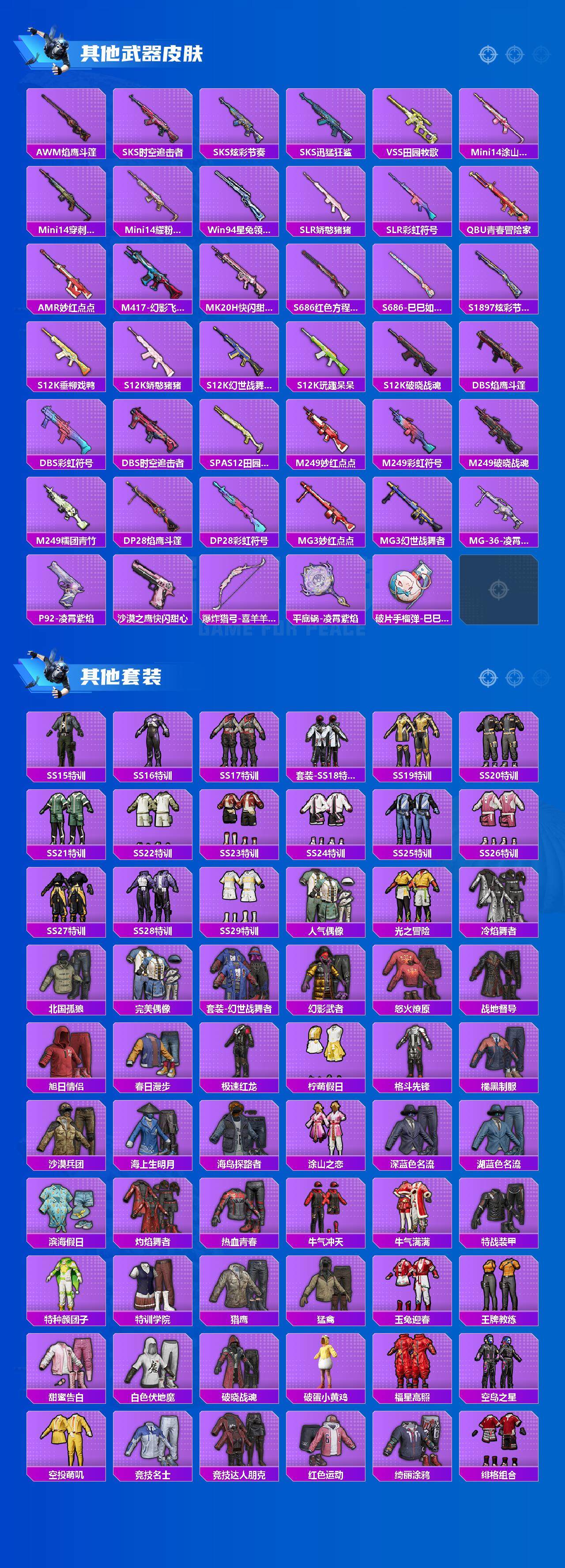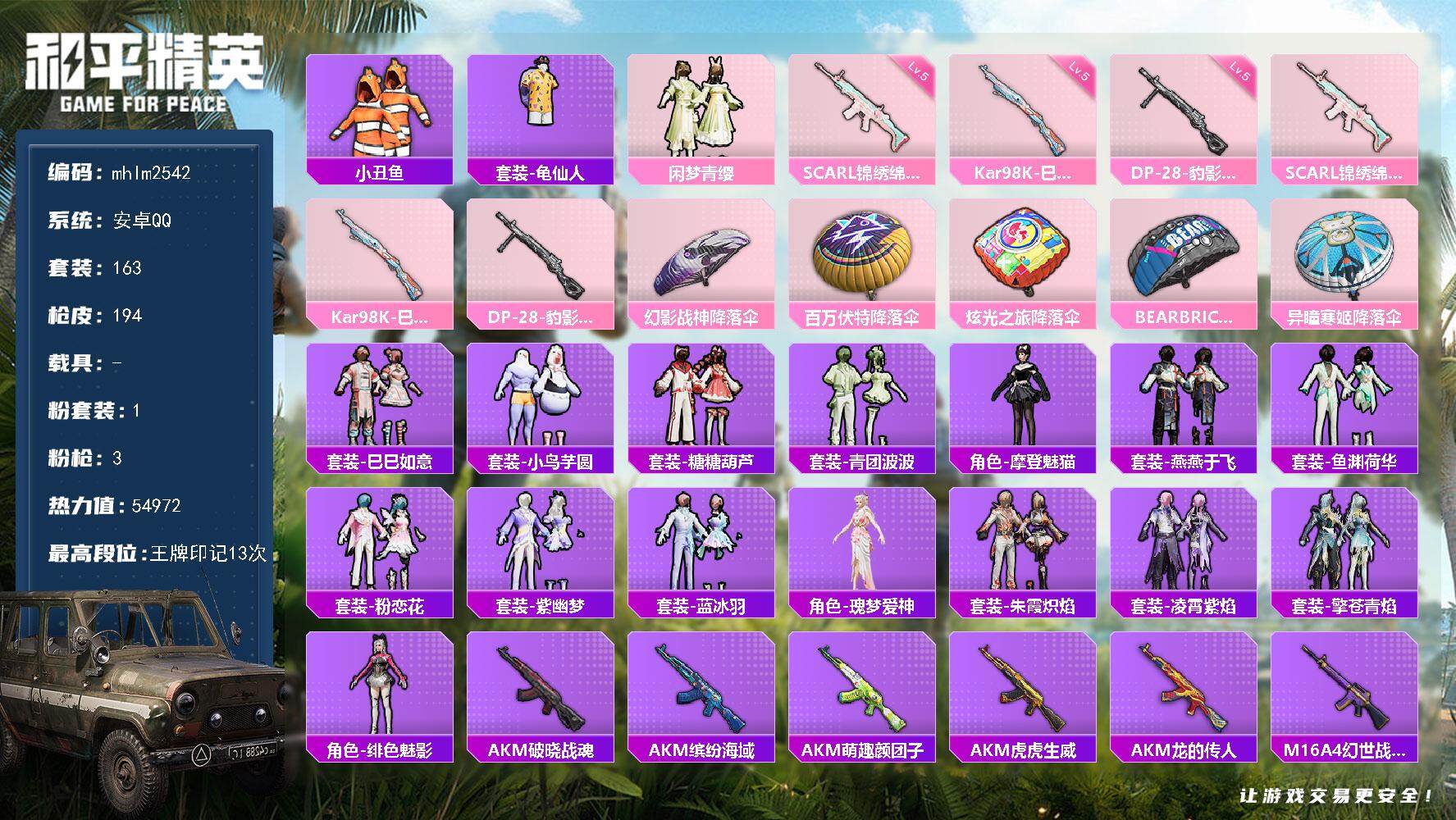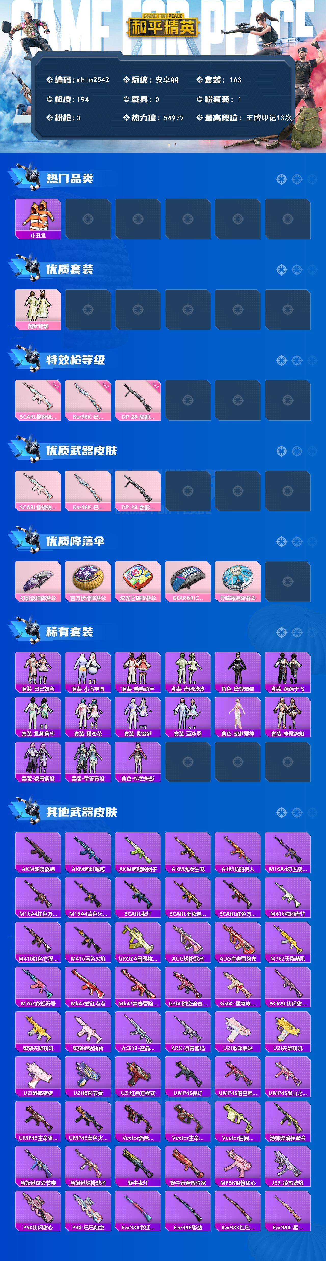 [14447105]【mhlm2542】安卓 手q-1粉装-3特效呛-0载具-2粉色飞行器-54972热力值-13王牌印记-163套装-194呛皮 【热门品类】:套装-小丑鱼,套装-龟仙人 【粉色套装】:粉装-闲梦青缨 【粉色呛皮等级】:scar-l-锦绣绵绵五级,kar98k-巳巳如意五级,dp-28-豹影疾电五级 【粉色呛皮】:scar-l-锦绣绵绵,kar98k-巳巳如意,dp-28-豹影疾电 【粉色降落伞】:幻影战神降落伞,百万伏特降落伞,炫光之旅降落伞,bearbrick降落伞,异瞳寒姬降落伞 【稀有套装】:套装-龟仙人,套装-巳巳如意,套装-小鸟芋圆,套装-糖糖葫芦,套装-青团波波,角色-摩登魅猫,套装-燕燕于飞,套装-鱼渊荷华,套装-粉恋花,套装-紫幽梦,套装-蓝冰羽,角色-瑰梦爱神,套装-朱霞炽焰,套装-凌霄紫焰,套装-擎苍青焰,角色-绯色魅影 【稀有呛皮】:akm-破晓战魂,akm-缤纷海域,akm-萌趣颜团子,akm-虎虎生威,akm-龙的传人,m16a4-幻世战舞者,m16a4-红色方程式,m16a4-蓝色火焰,scar-l-夜灯,scar-l-玉兔迎春,scar-l-红色方程式,m416-糯团青竹,m416-红色方程式,m416-蓝色火焰,groza-田园牧歌,aug-耀粉歌者,aug-青春冒险家,m762-天降萌叽,m762-彩虹符号,mk47-妙红点点,mk47-青春冒险家,g36c-时空追击者,g36c-星穹咏叹调,ac-val-快闪甜心,蜜獾-天降萌叽,蜜獾-娇憨猪猪,ace32-蓝晶绮麟,arx-凌霄紫焰,uzi-啾咪啾咪,uzi-天降萌叽,uzi-娇憨猪猪,uzi-炫彩节奏,uzi-红色方程式,ump45-夜灯,ump45-时空追击者,ump45-涂山之恋,ump45-生命誓言,ump45-蓝色火焰,vect-焰鹰斗篷,vect-生命誓言,vect-田园牧歌,汤姆逊-暗夜鎏金,汤姆逊-炫彩节奏,汤姆逊-耀粉歌者,野牛-夜灯,野牛-青春冒险家,mp5k-飒粉甜心,js9-凌霄紫焰,p90-快闪甜心,p90-巳巳如意,kar98k-彩虹符号,kar98k-影袭,kar98k-红色方程式,kar98k-星穹咏叹调,awm-焰鹰斗篷,sks-时空追击者,sks-炫彩节奏,sks-迅猛狂鲨,vss-田园牧歌,mini14-涂山之恋,m