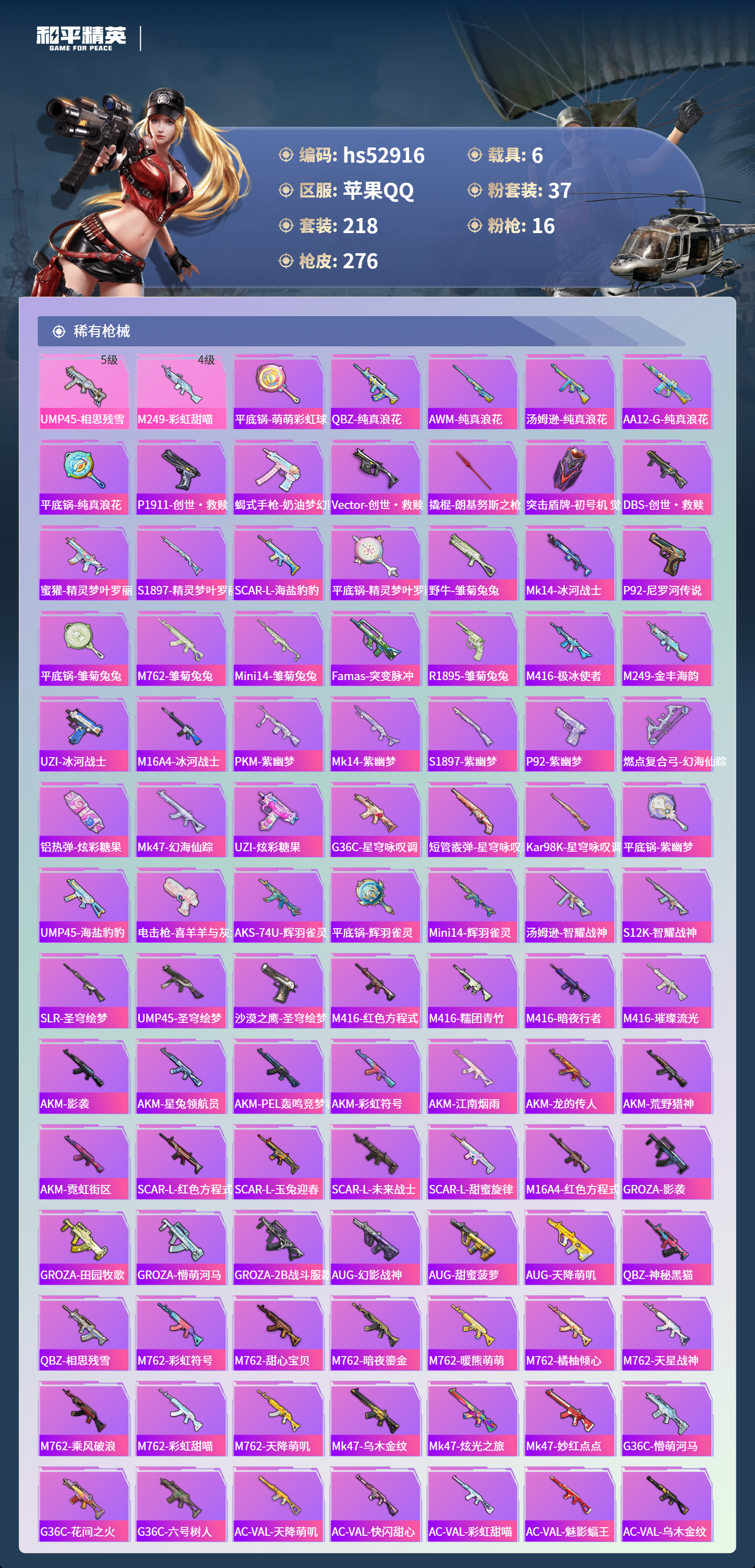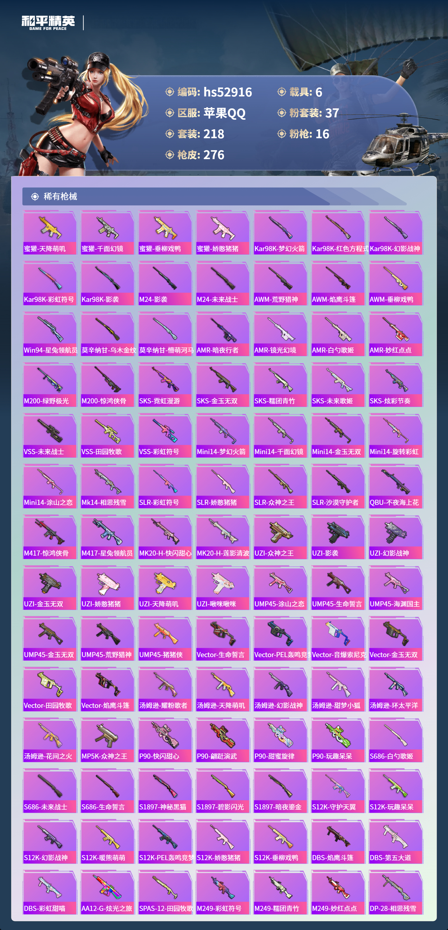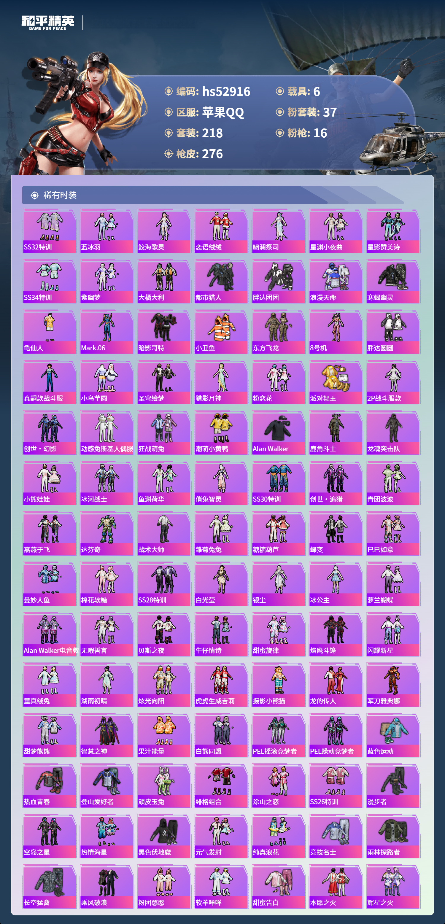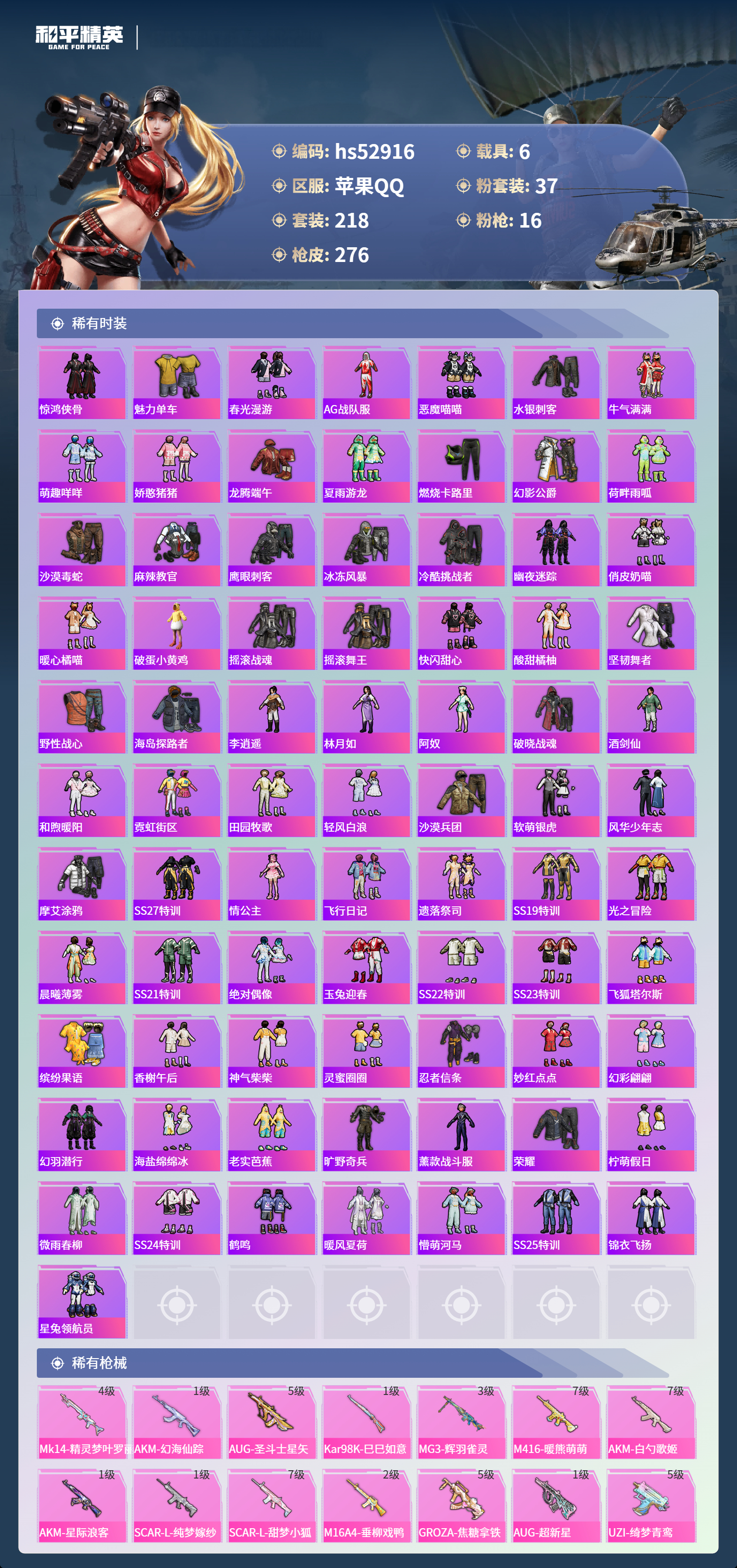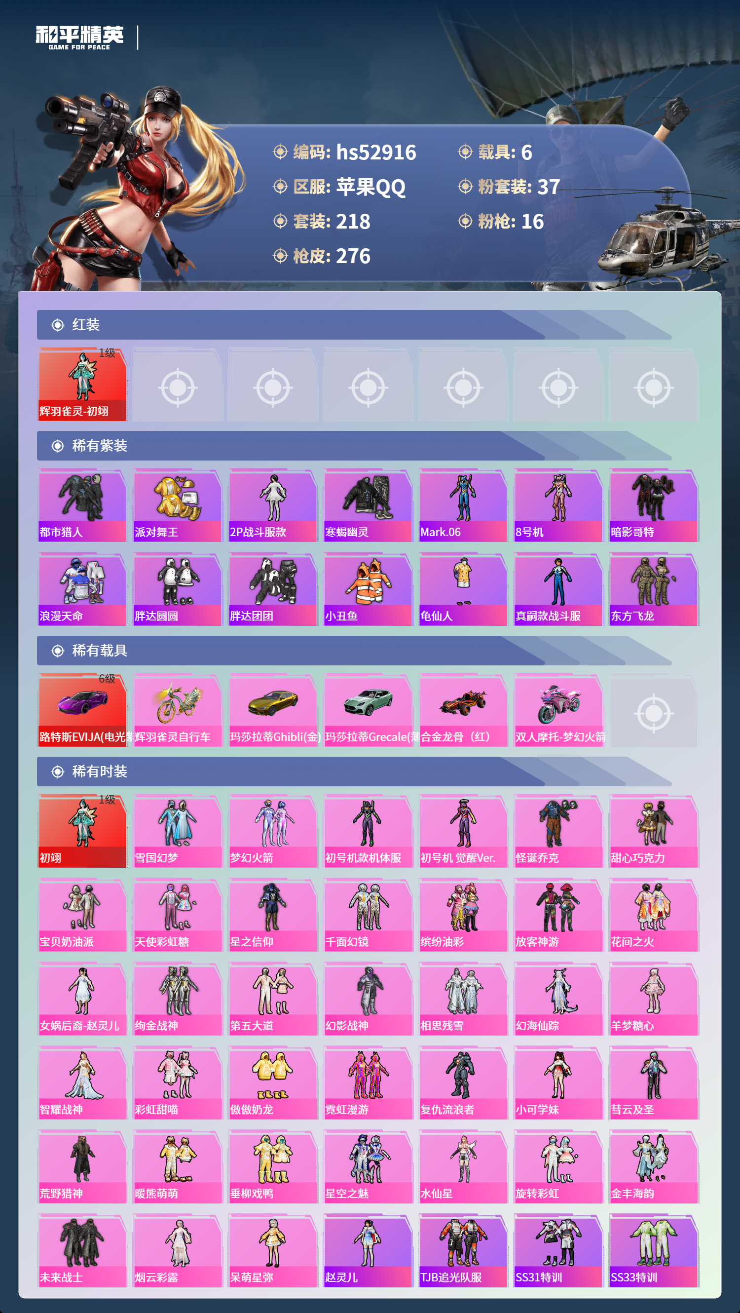 hs52916 苹果手q-12王牌印记-1红装-37粉装-16特效呛-6载具-热力值-218套装-276呛皮-2卓越印记【1红装】辉羽雀灵-初翊/1级【37粉装】套装-千面幻镜角色-羊梦糖心套装-绚金战神套装-怪诞乔克套装-梦幻火箭套装-天使彩虹糖套装-花间之火套装-星空之魅套装-缤纷油彩角色-复仇流浪者套装-垂柳戏鸭套装-霓虹漫游套装-彗云及圣角色-烟云